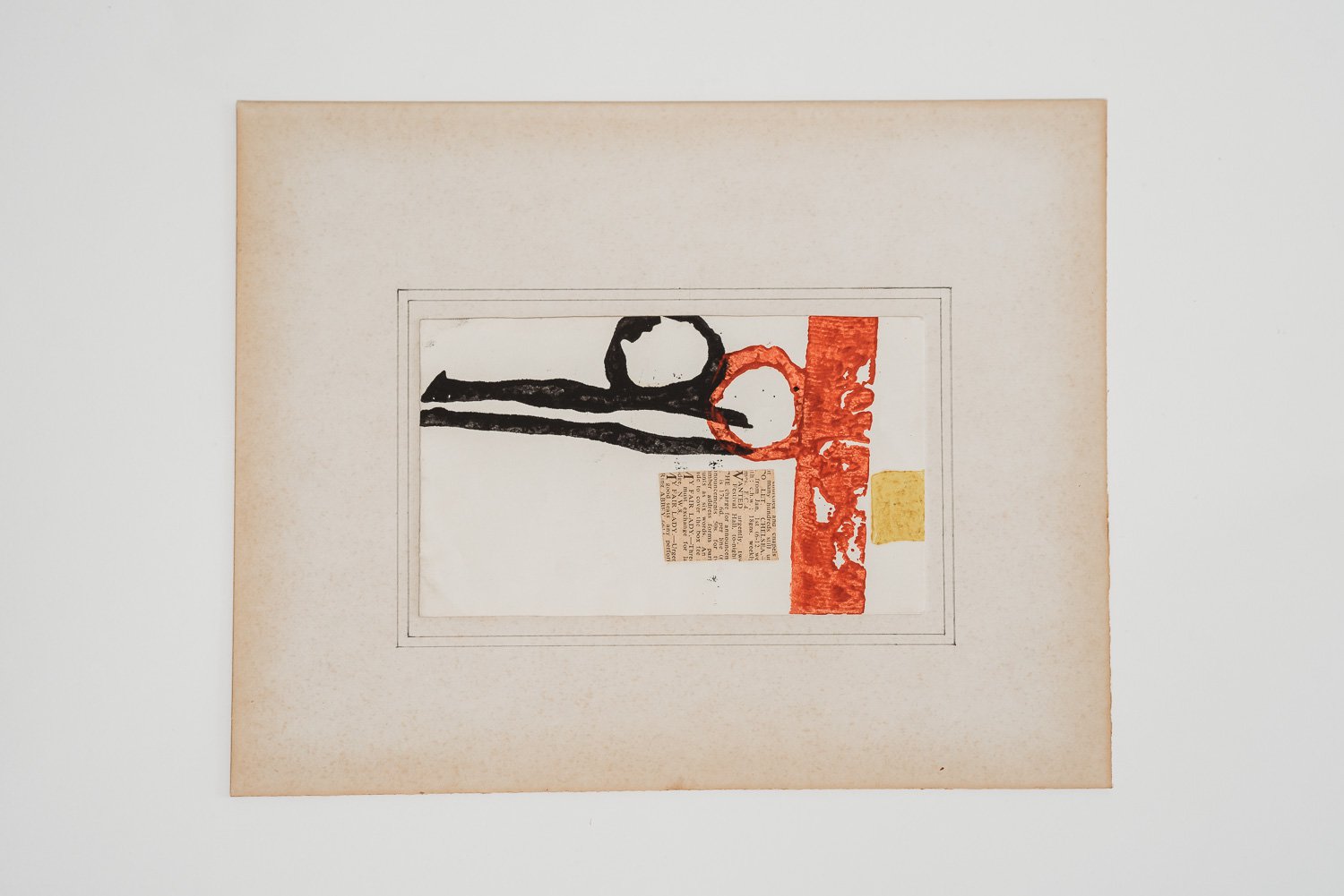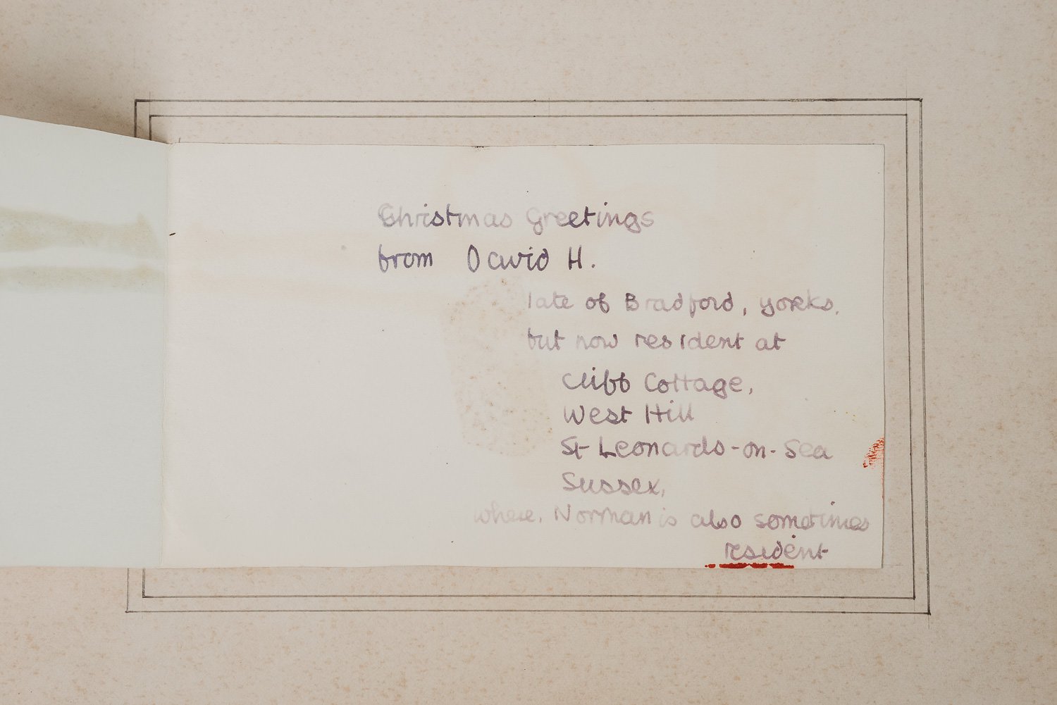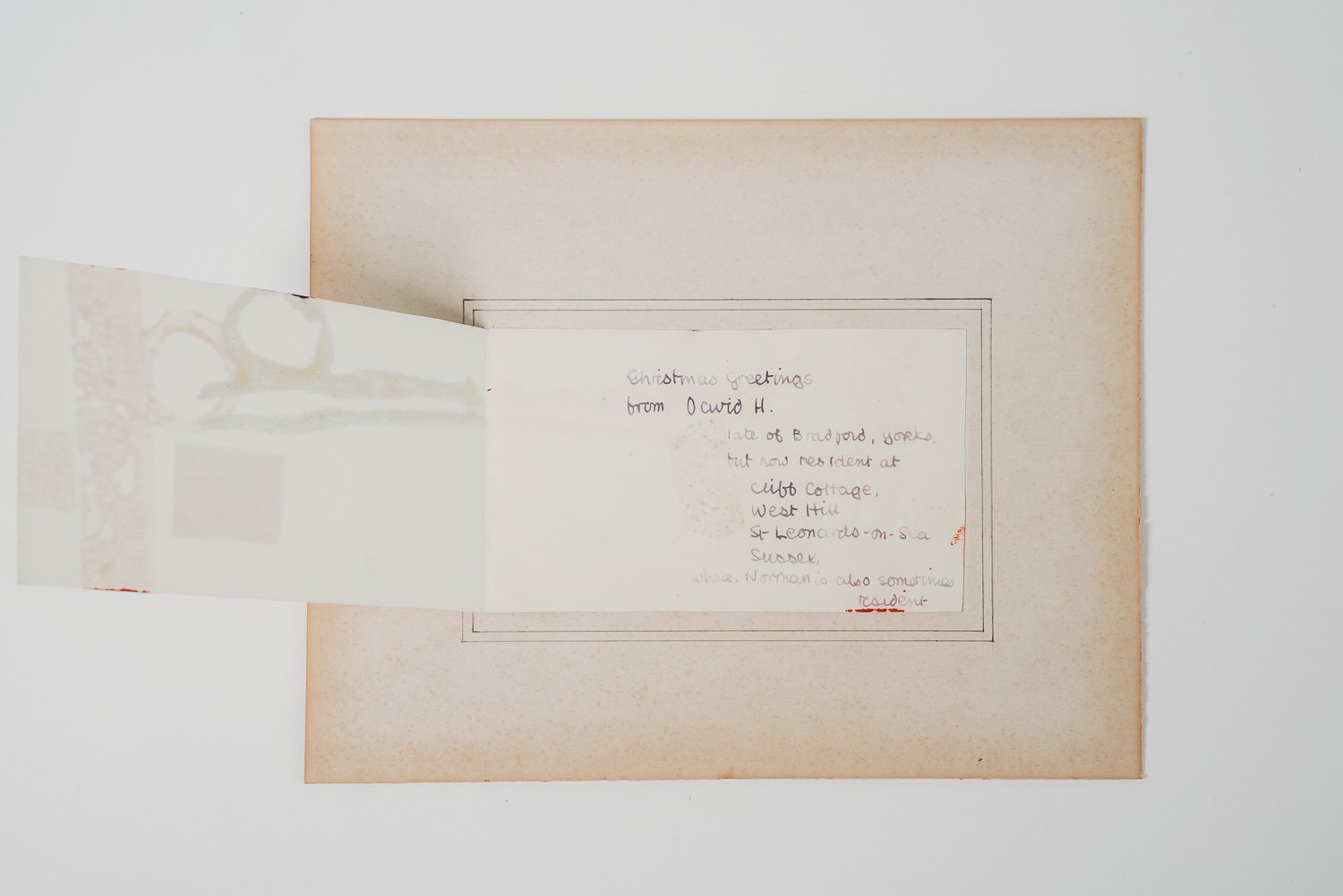 David Hockney. A unique Card made by David Hockney wood block with colours of red black and yellow in the form of a Phallus Symbol with an applied paper cutting relating to Theatre Performances My Fair Lady and reference to Chelsea. The reverse hand written by David Hockney Christmas Greetings from David H late of Bradford yorks but now resident at cliff cottage st Leonards-on Sea Sussex where Norman is also sometimes resident including a David Hockney finger print. Provenance: The Christmas Card sent to the Vendor Mr Peter Richards Christmas mid 1950s Size of card 15cmx9cm 6inch x 3.5 inch