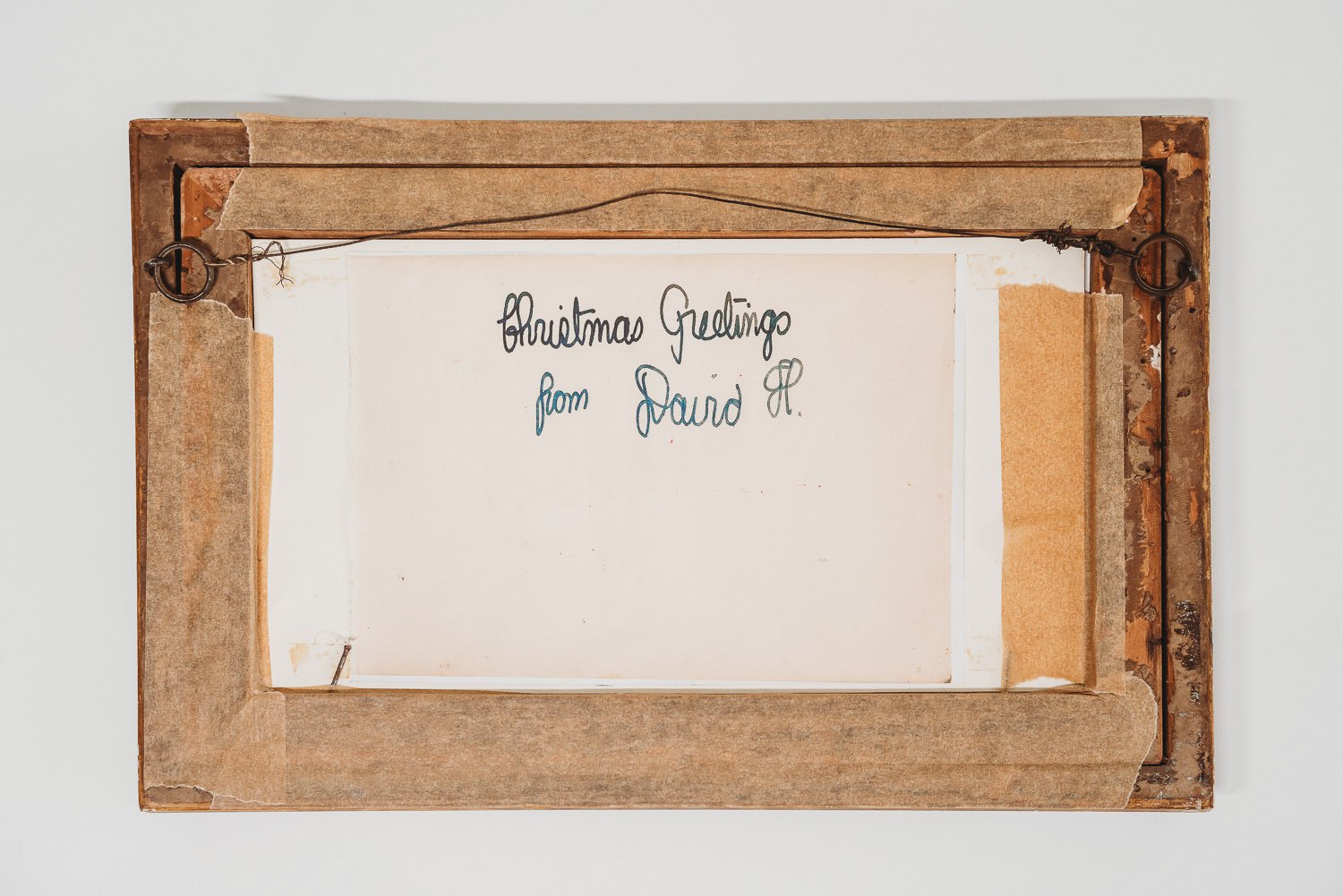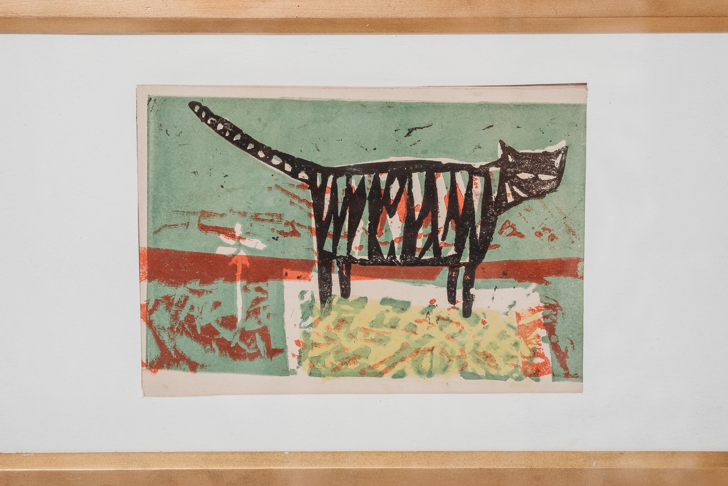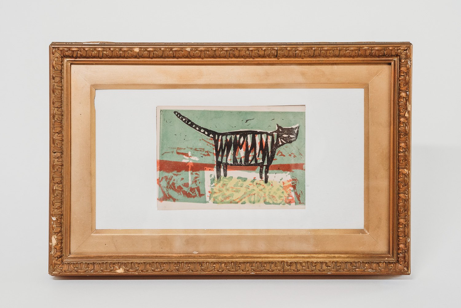 David Hockney b1937. A unique coloured woodblock and hand painted card of the black and white cat with back ground colours of green red. The cat standing on a yellow patterned base. Made by David Hockney circa 1956-57 The reverse with the hand written inscription Christmas Greetings from David H. Provenance:The card given to the Vendor Mr Peter Richards, There is a letter letter from David Hockney dated 7/8/56 David Hockney sort my drawings out I'll send you one mounted signed Yours Thankfully David Hockney. Size 10x15cm. Frame size 36x 23cm