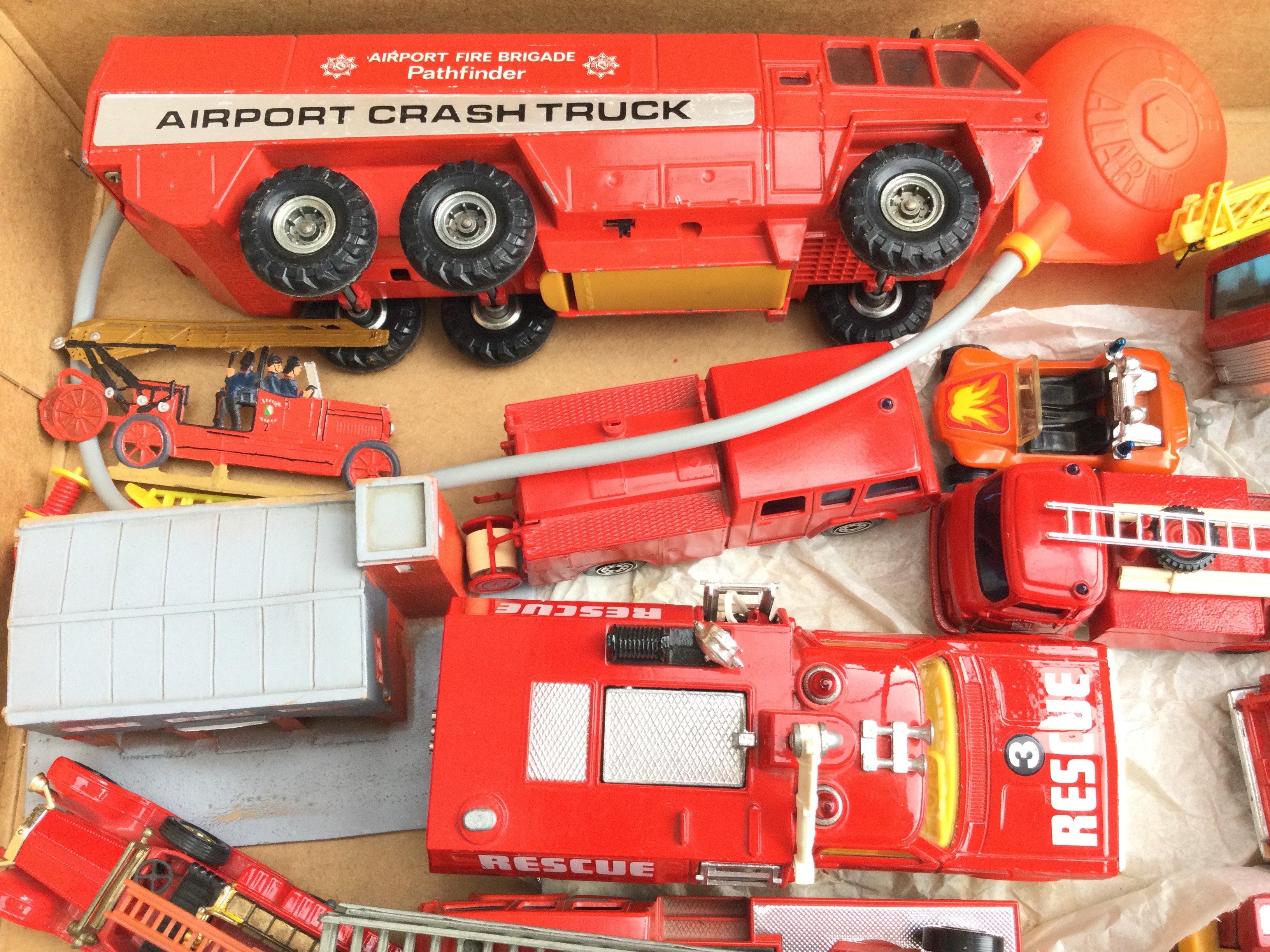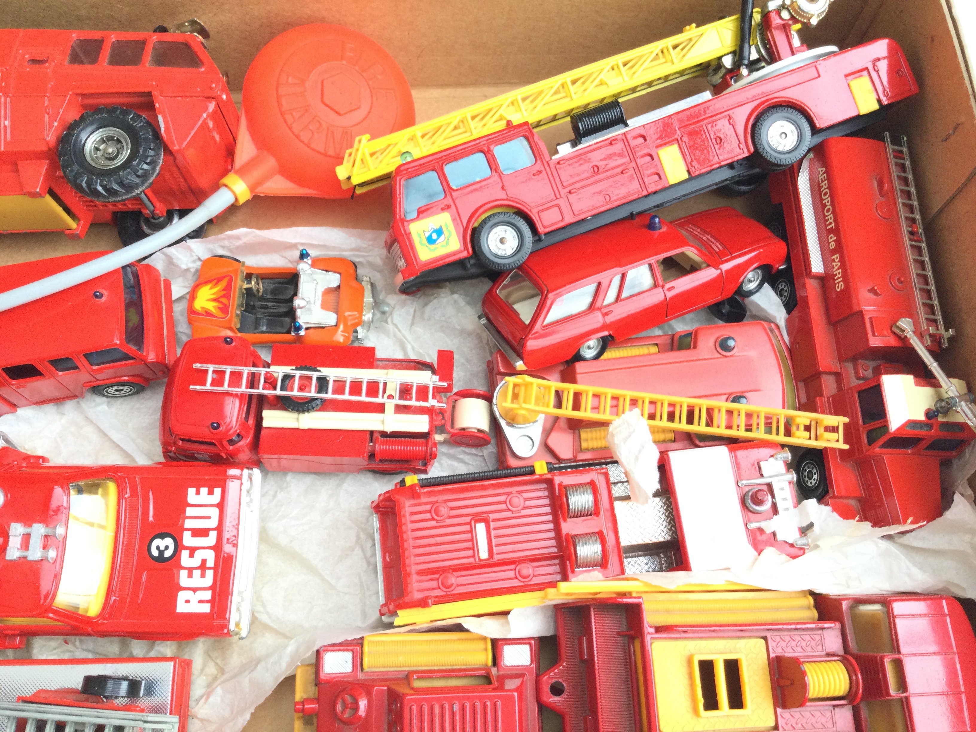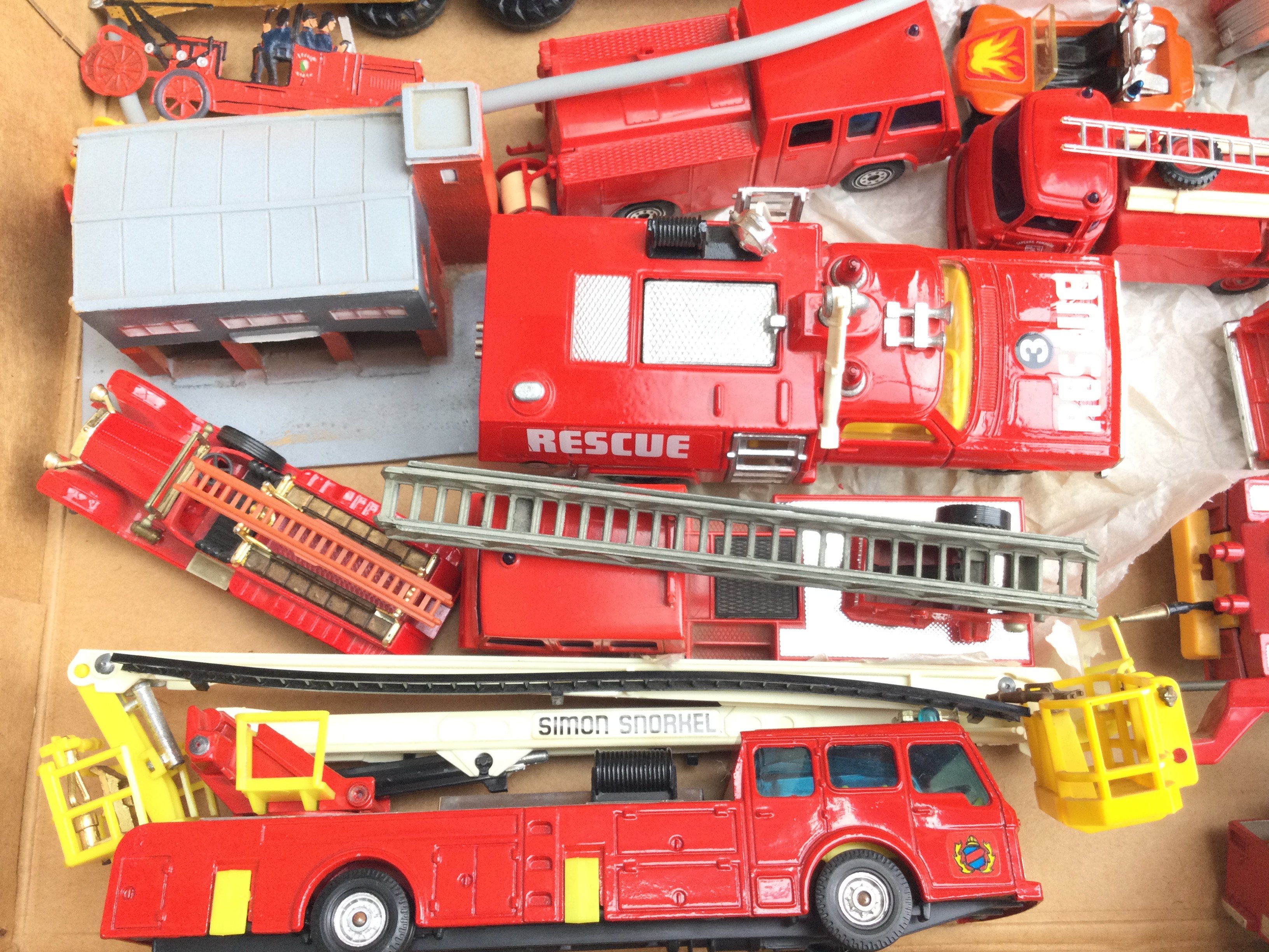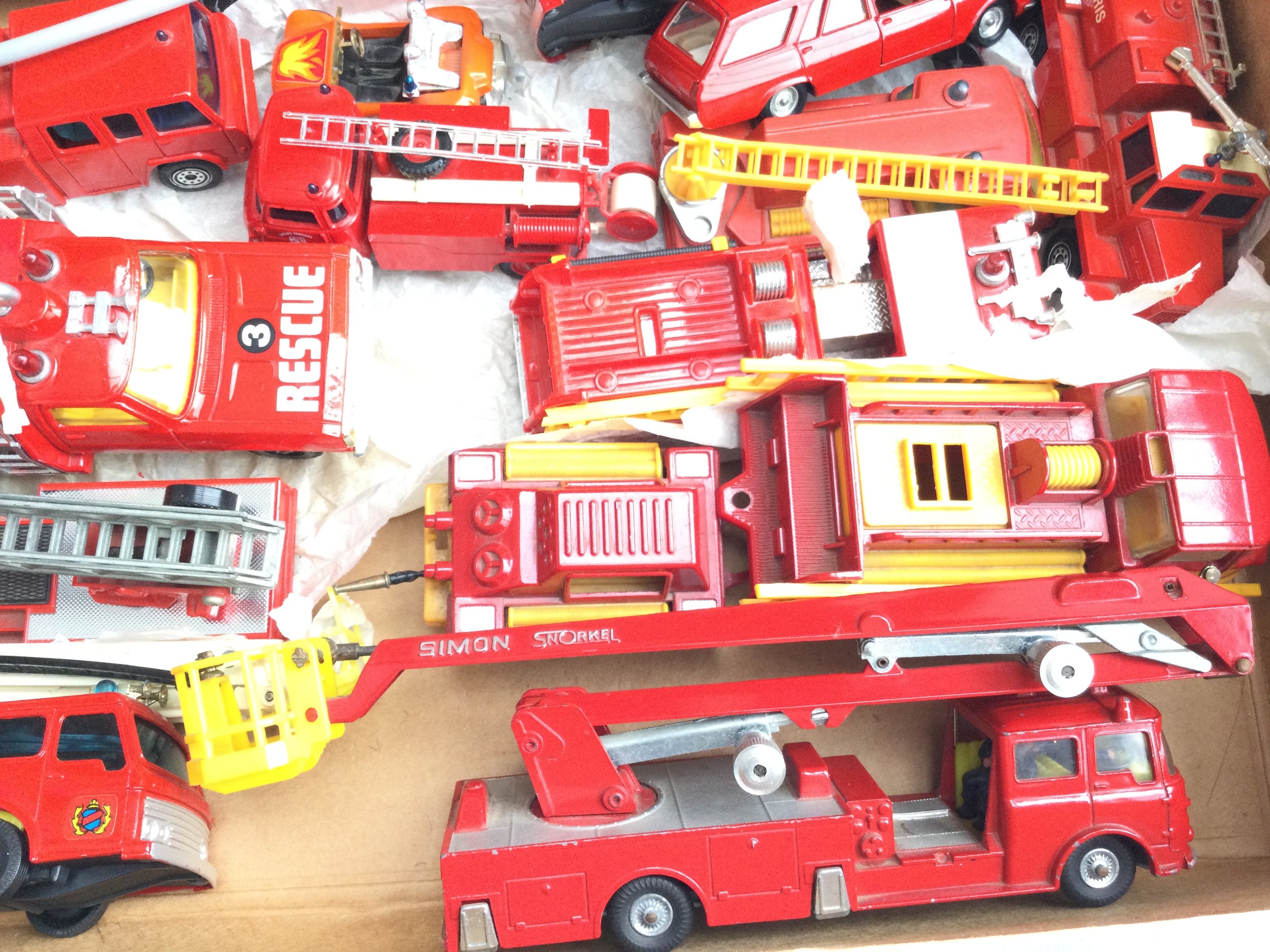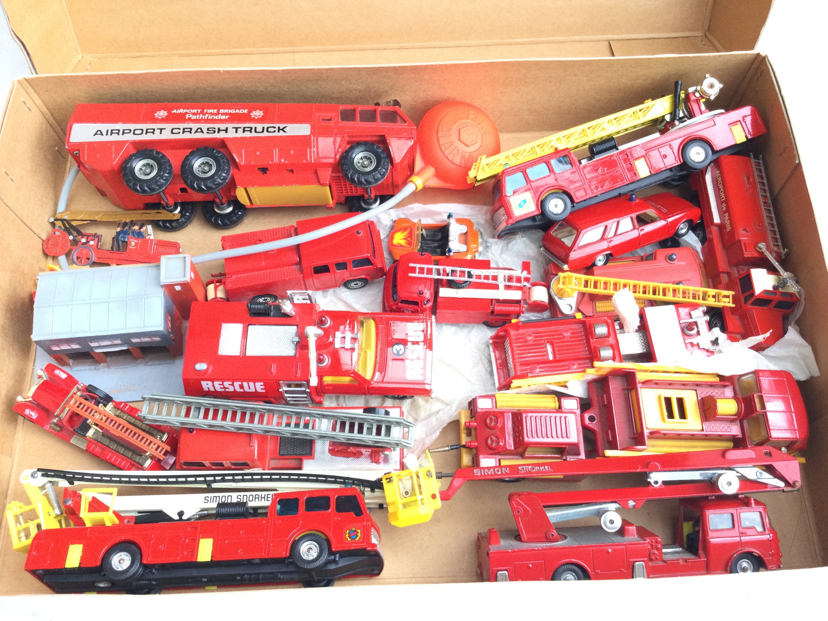 A Box Containing a Collection of mostly Corgi Fire Engines. Including Airport Crash Truck. Simon Snorkels etc.