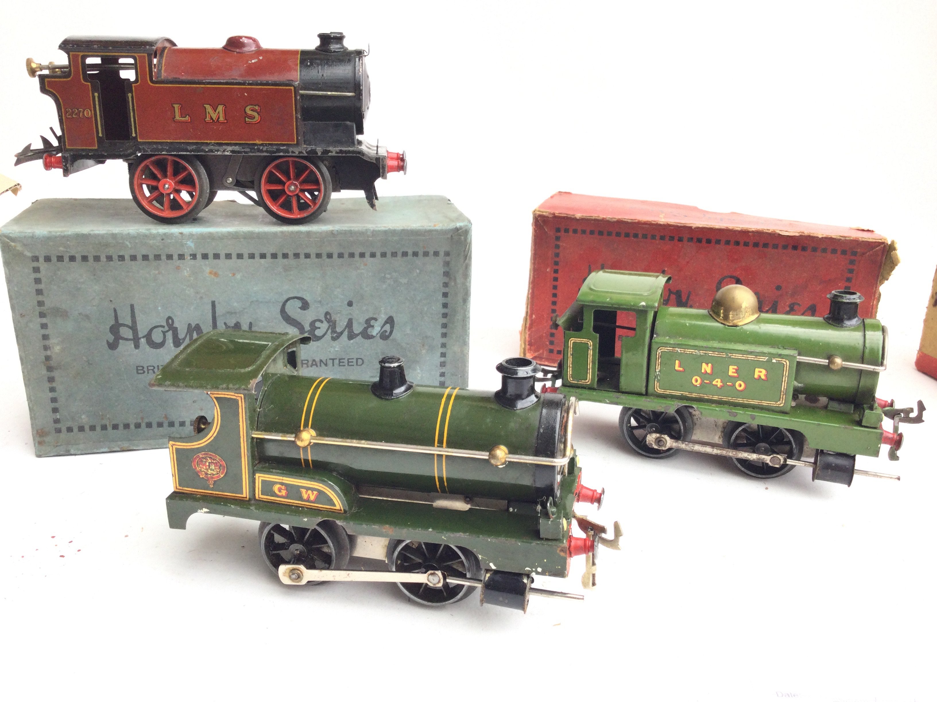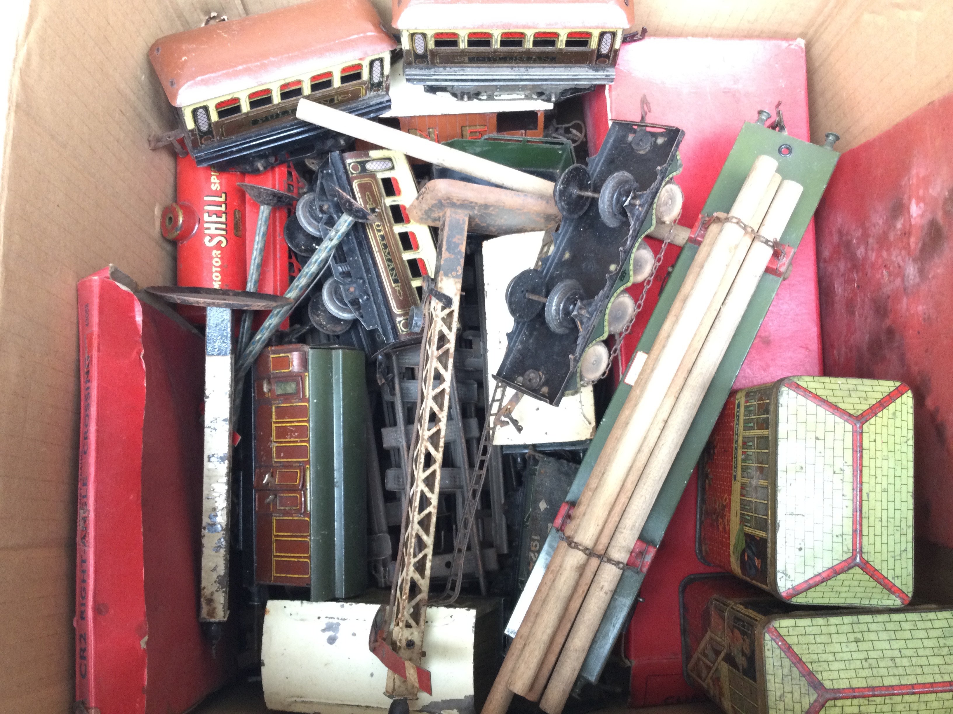 A Box Containing 0 Gauge Locos. Track and Wagons.