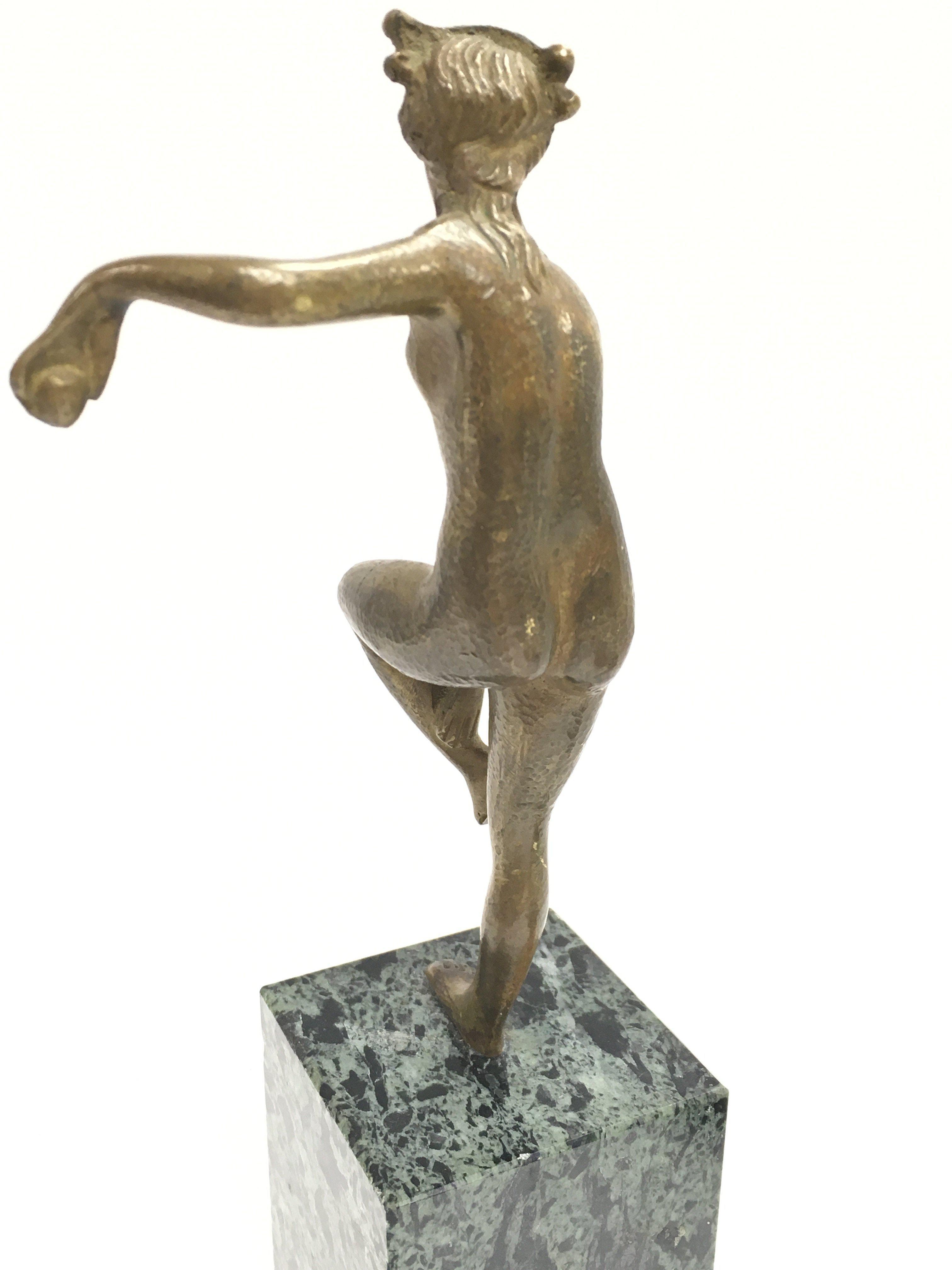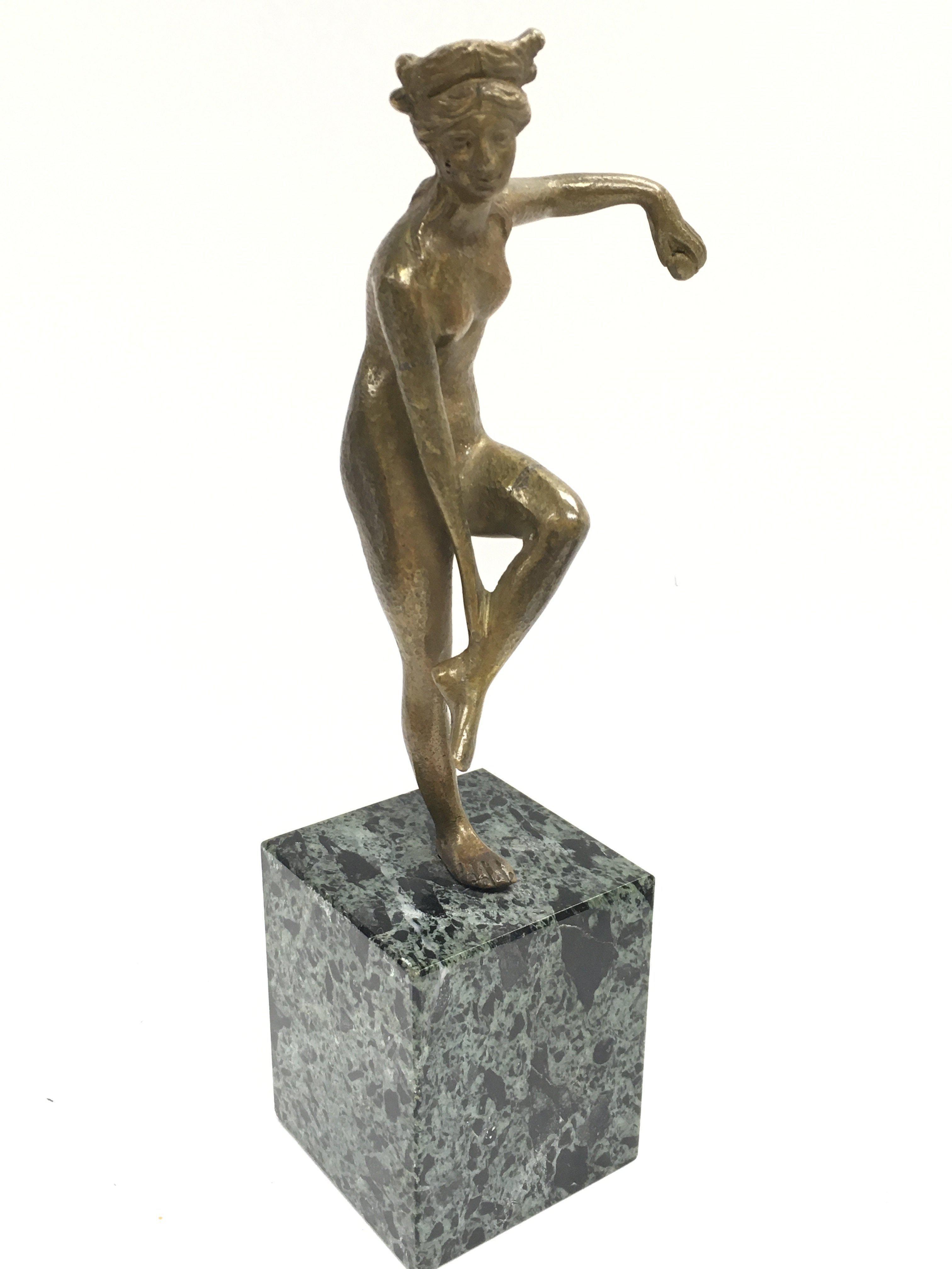A bronze Art Nouveau figure of a nude woman bather on a square green and black marble base, 21cm tall. Postage category B