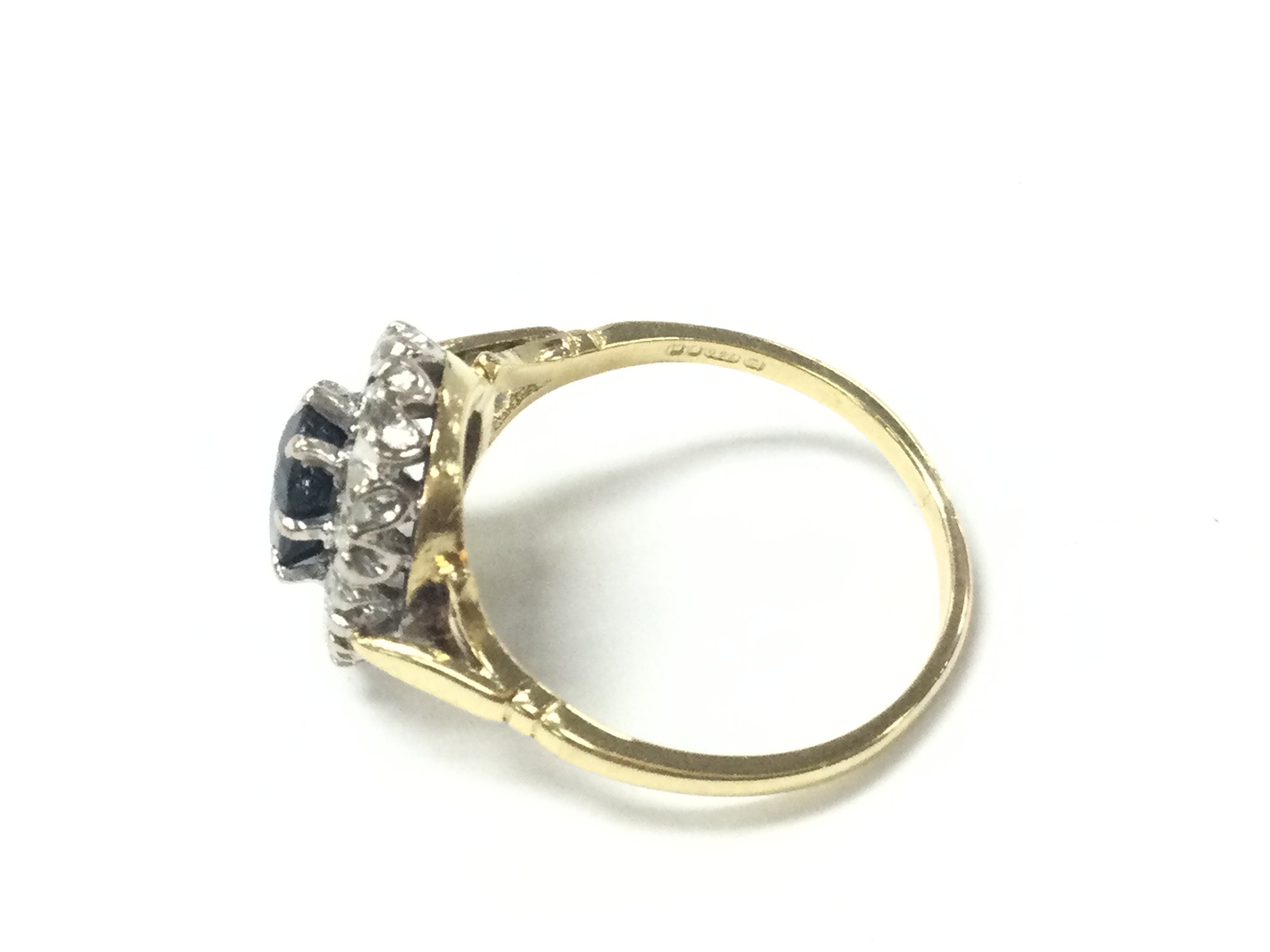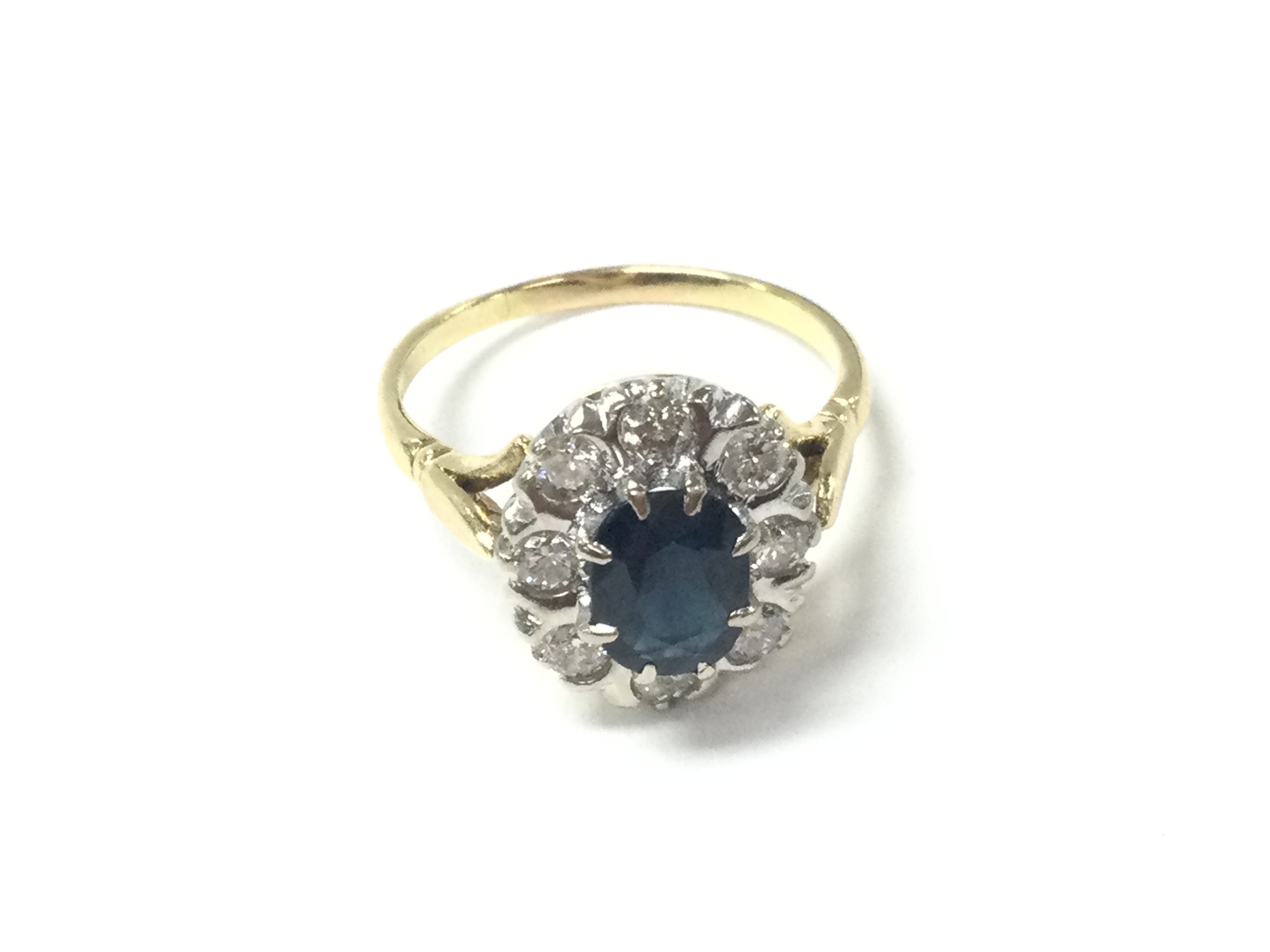 18ct yellow and white gold vintage style oval sapphire and RBC diamond cluster ring. Sapphire 1ct and diamonds 0.65ct approximately. Size S and 5.3G. Postage A