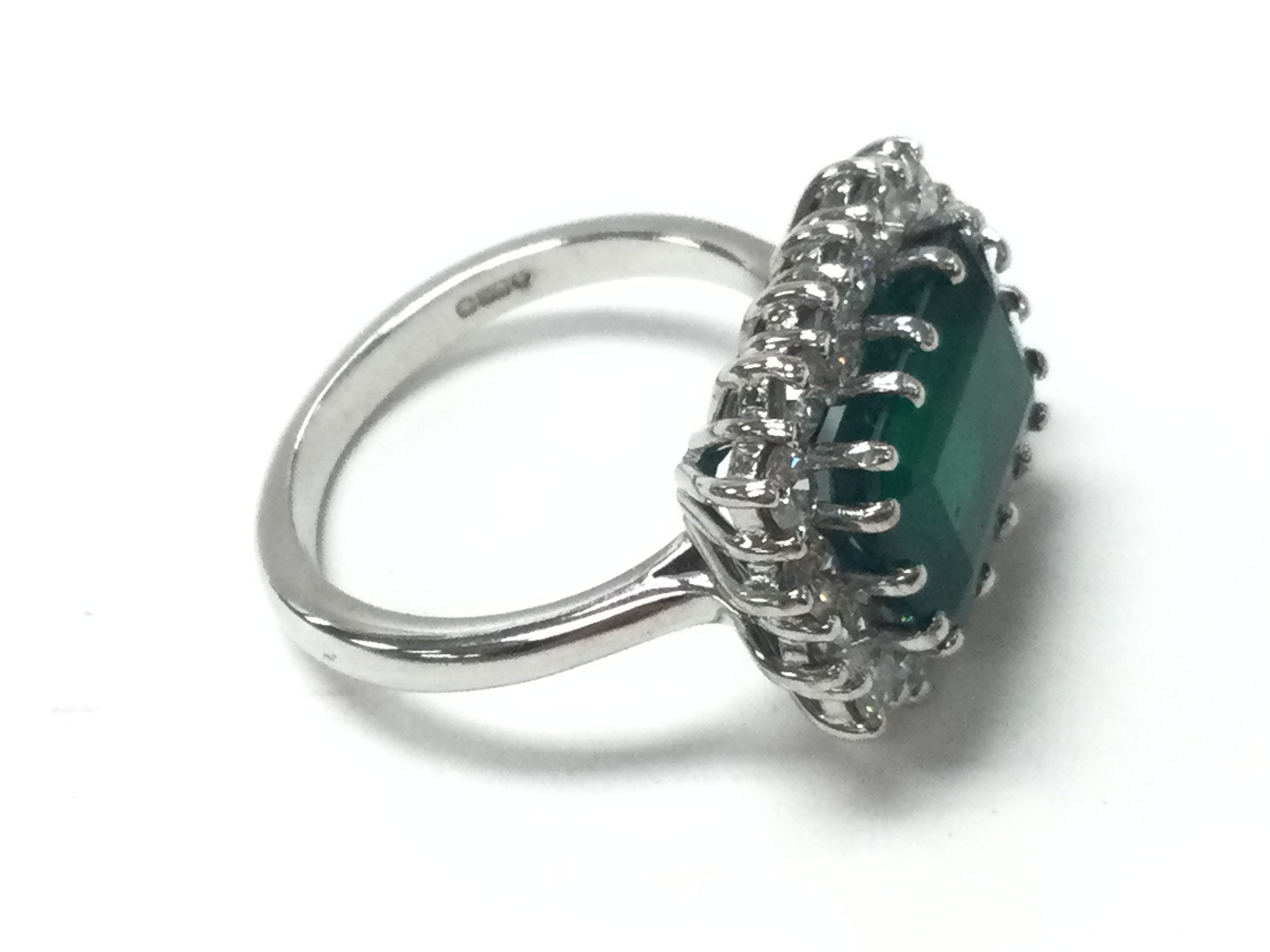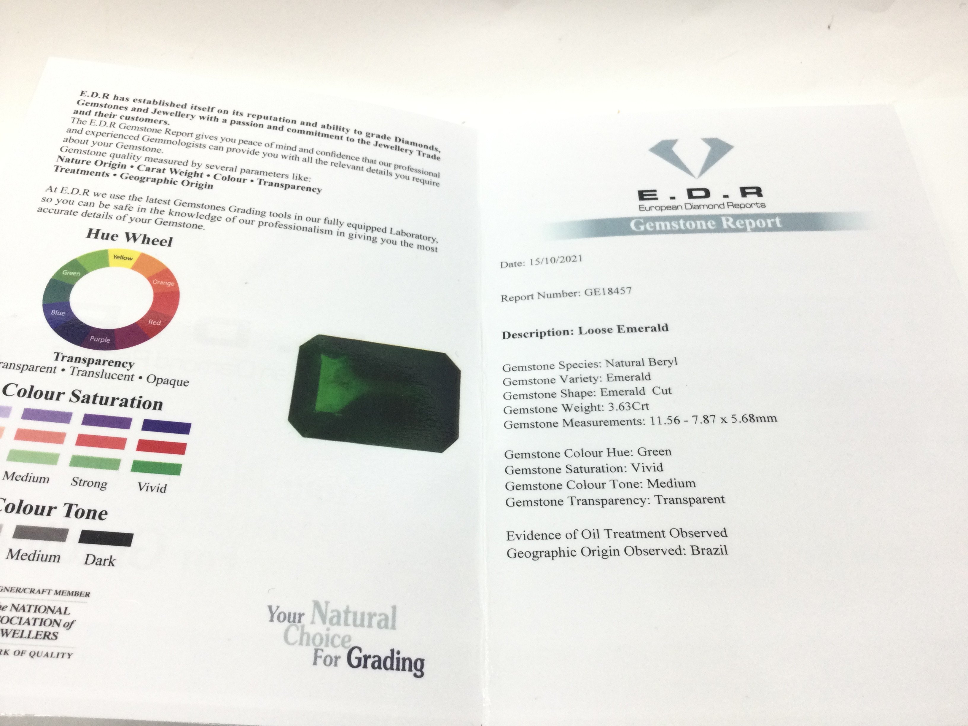 An 18ct white gold natural beryl emerald ring flanked by diamonds with EDR report. Emerald 3.63ct. Size M and 6.55gPostage B