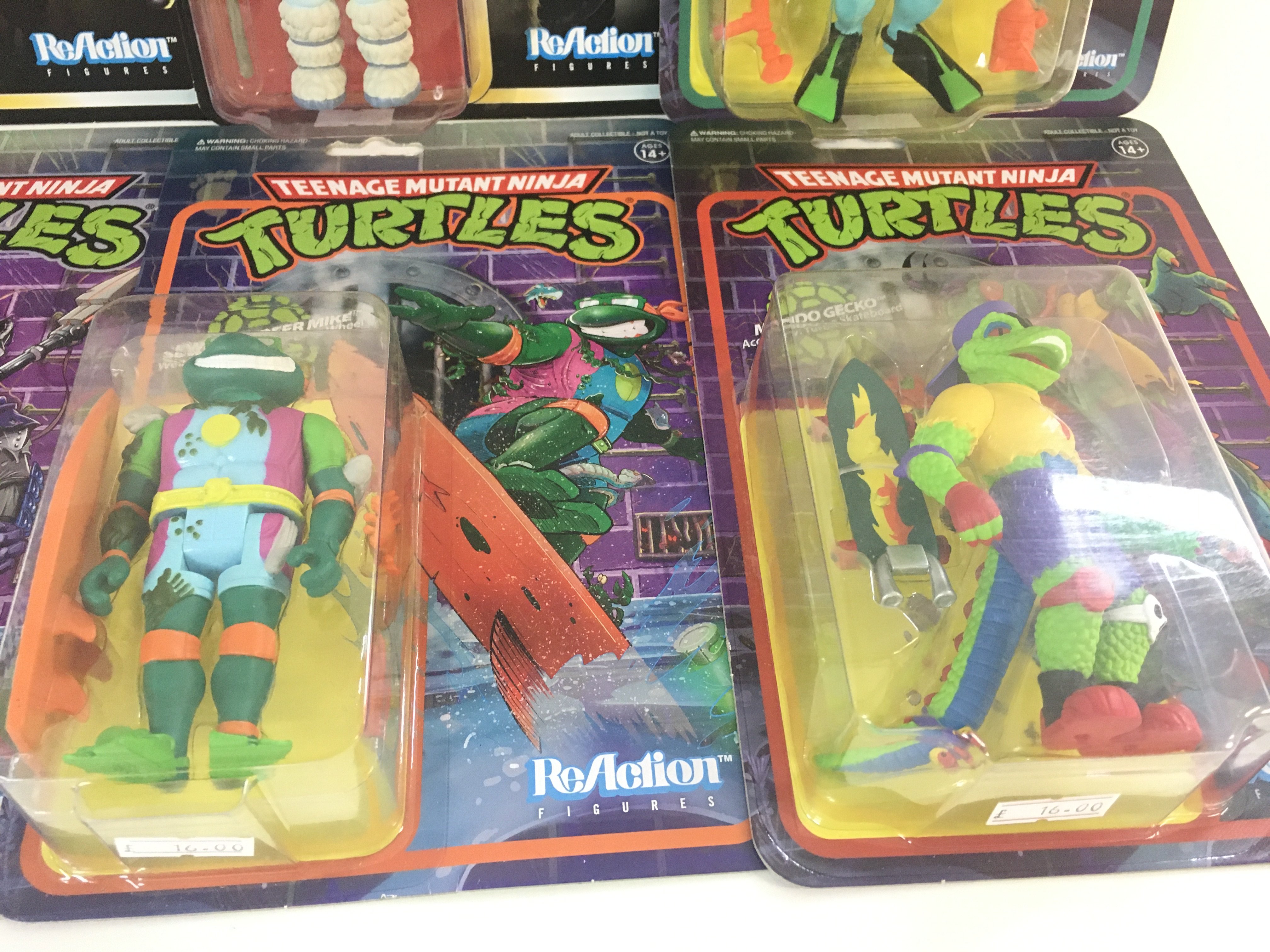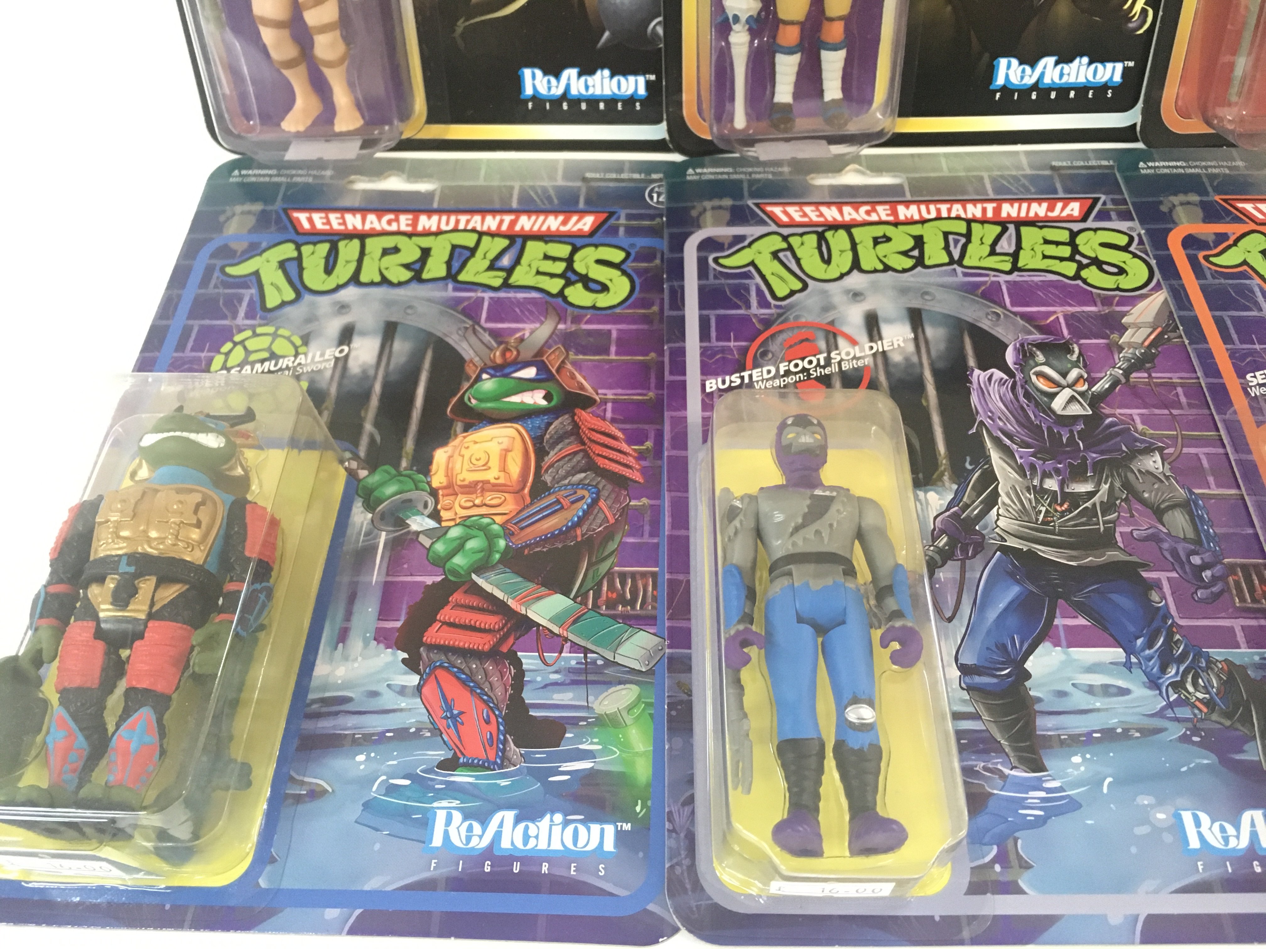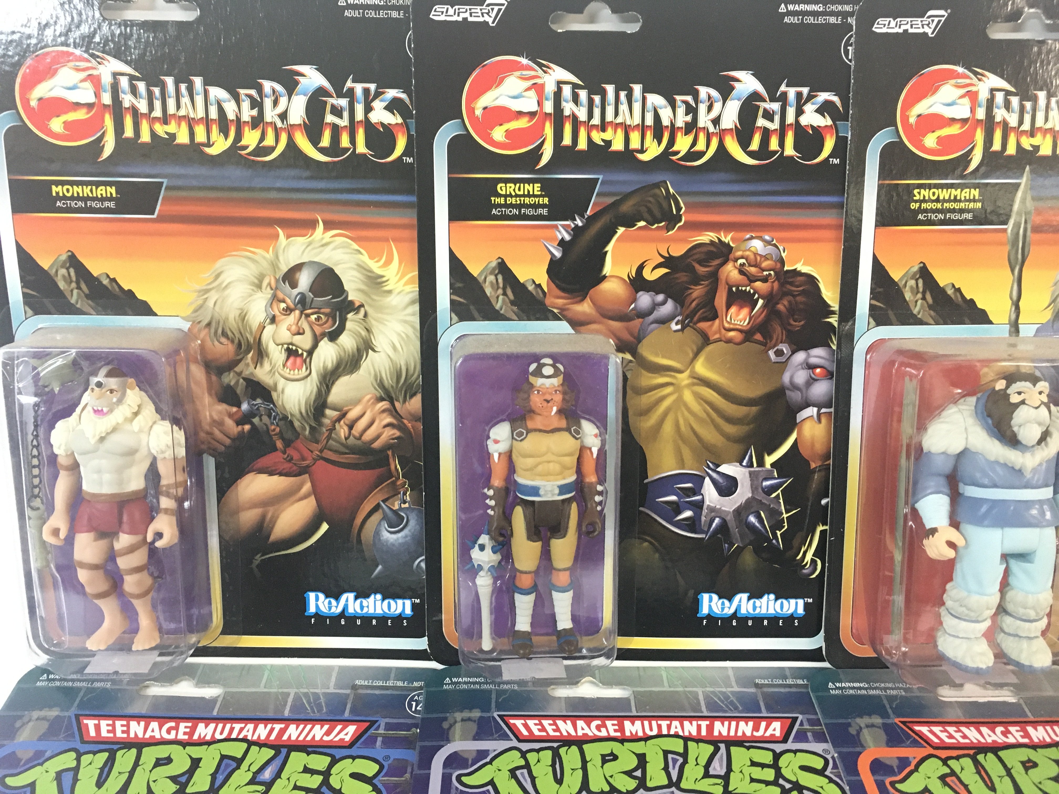 A Collection of Carded Reaction Figures including thundercats and Turtles.