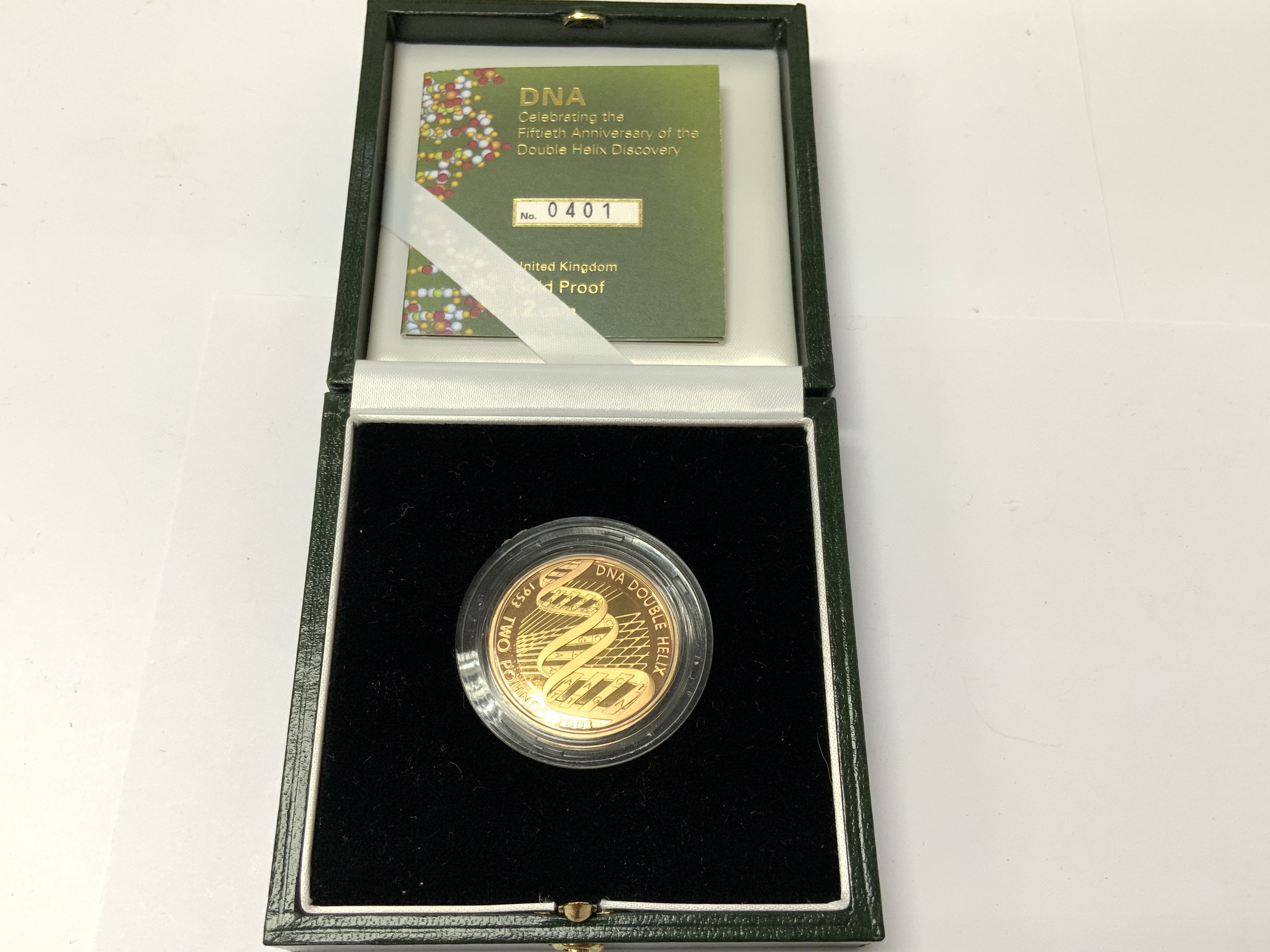 A 2003 50th anniversary double helix proof gold 2 pound coin. Issued by royal mint. 401 /1500. Postage category A.