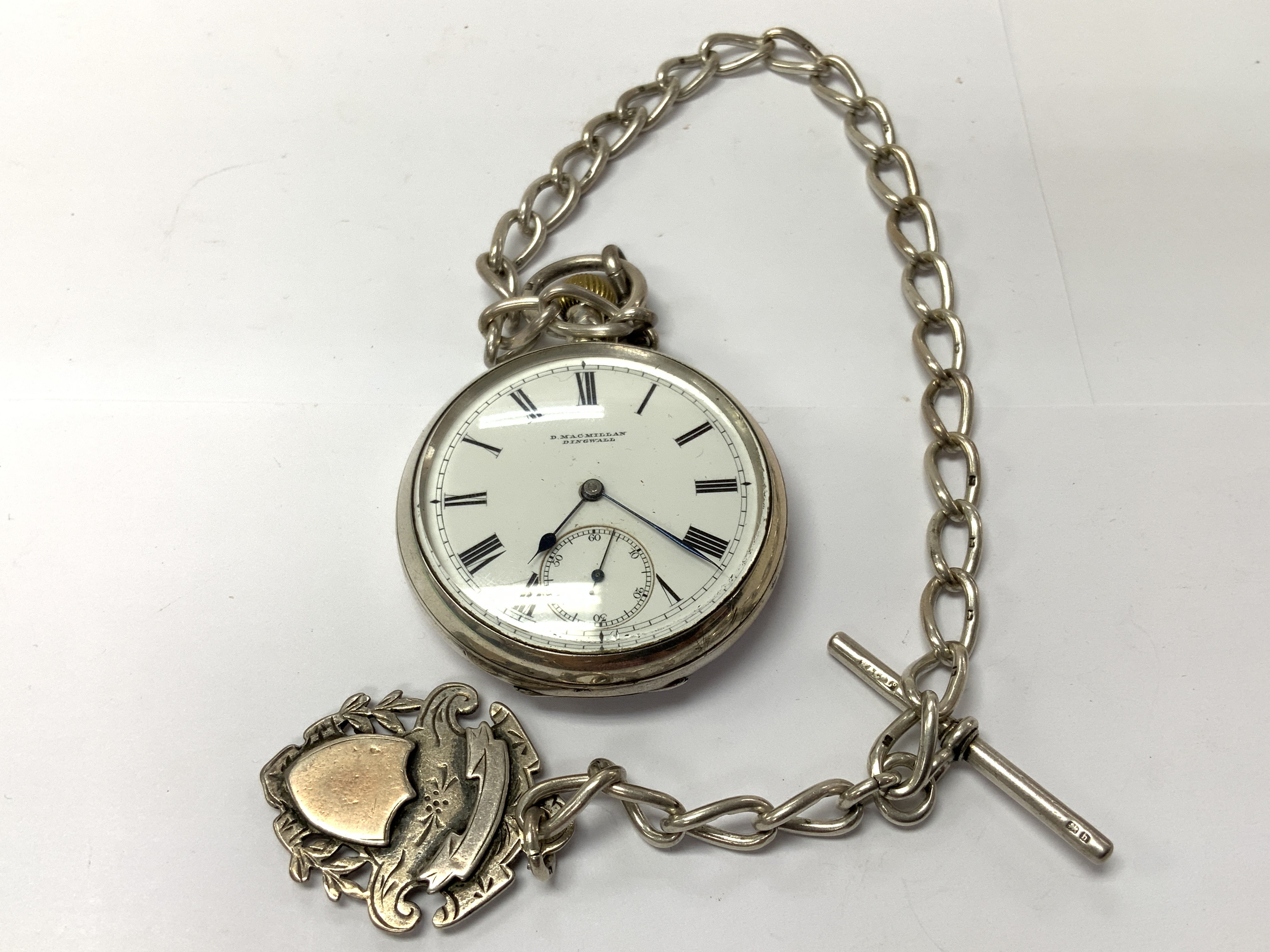 Heavy hallmarked silver open face pocket watch by D MacMillan of Dingwall together with a heavy hallmakredmsilver Albert chain and fob. Approximately 157g. Postage category A.