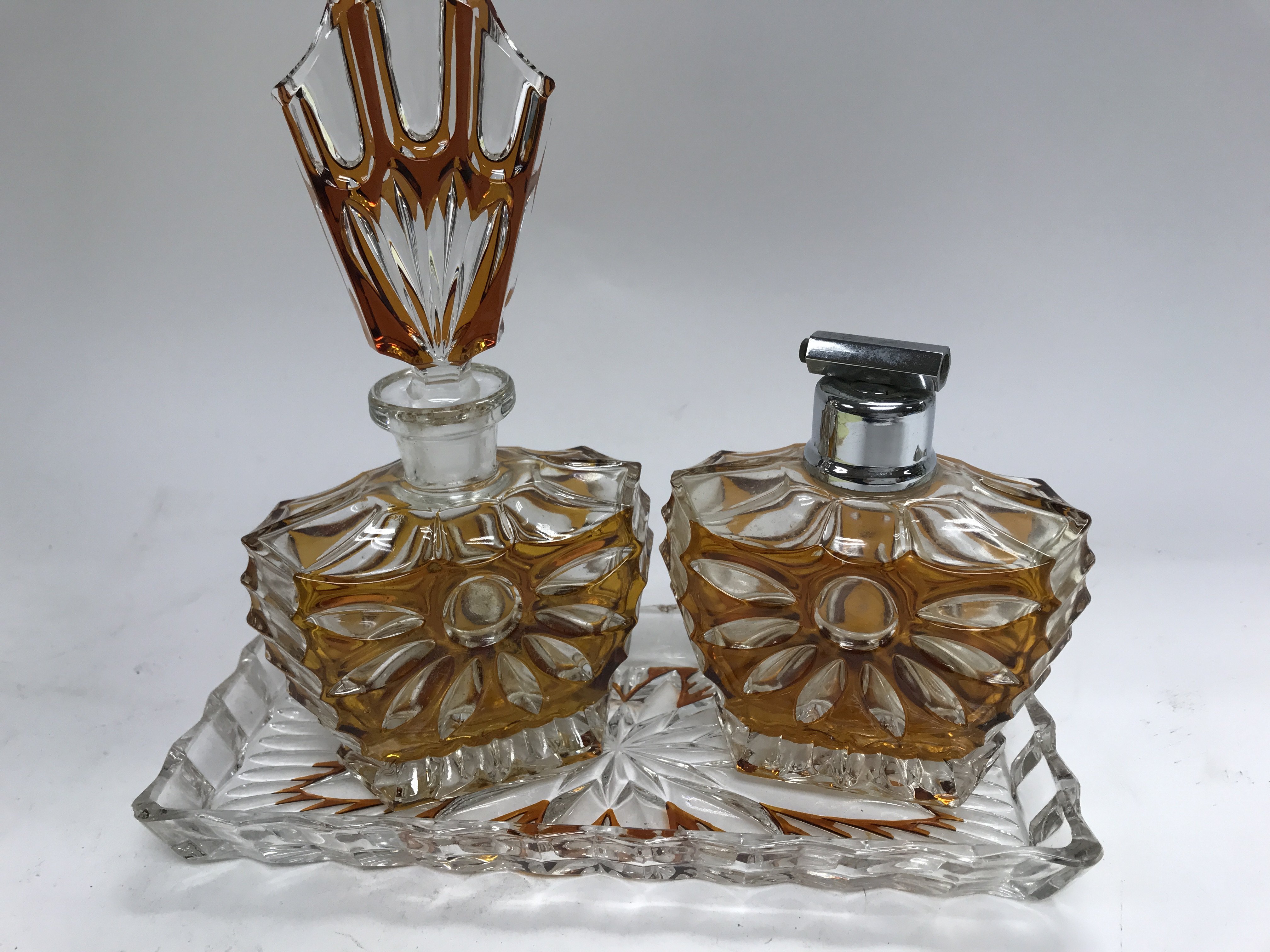 A Art Deco glass perfume bottle with matching atomiser and tray .