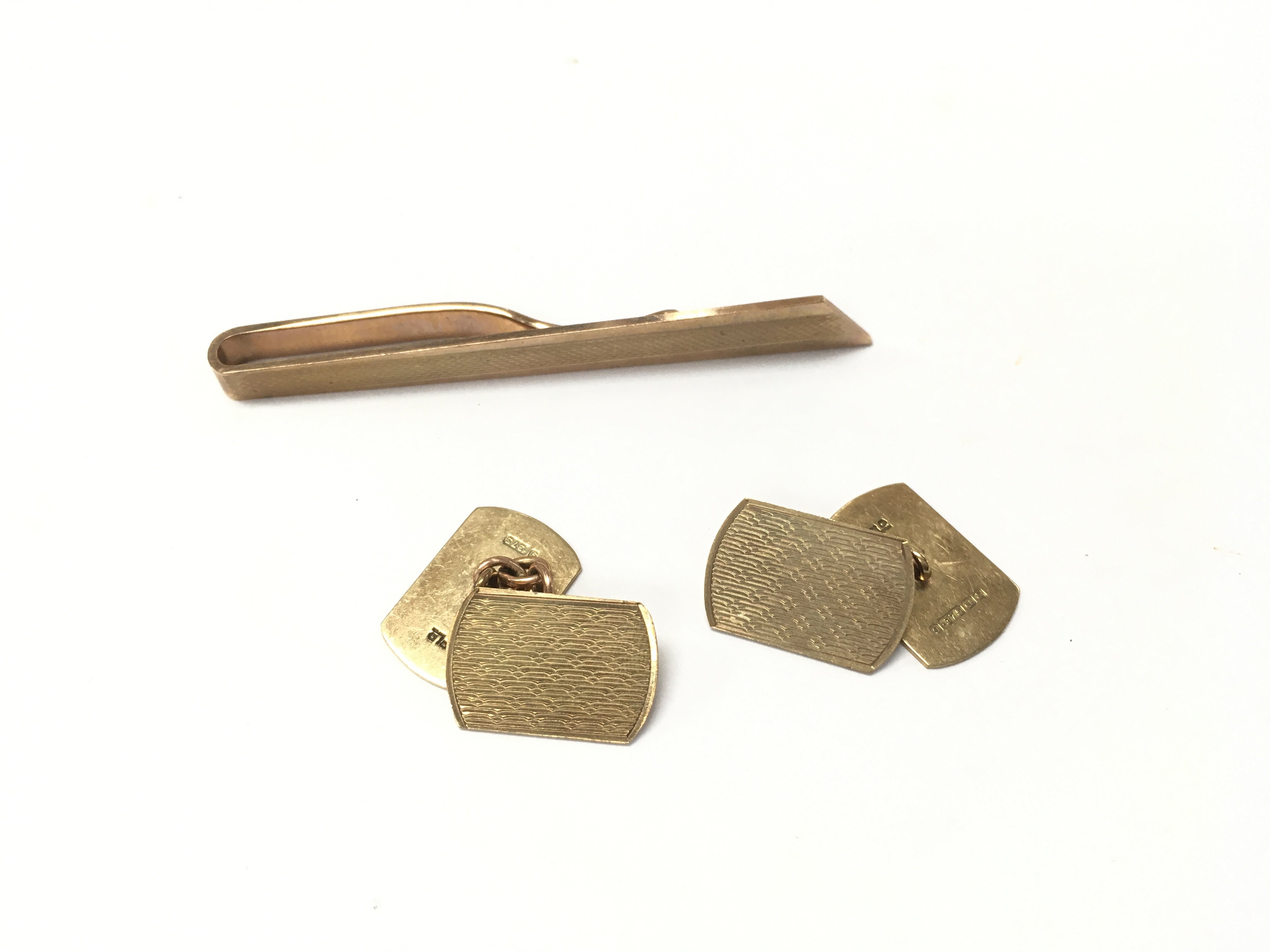 A 9ct gold pair of cufflinks with a 9ct gold bar tie clip. Approx weight 8.45 grams.