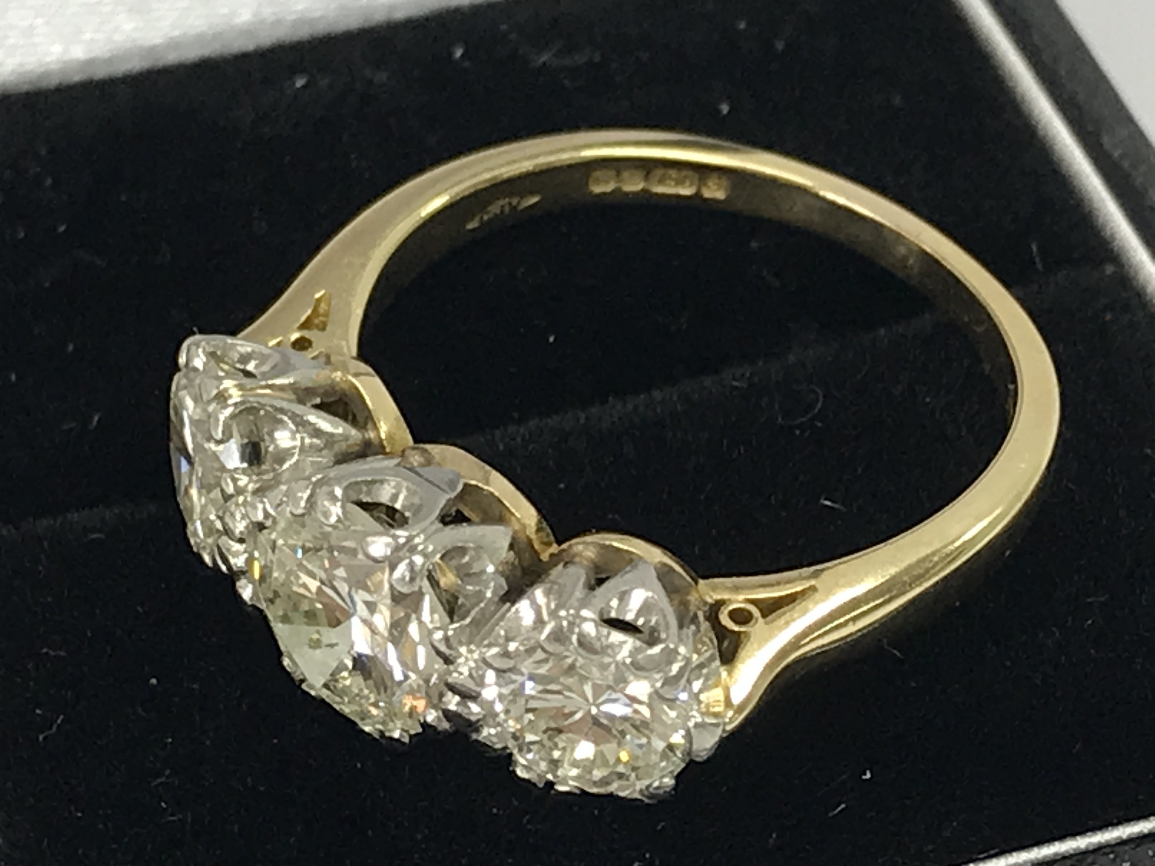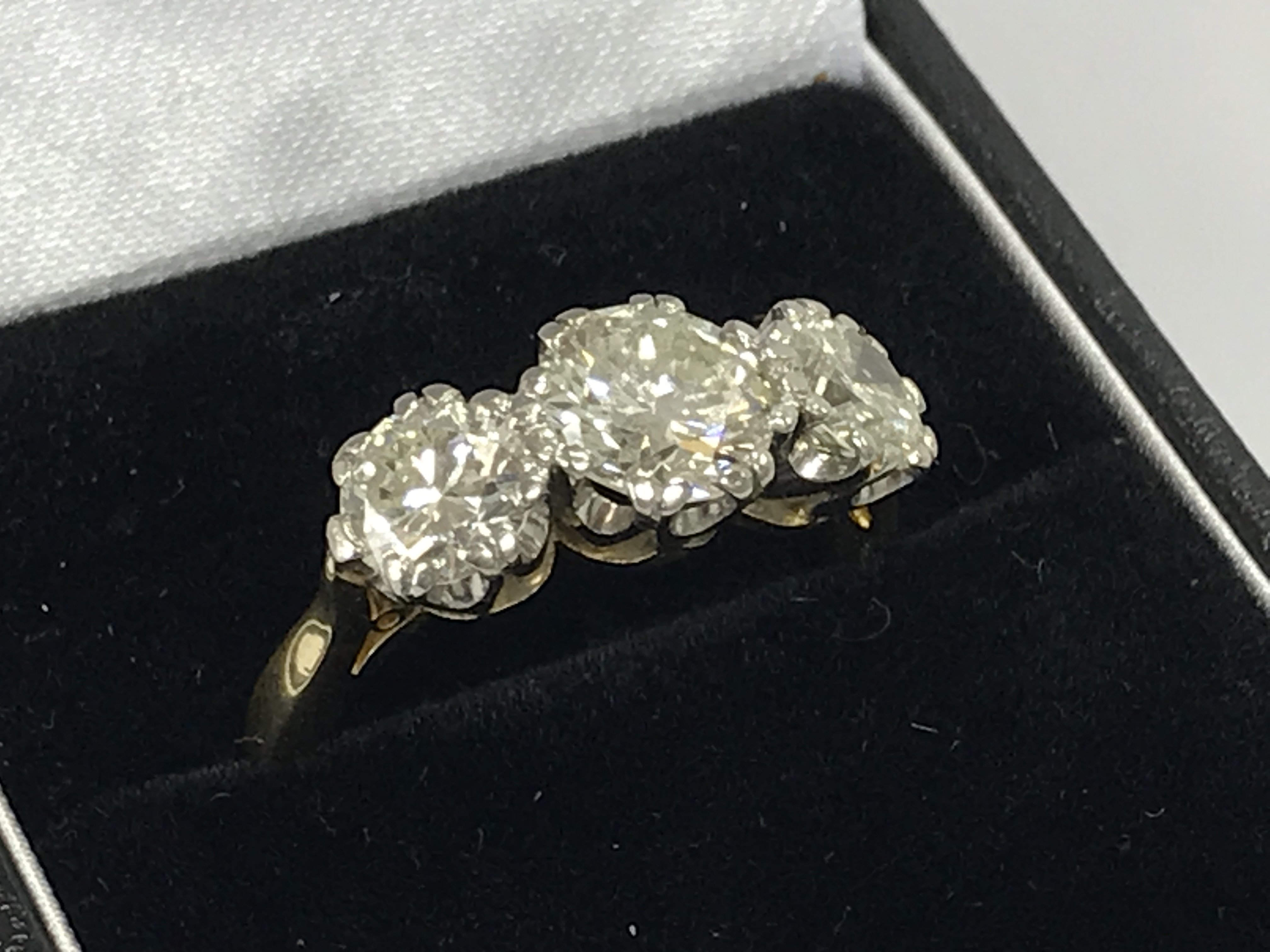 A 18 ct gold ring inset with three brilliant cut diamonds the centre diamond approximately 1.5ct flanked by two further diamonds 0.80ct colour K clarity SI .