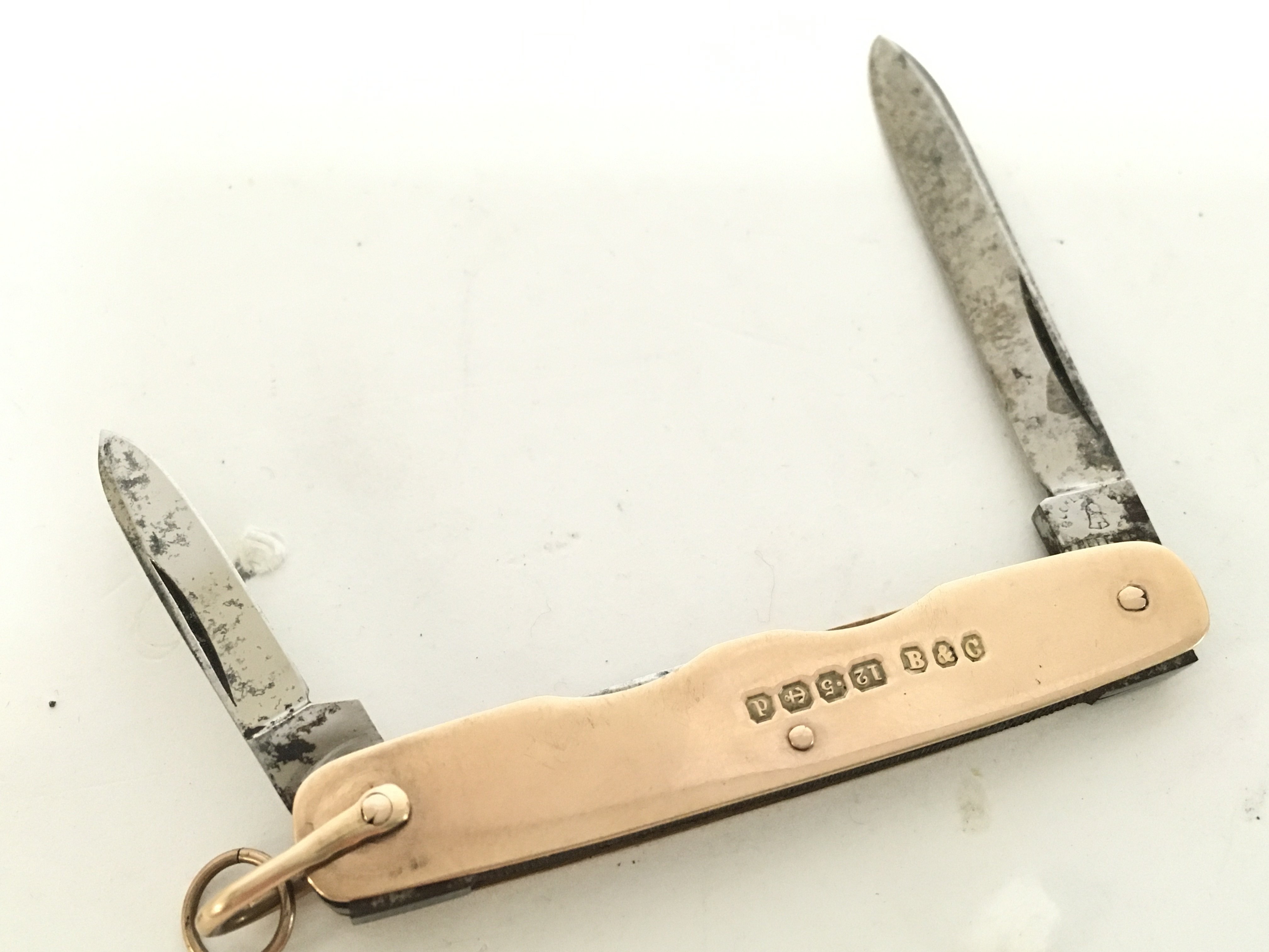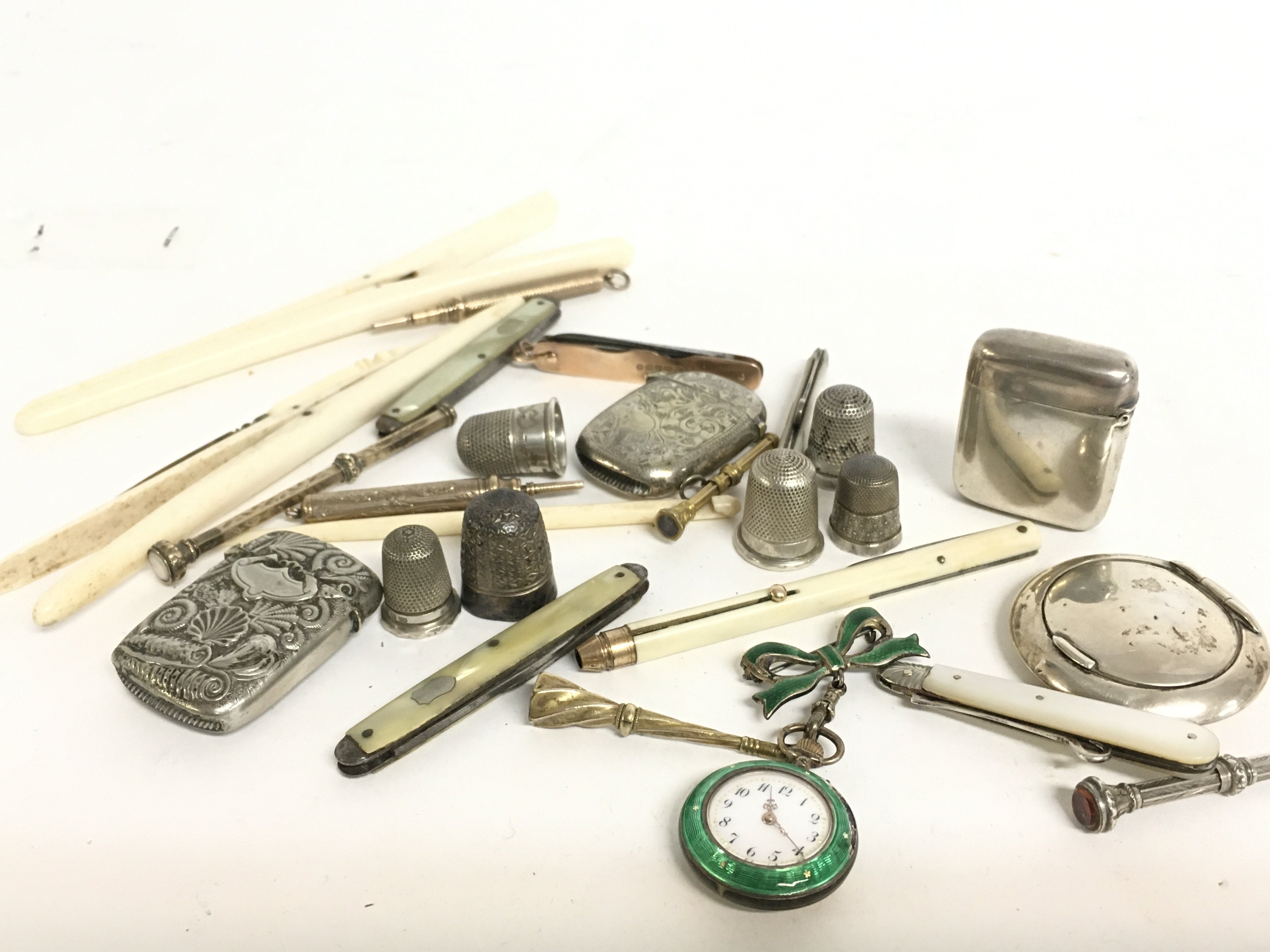 A collection of silver thimbles, a silver hallmarked vesta case, silver fob watch, bone items and a 12 carat gold penknife. Postage category A