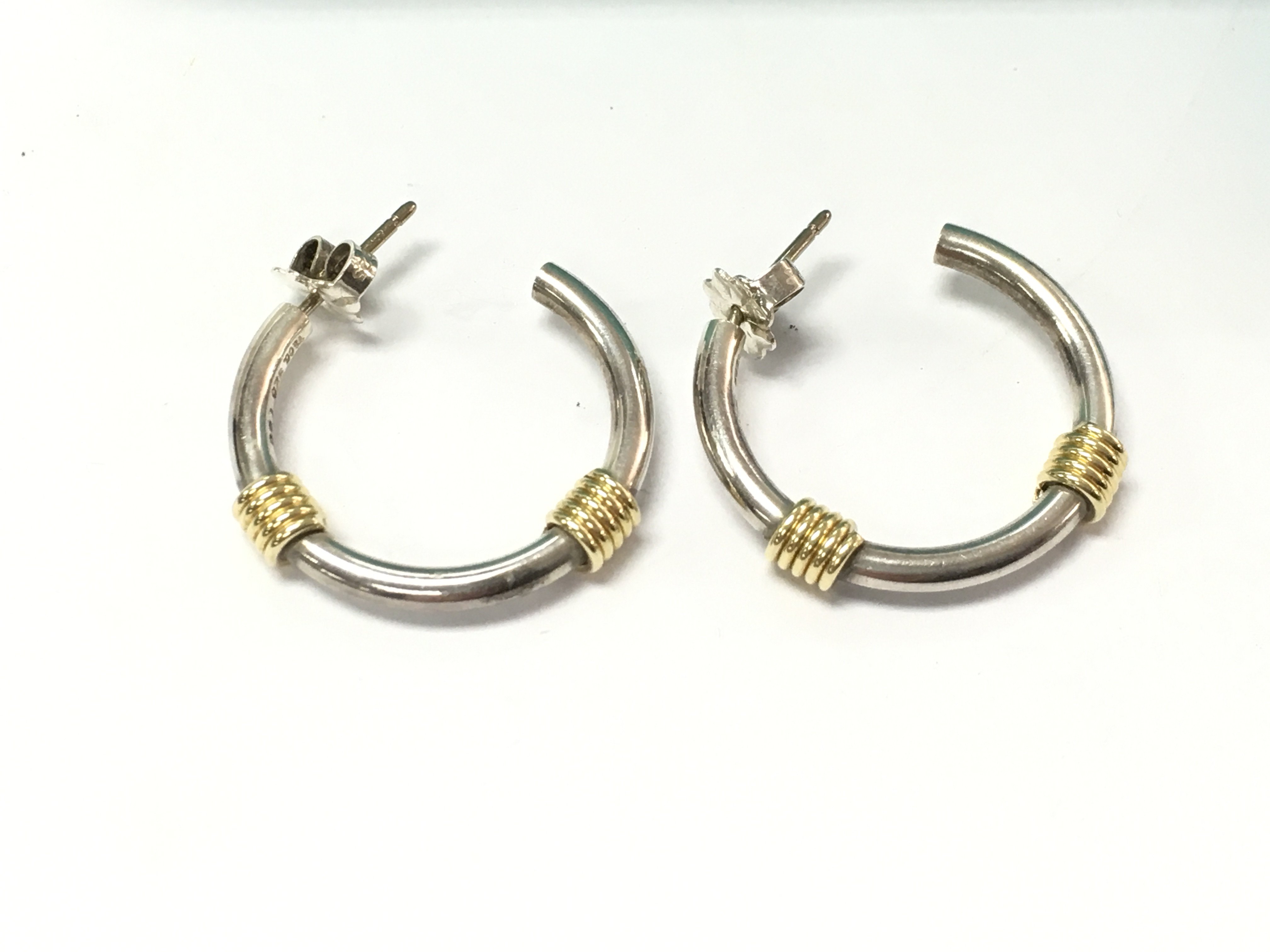 A pair of tiffany and Co silver and 18ct gold hoop earrings with box and pouch. Postage B