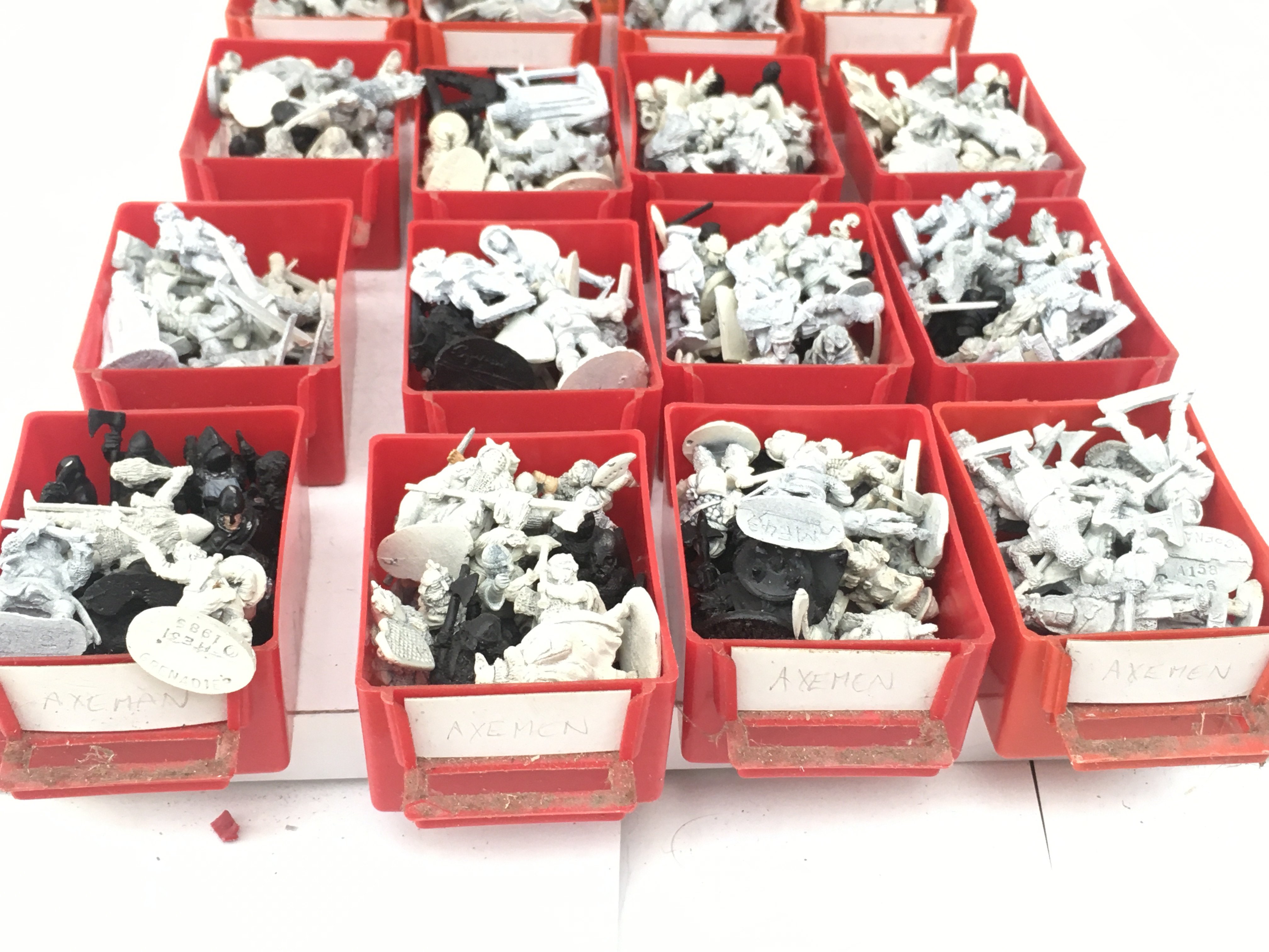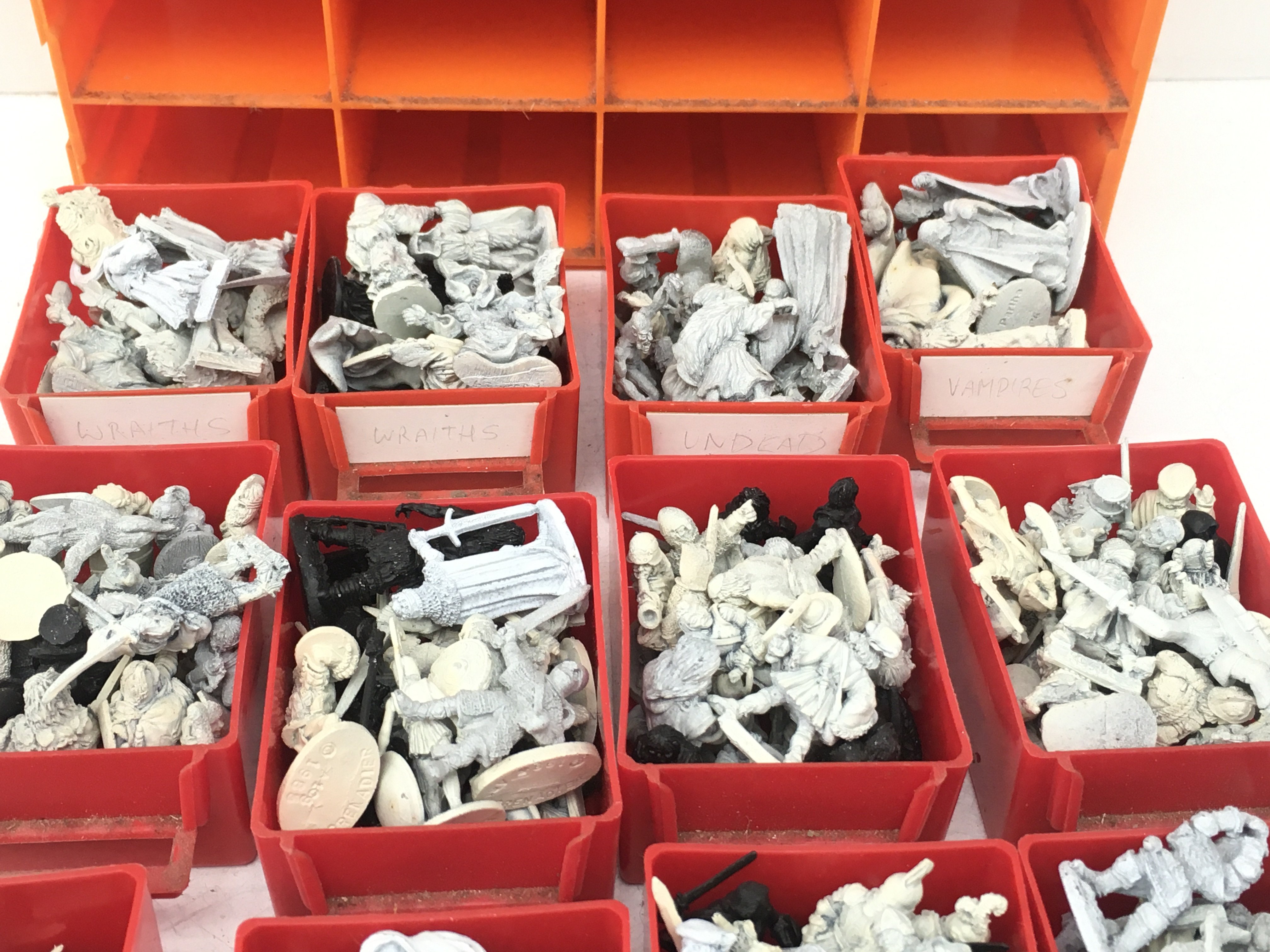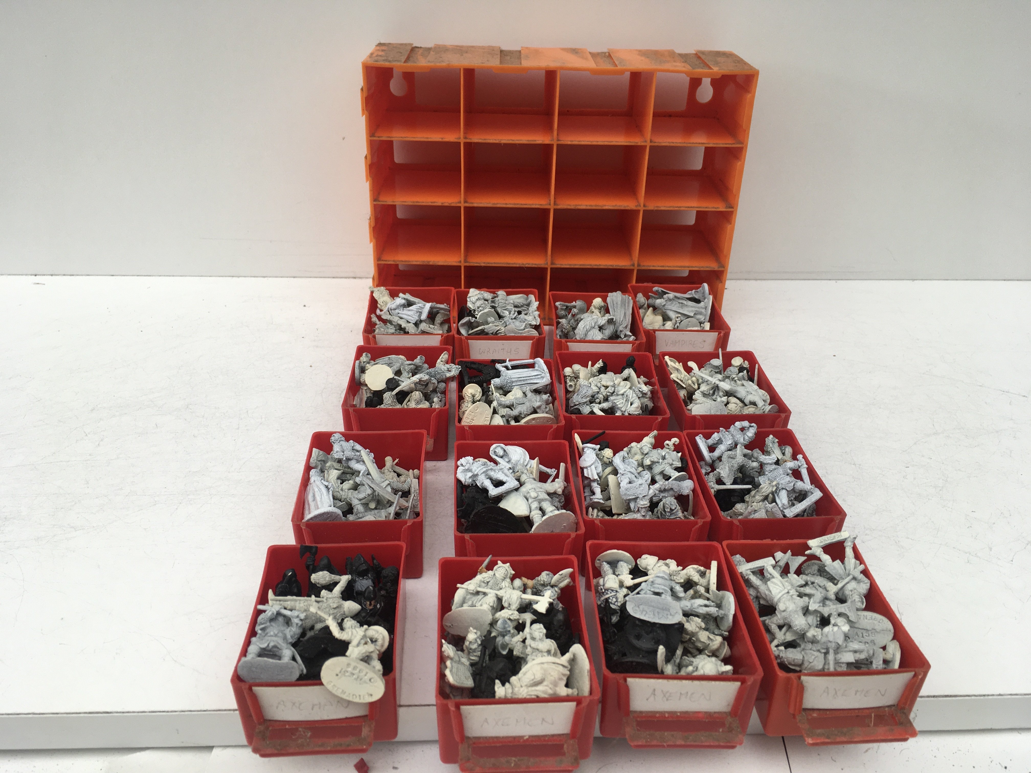 A twelve drawer storage unit filled with unpainted metal models from a warhammer collection. Made by Grenadier and others.