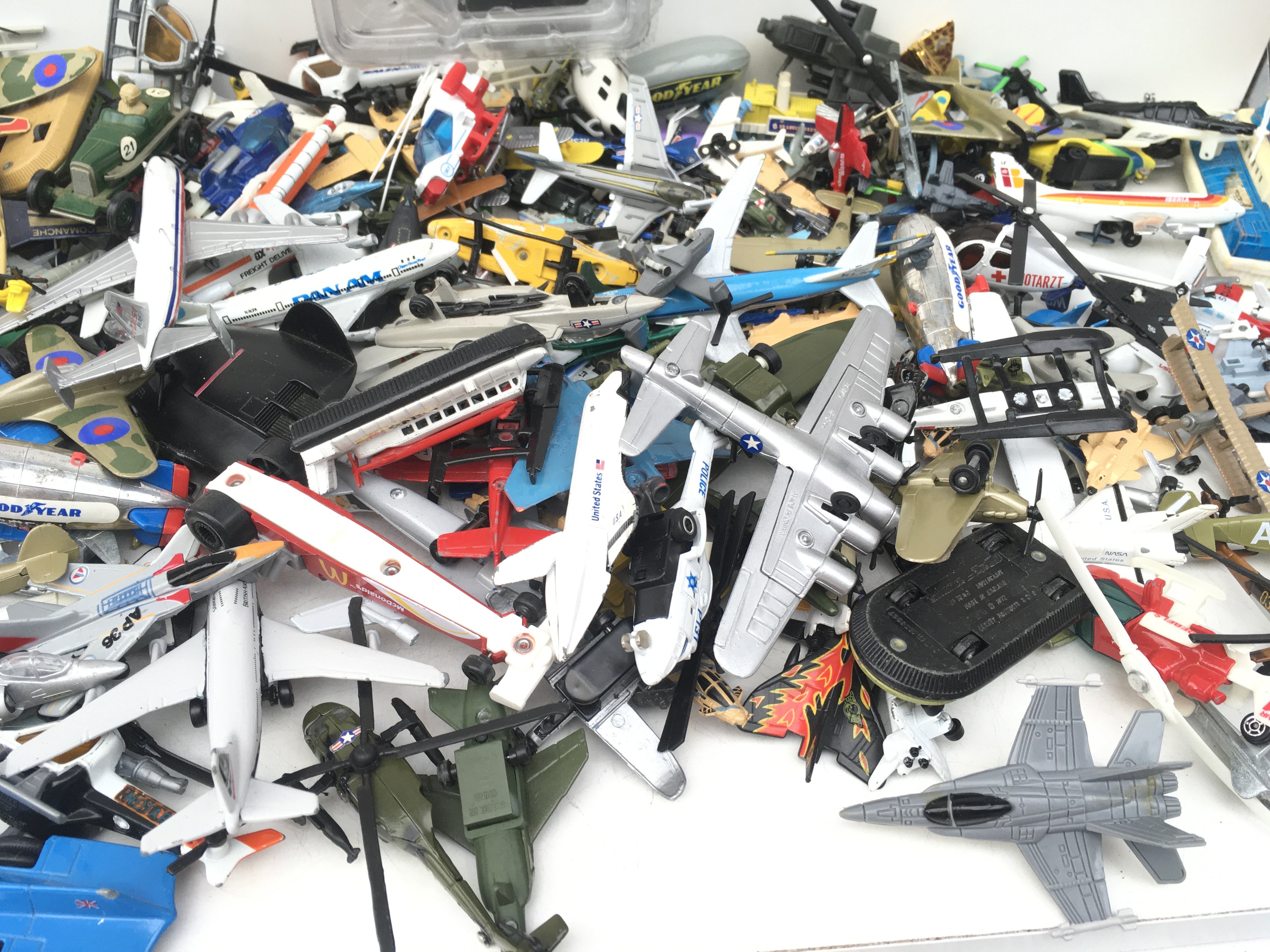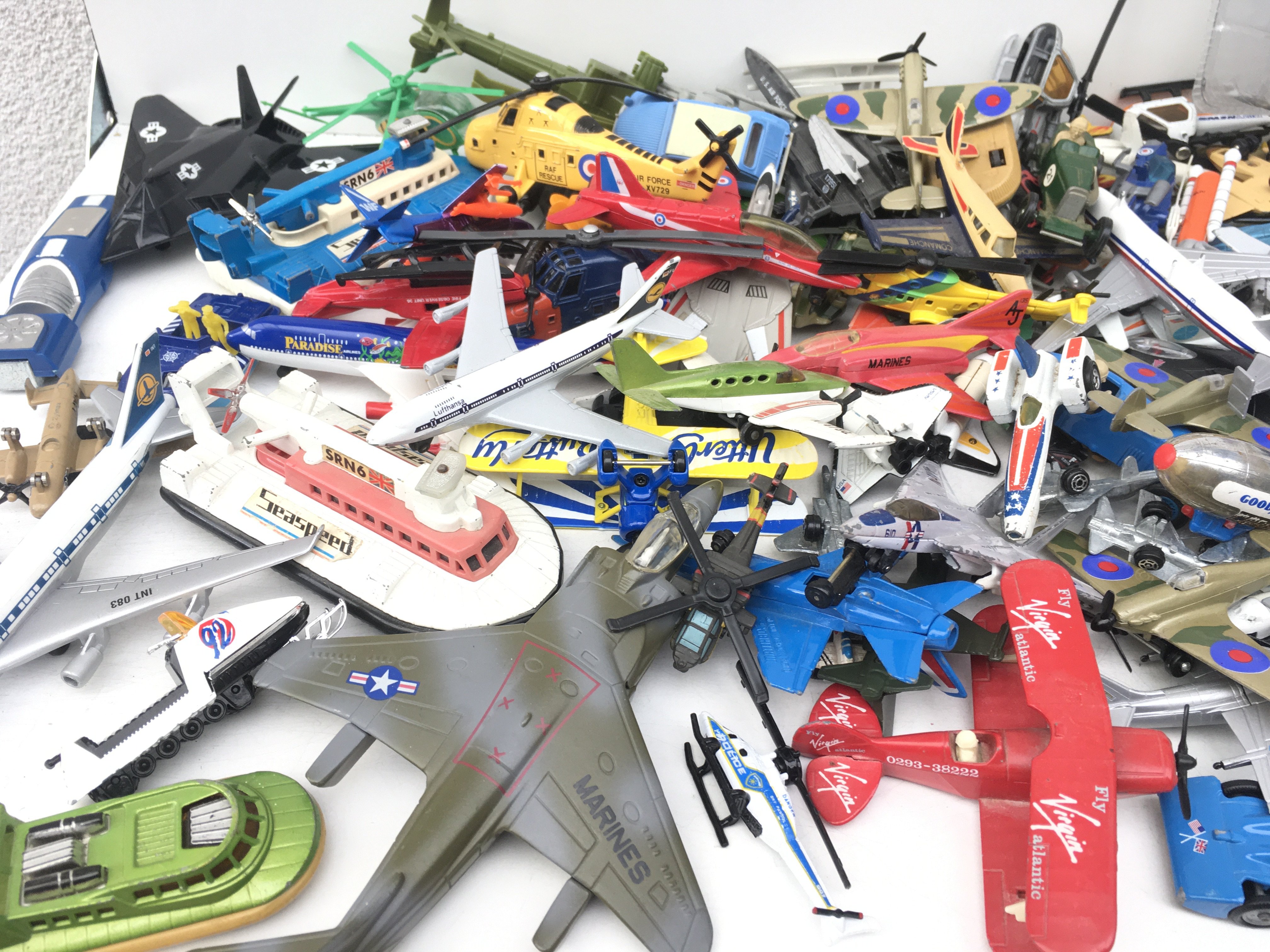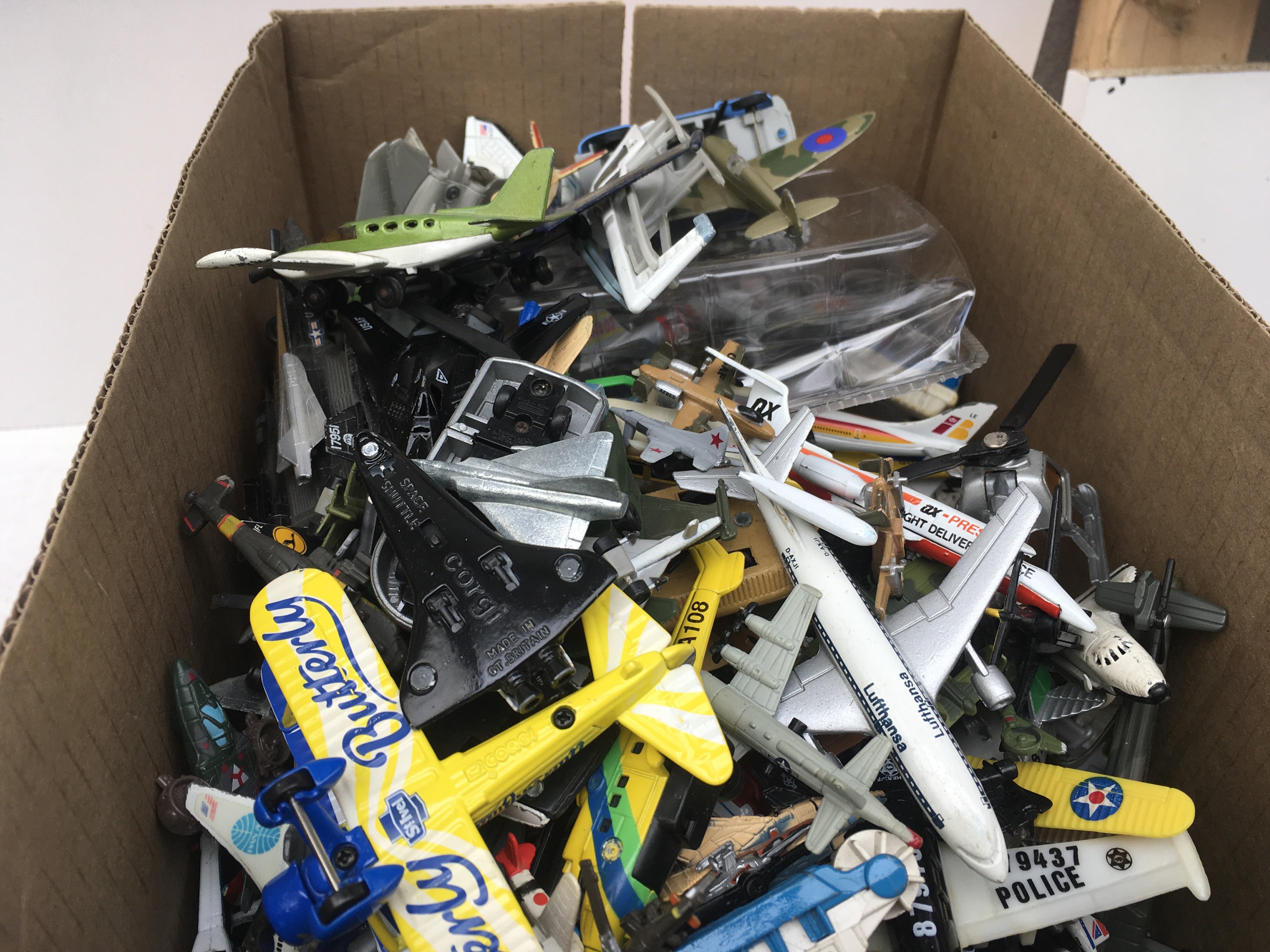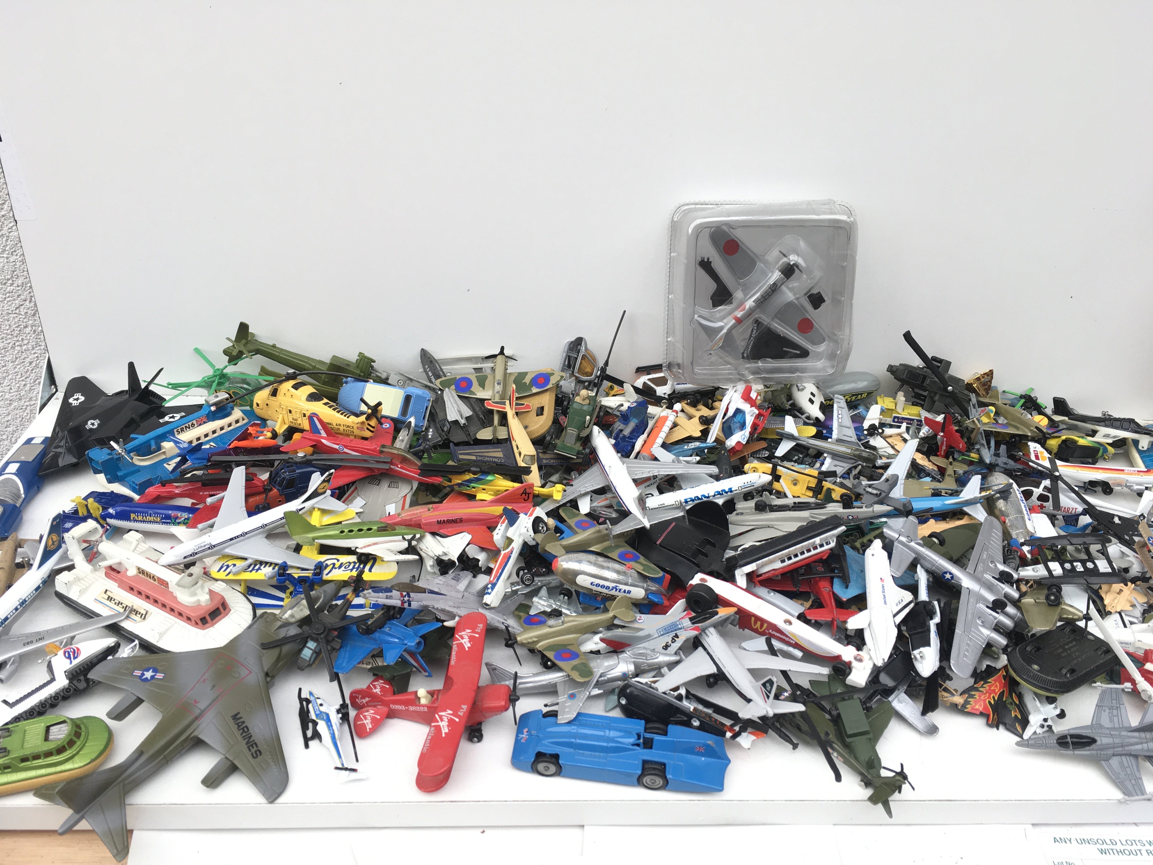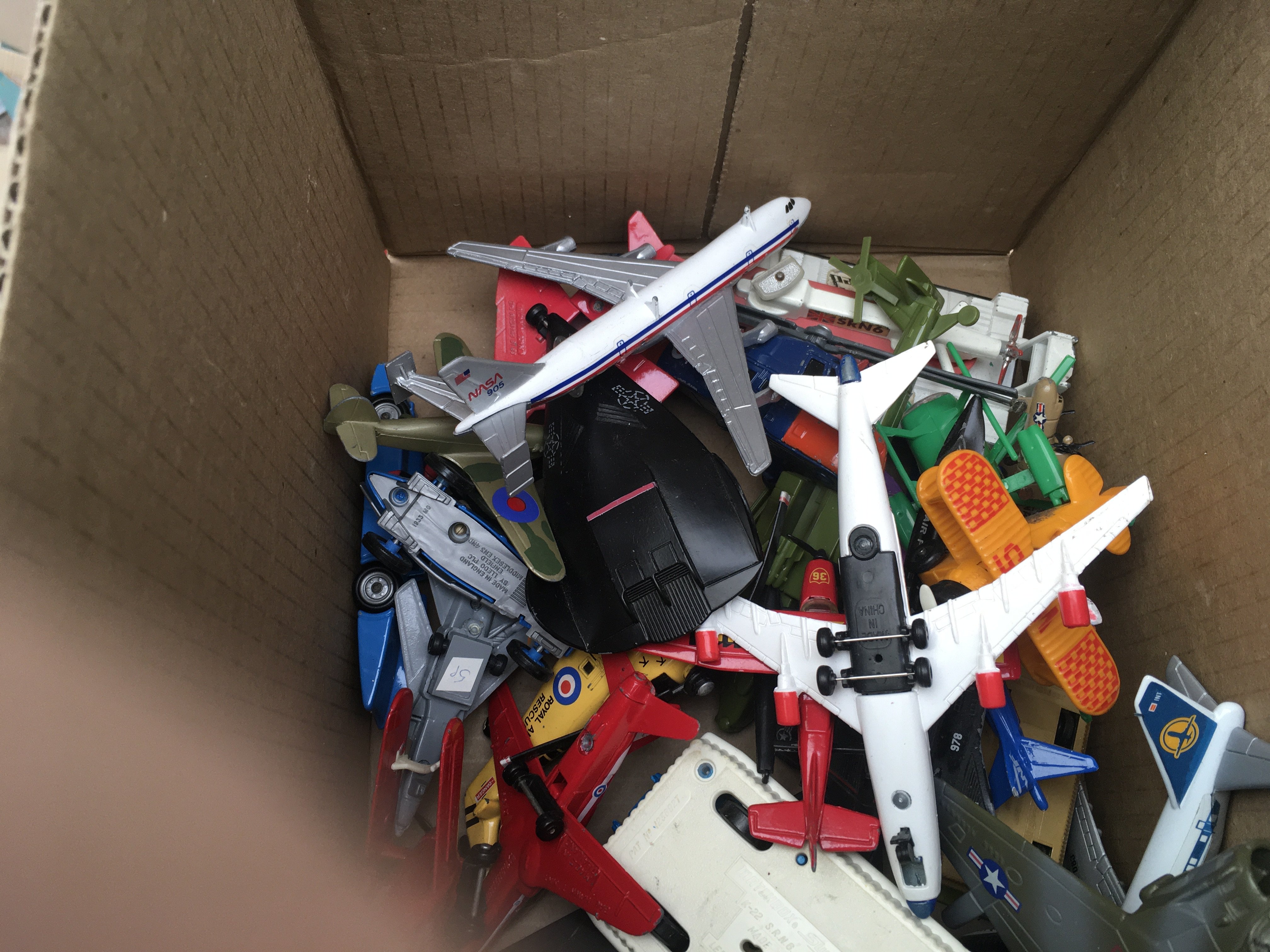 A box containing a large number of Playworn models..mainly aircraft but some cars and hovercraft