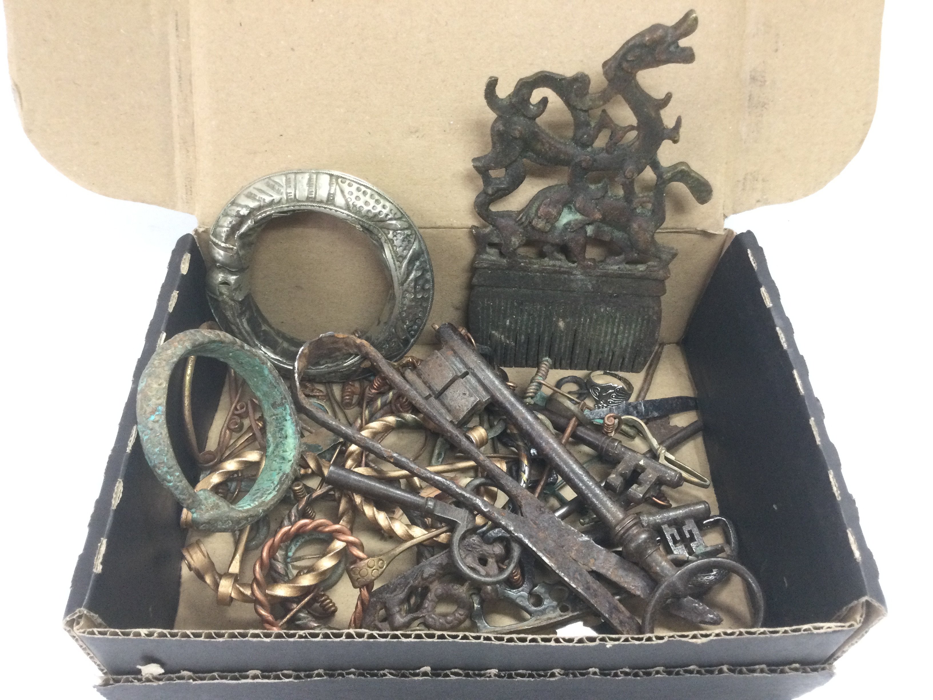 A box of antiquarian items including some bronze examples. Shipping category B.