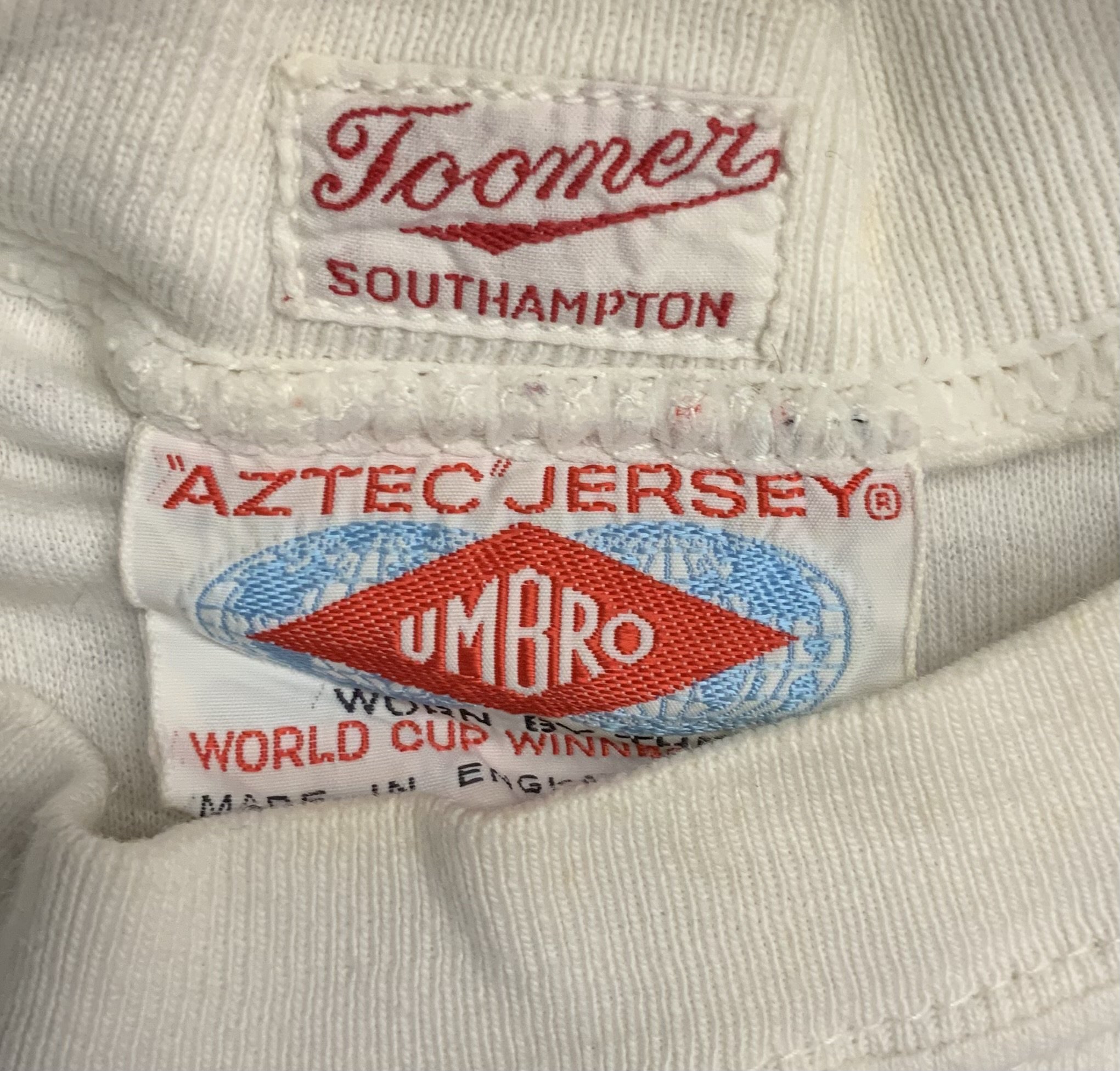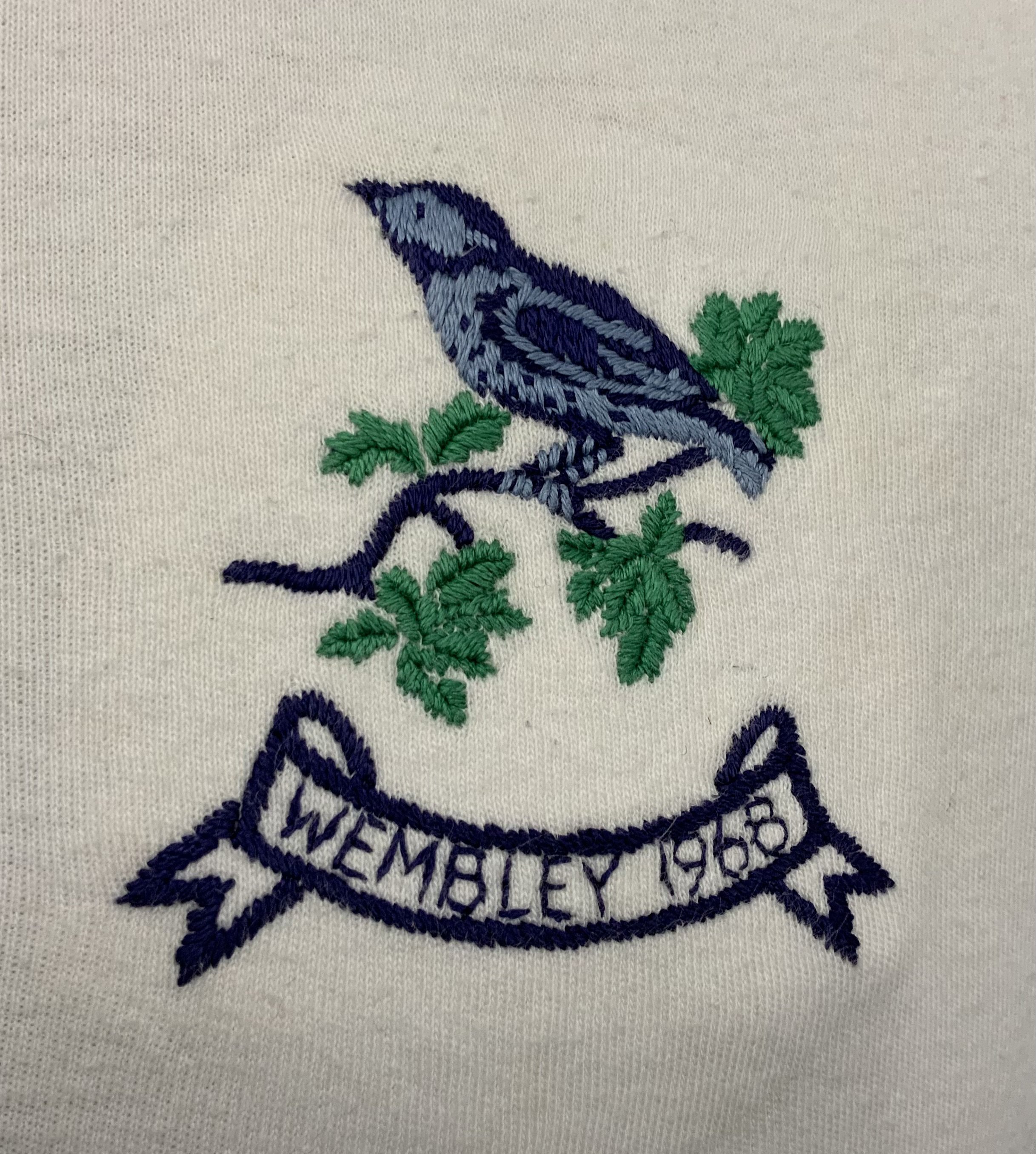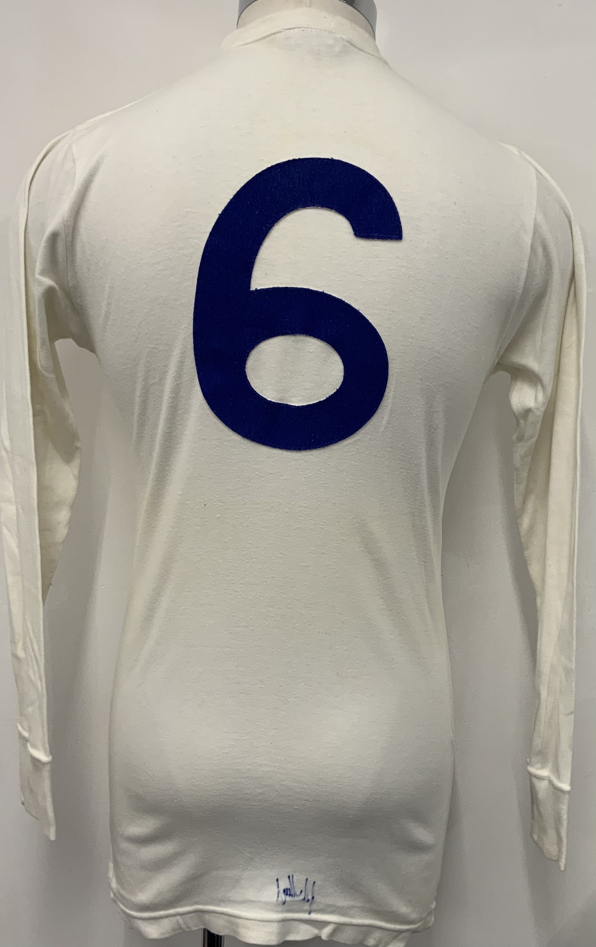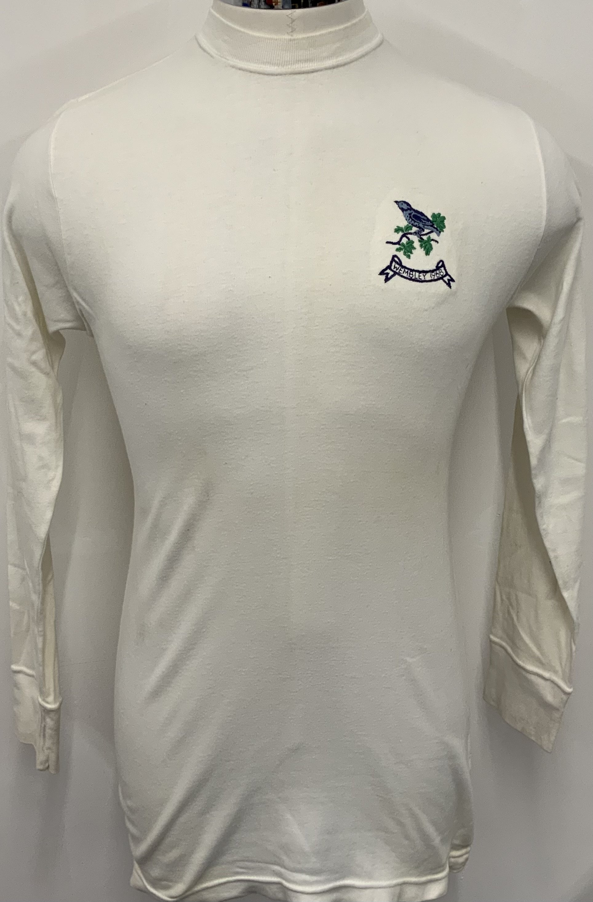 CLICK FOR INDEX West Brom 1968 FA Cup Final Match Worn Football Shirt: White long sleeve number 6 shirt with Wembley 1968 below embroidered throstle. Inside back near hem it has been signed by John Kaye who wore this shirt when West Brom won the FA Cup beating Everton. This is a unique historical shirt because John got injured and a substitute was brought on for the first time ever in an FA Cup final. Very good condition.