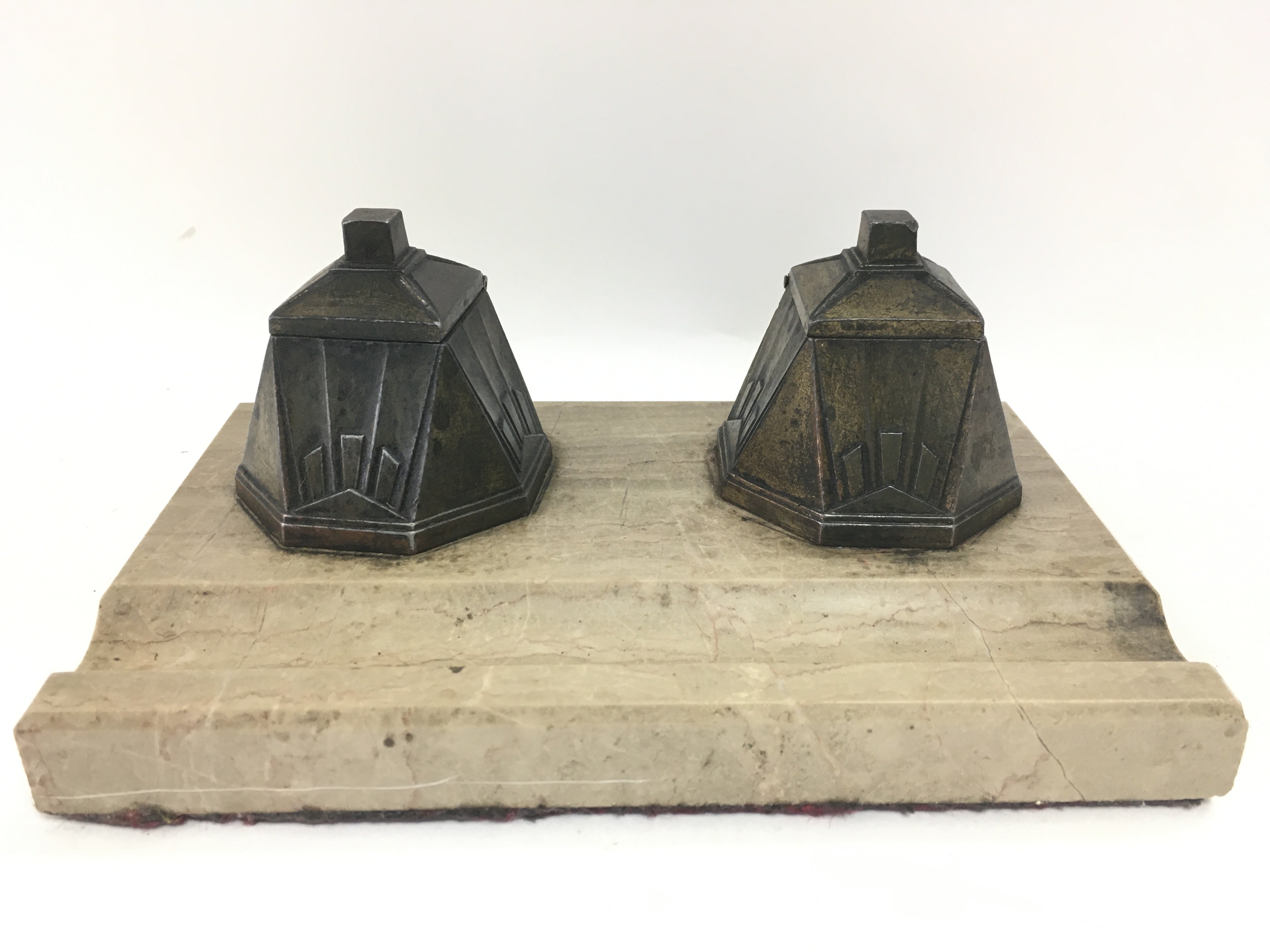 A 19th century desk piece with bronze pyramid shaped inkwells on a marble base