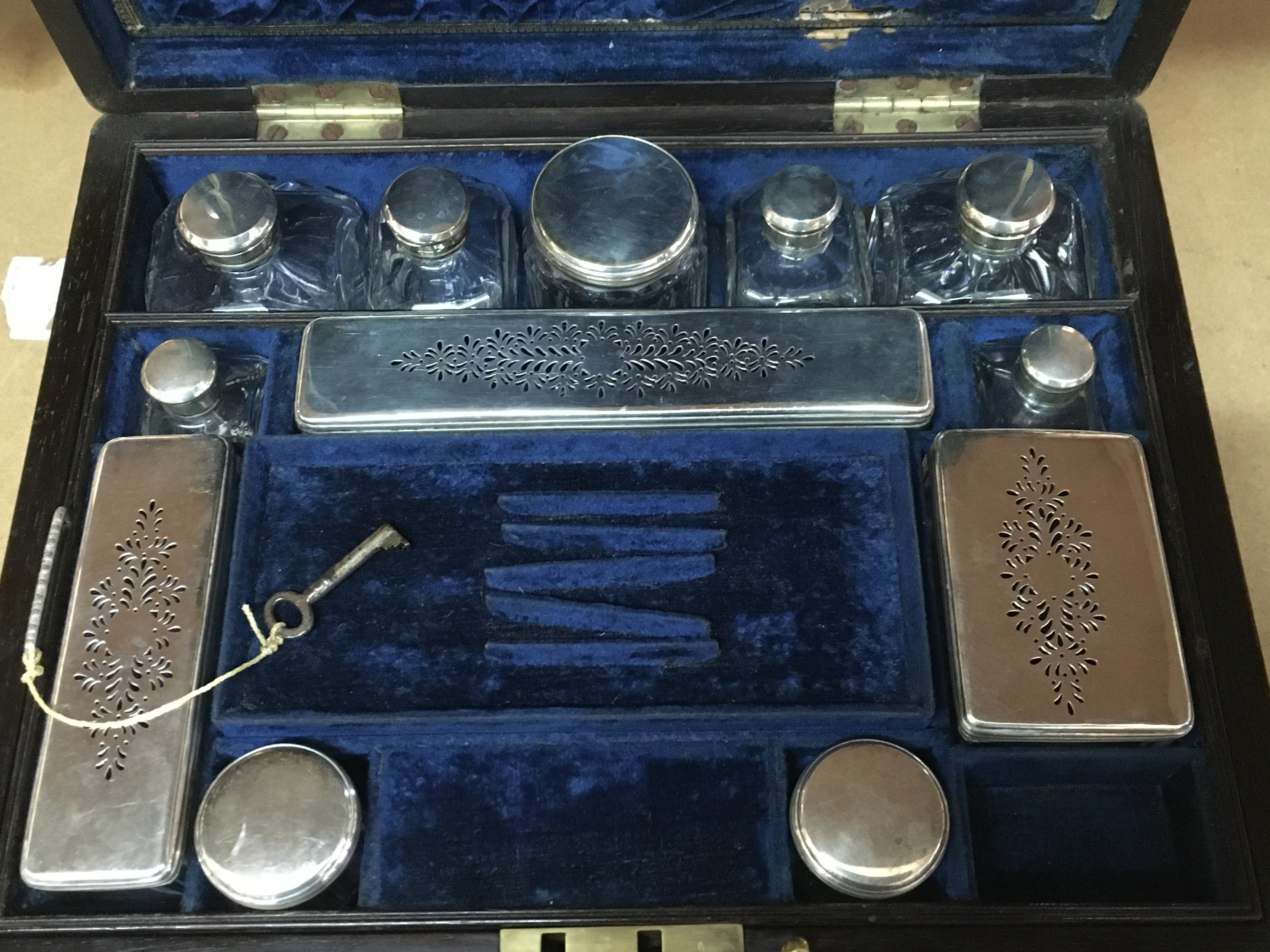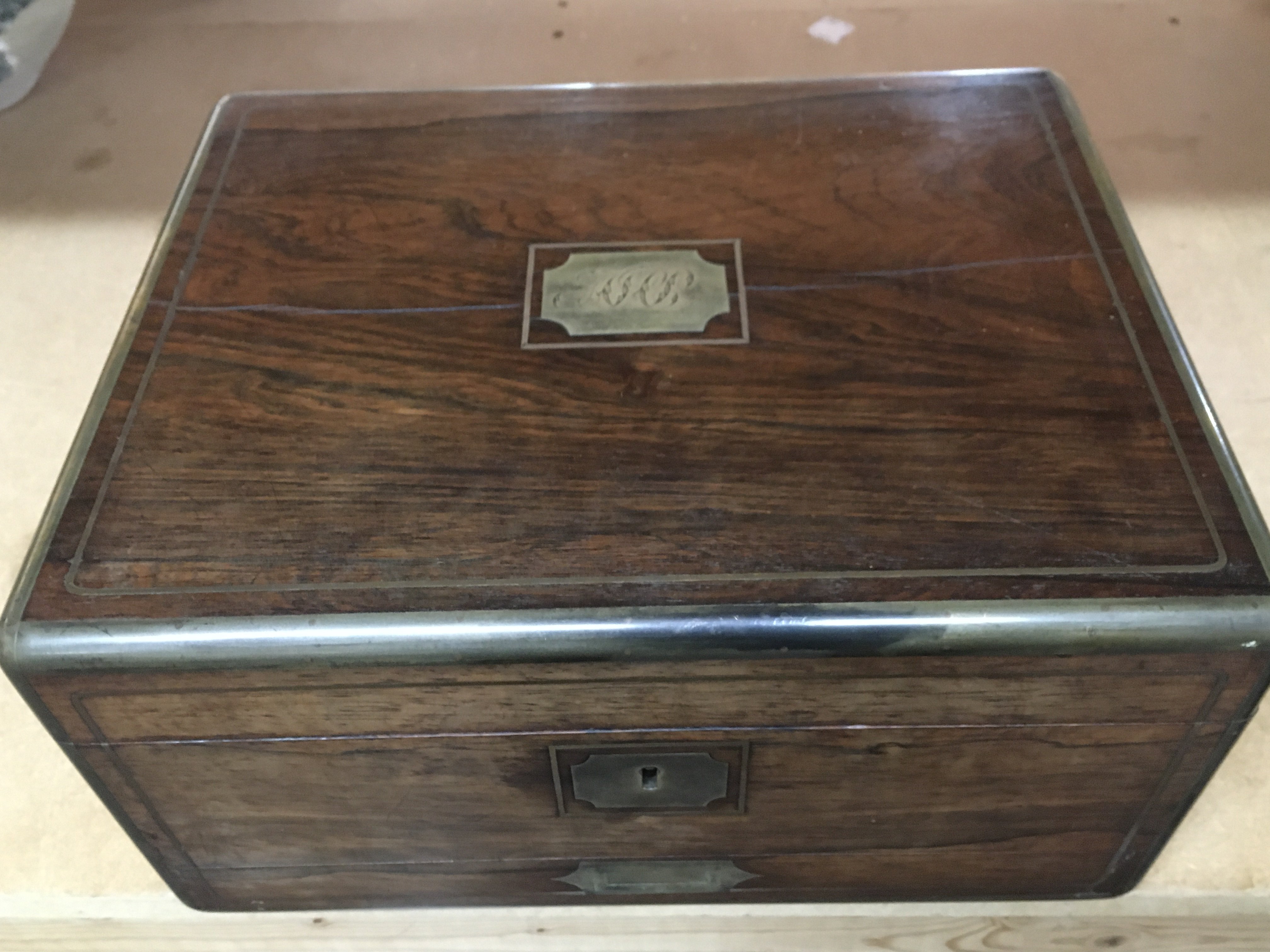 A George IV Rosewood and brass bound travelling toilet box with fitted interior including glass jars and boxes, lift out vanity mirror and drawer under