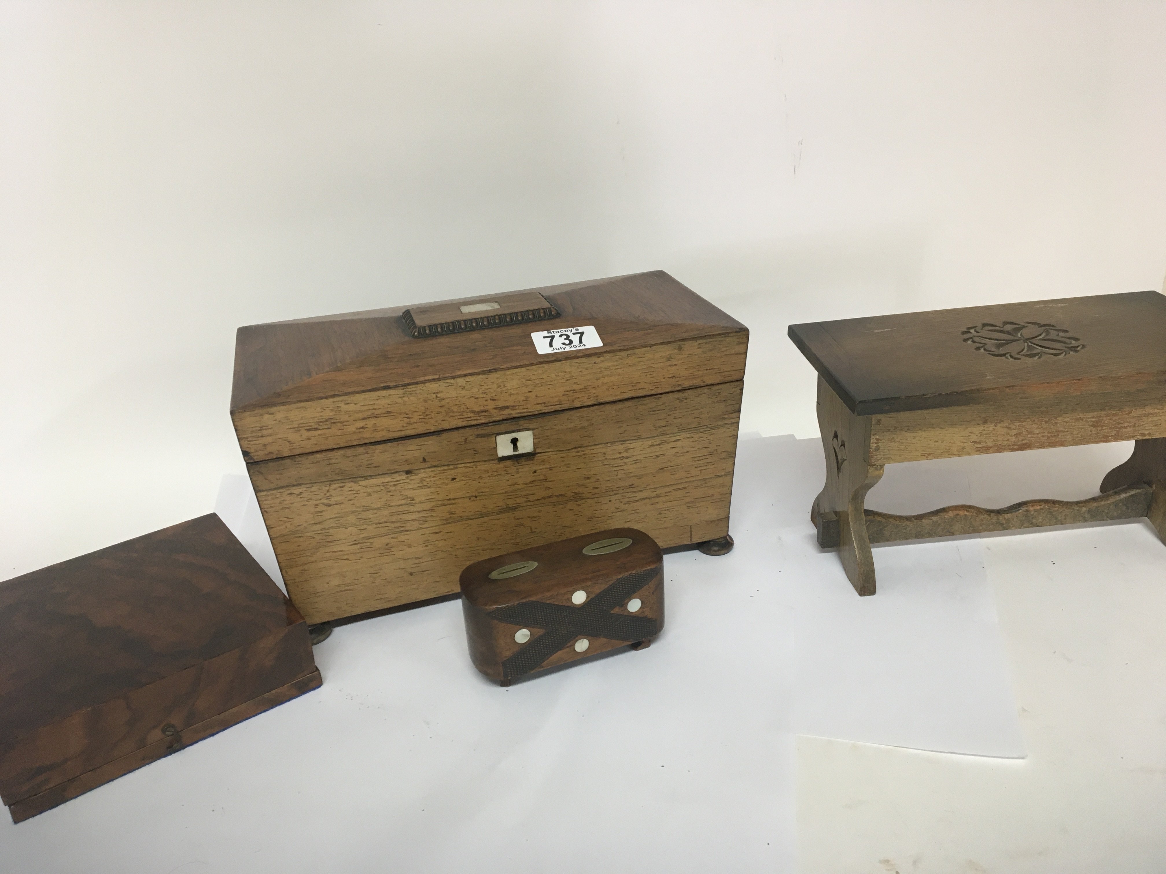 A 19th Rosewood tea Caddy with two sections a small walnut games box and a small table casket and treen money box. NO RESERVE