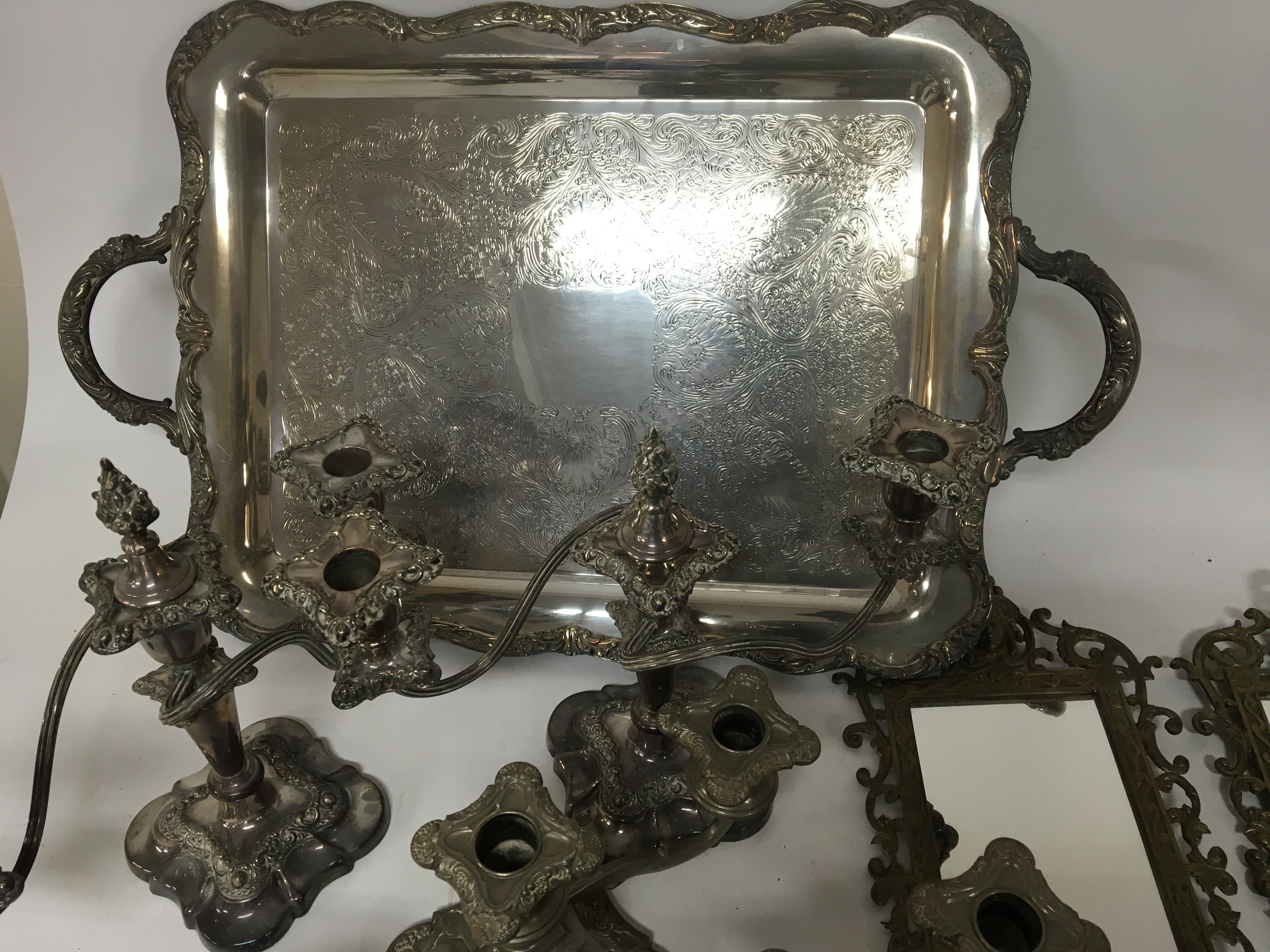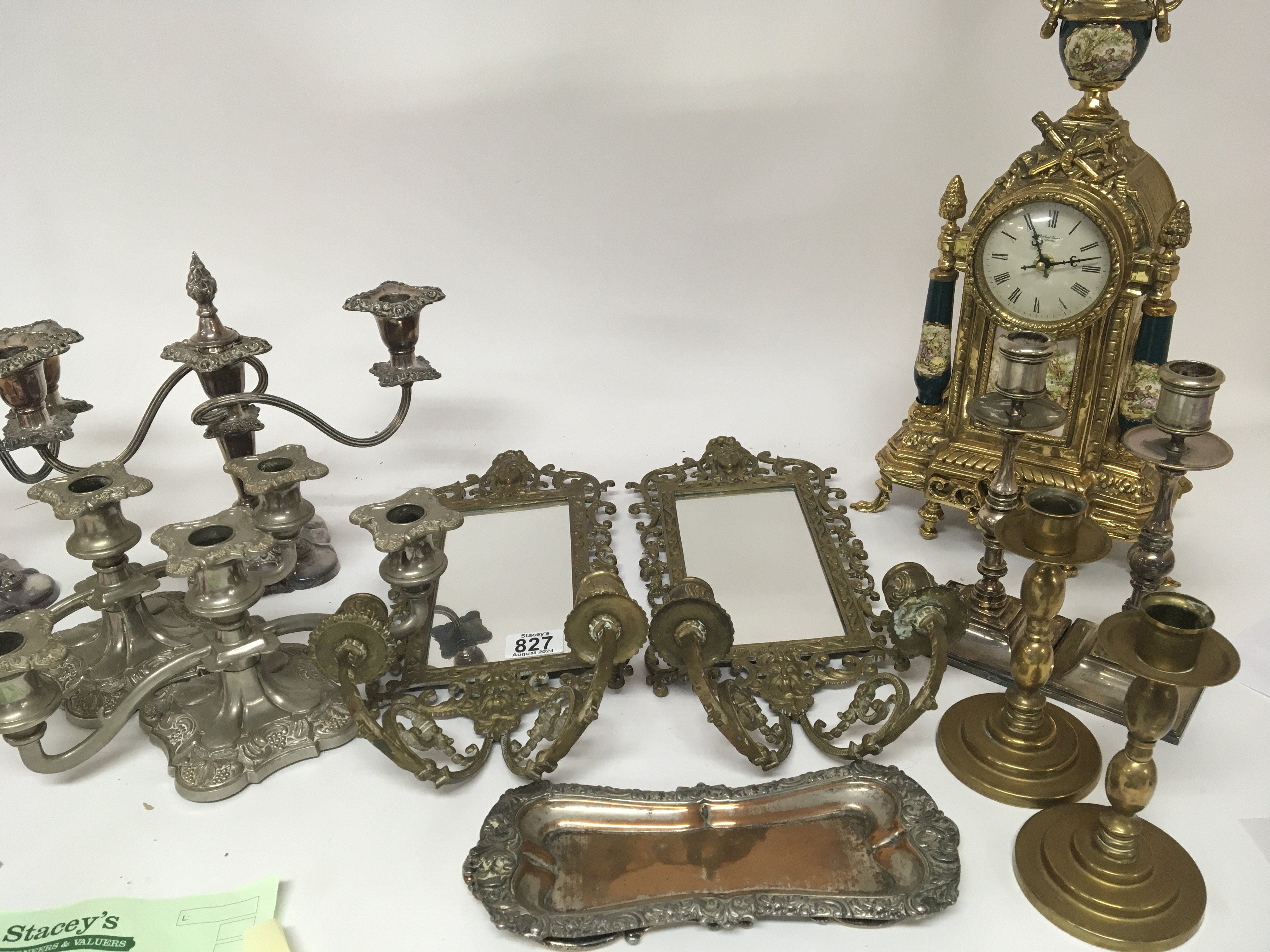 A pair of brass Girondelle a collection of candle sticks and candelabra a French style clock and a silver plated tray.