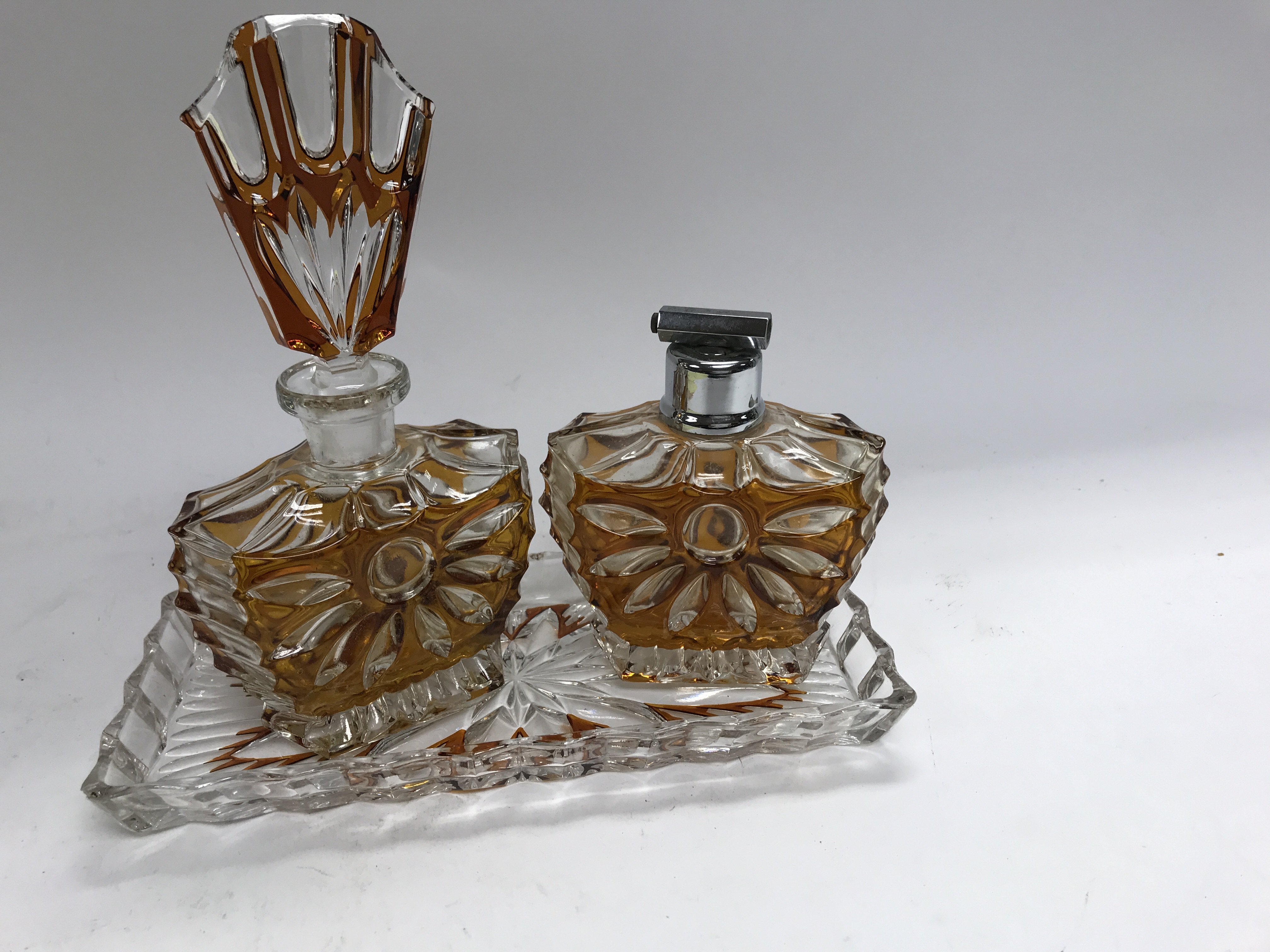 A Art Deco glass perfume bottle with matching atomiser and tray . CAT D. NO RESERVE