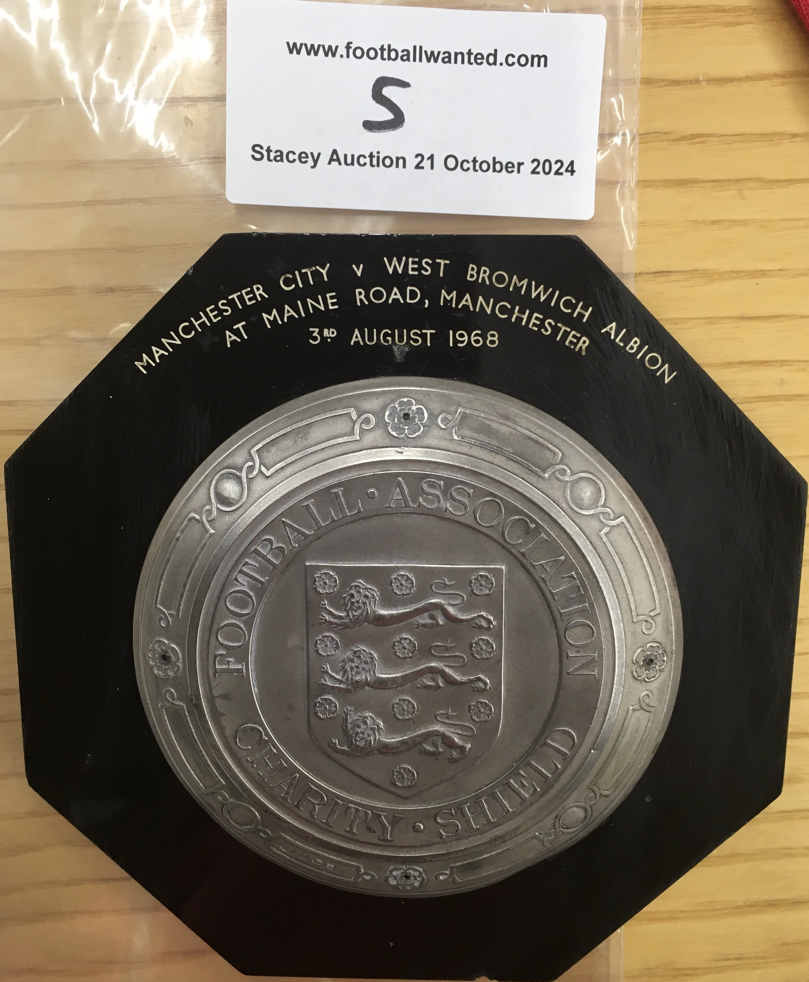 West Brom 1968 Charity Shield Players Plaque: Issued to John Kaye for playing in defeat to League Champions Manchester City at Wembley. Match details to outer with metal middle stating Football Association Charity Shield.