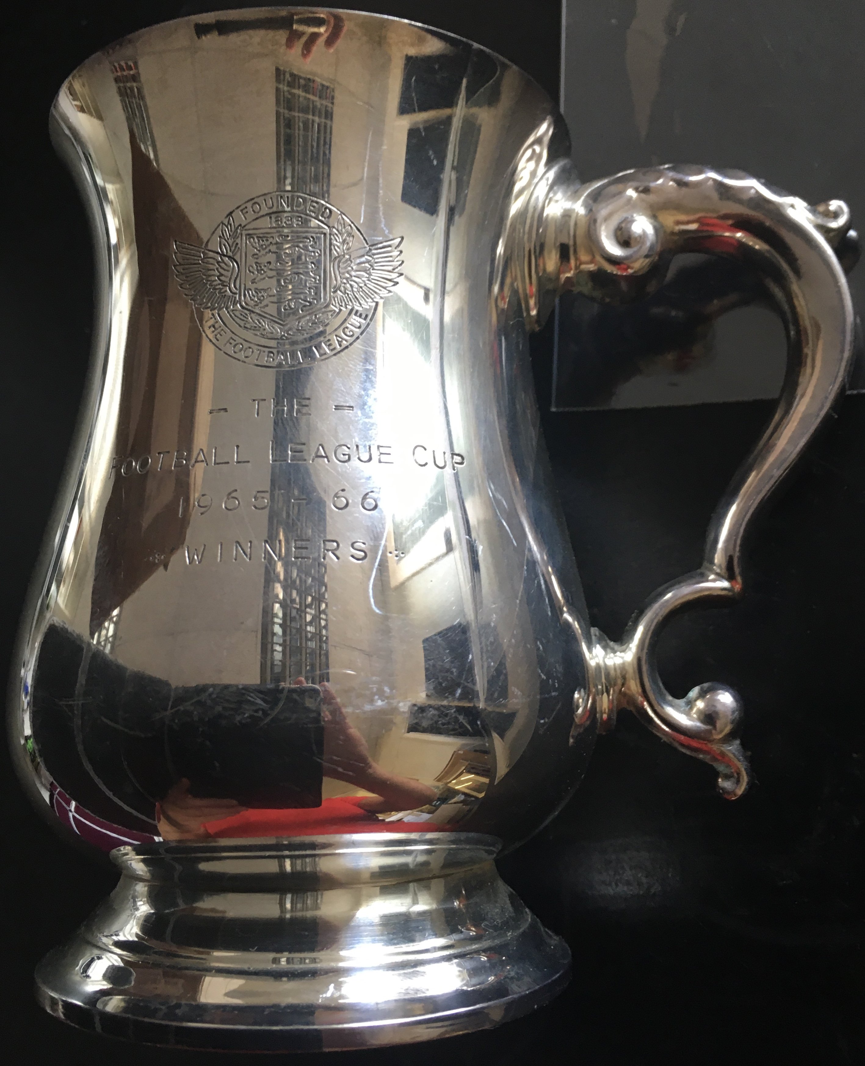 West Brom 1966 League Cup Final Winners Tankard: Issued to John Kaye for playing in the home and away win over West Ham which was the last before they were played at Wembley. Heavy silver tankard has Football League badge and Football League Cup 1965-66 Winners engraved. EPNS to base. Good condition.