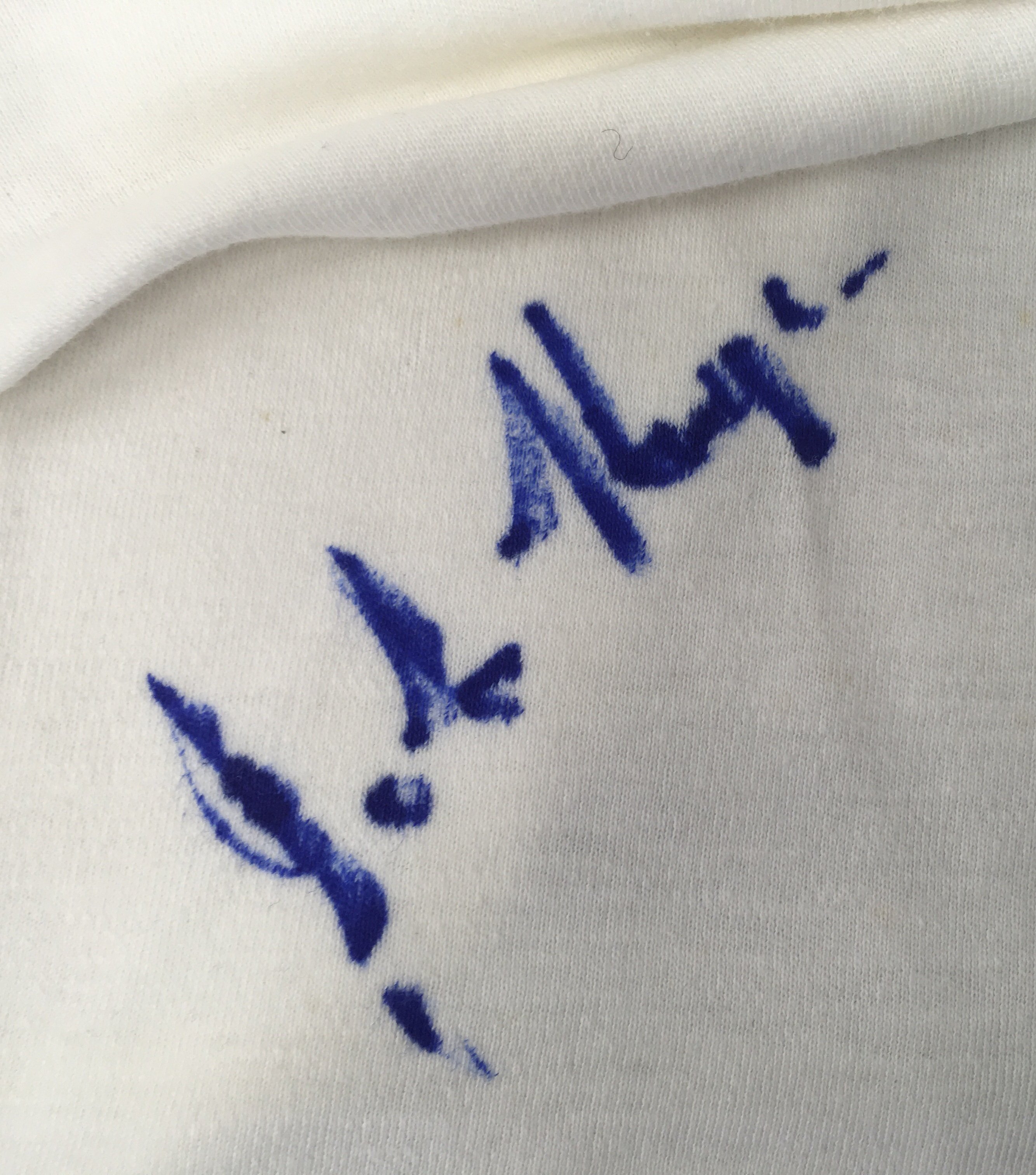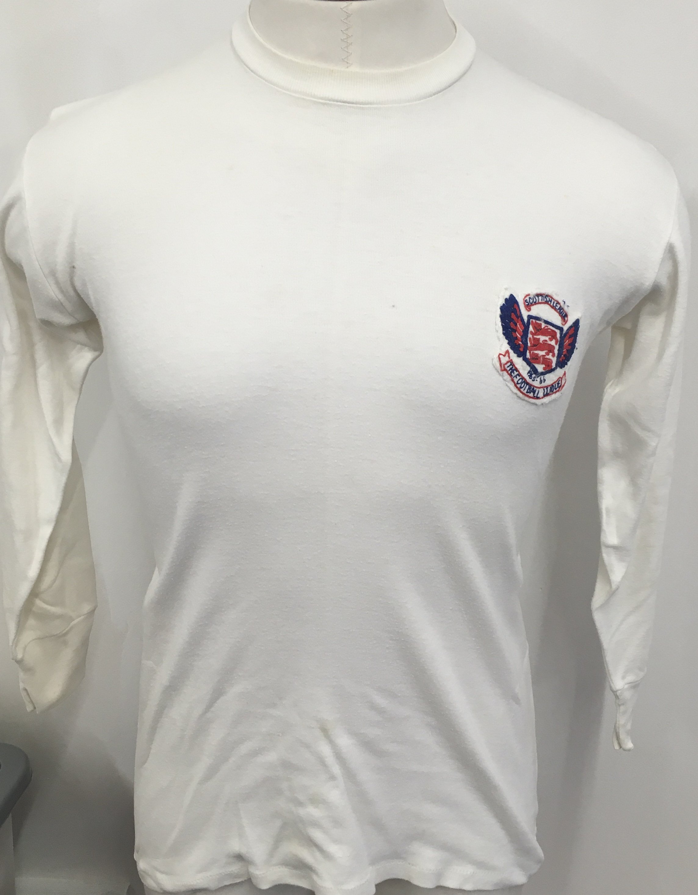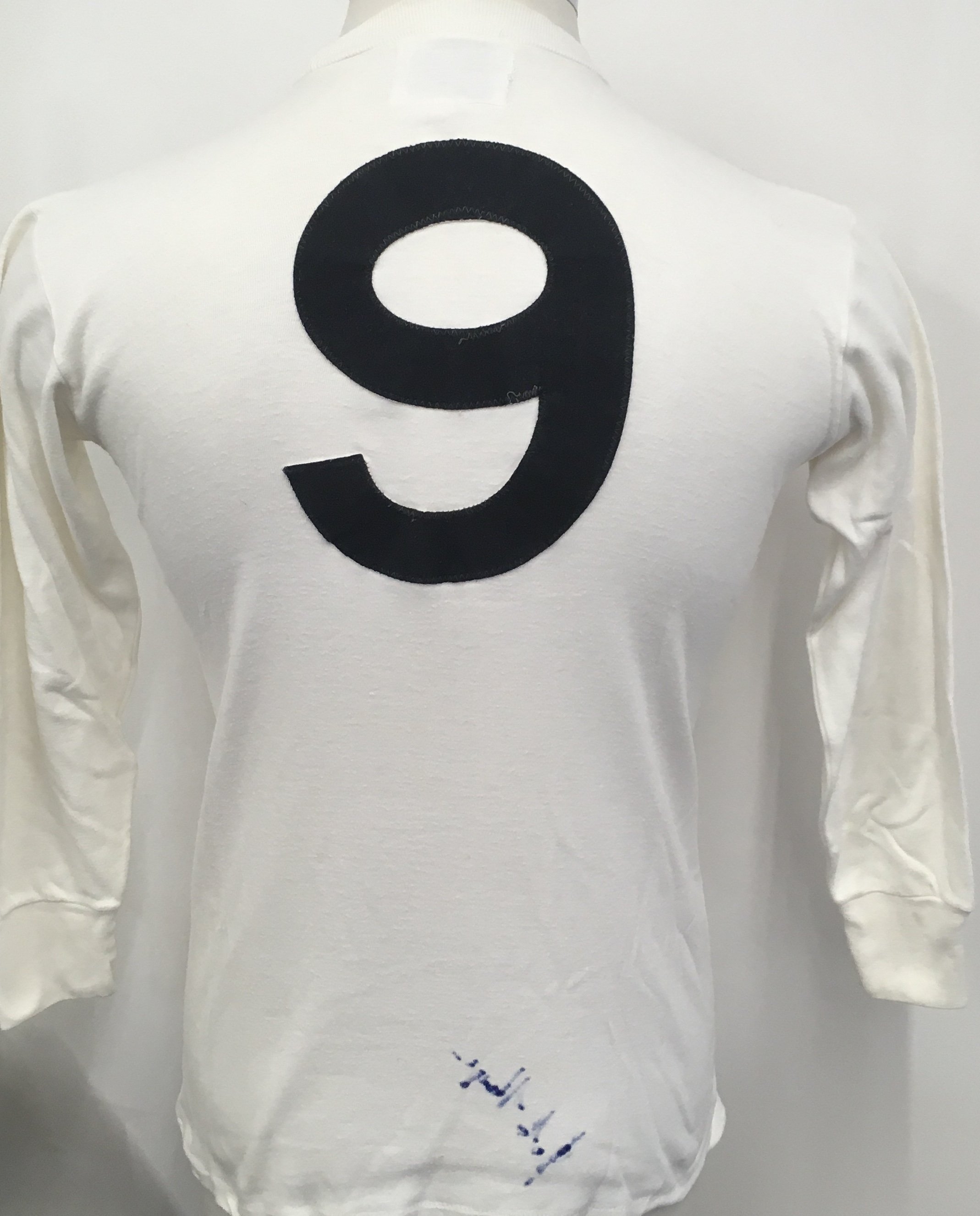 1966 English League v Scottish League Match Worn Football Shirt: White long sleeve number 9 shirt with match details embroidered either side of 3 Lions badge. Worn by John Kaye whilst playing in the match at St James Park Newcastle on 16 3 1966. Signed inside rear at the bottom by Kaye. Good.