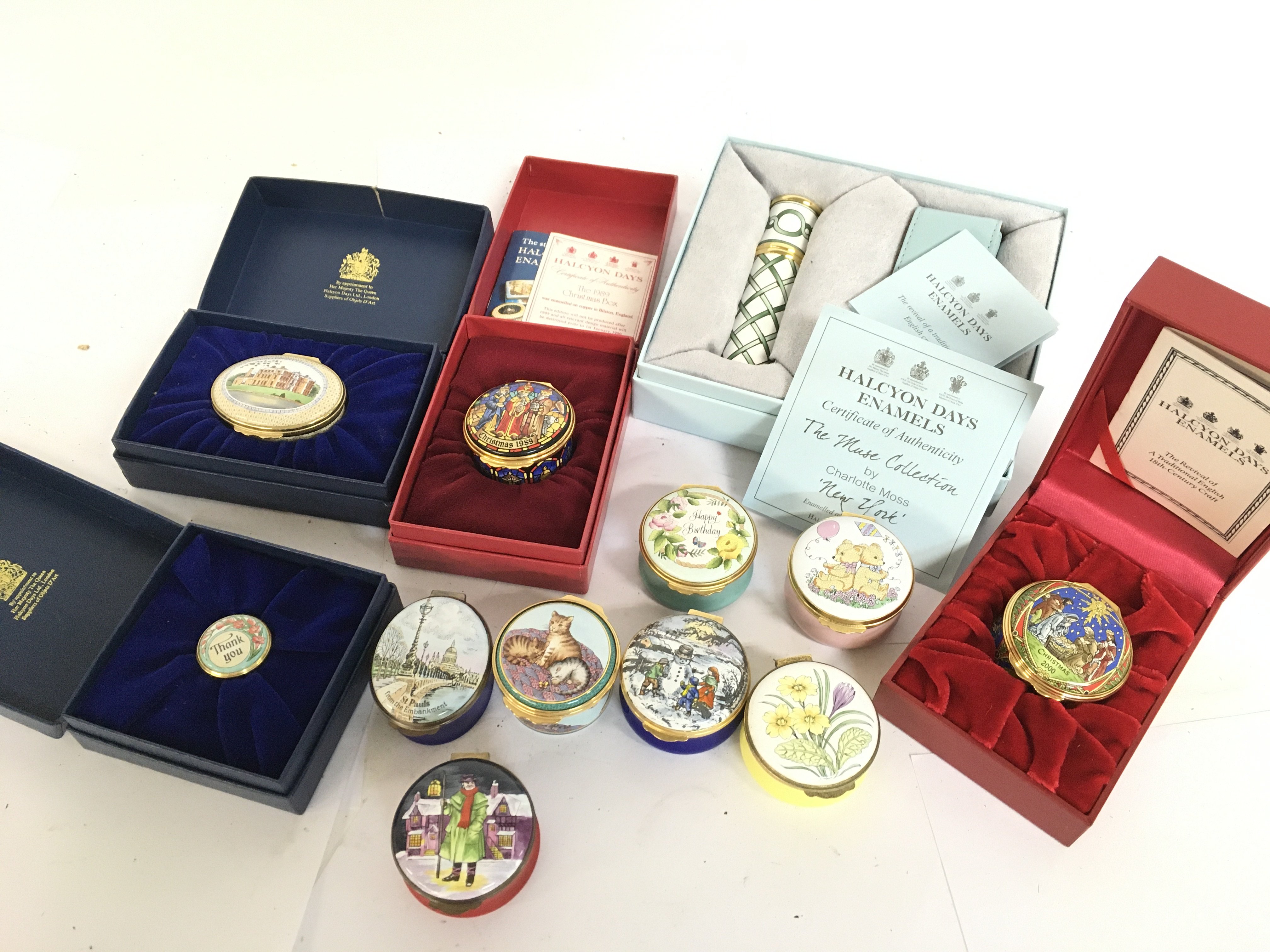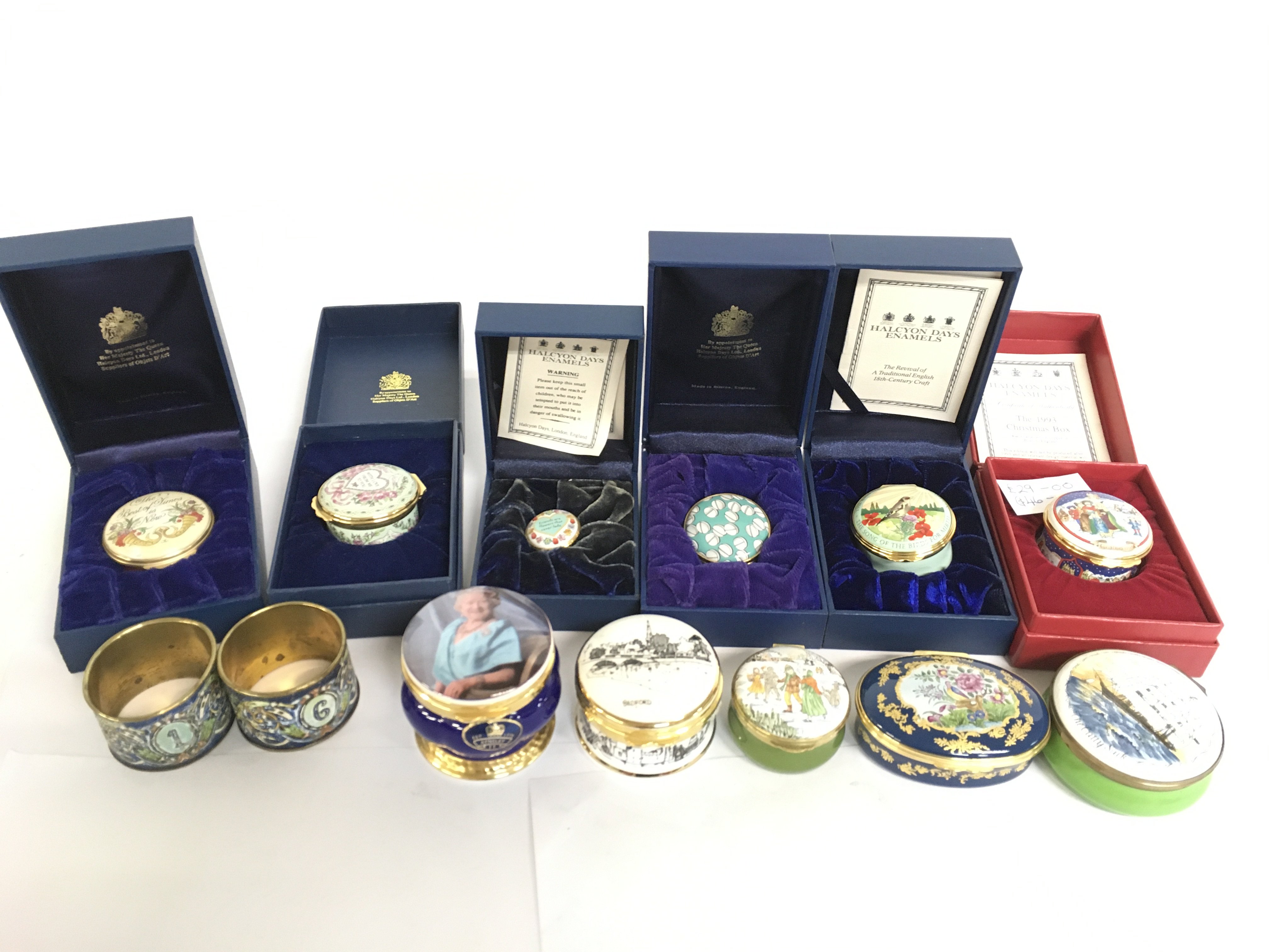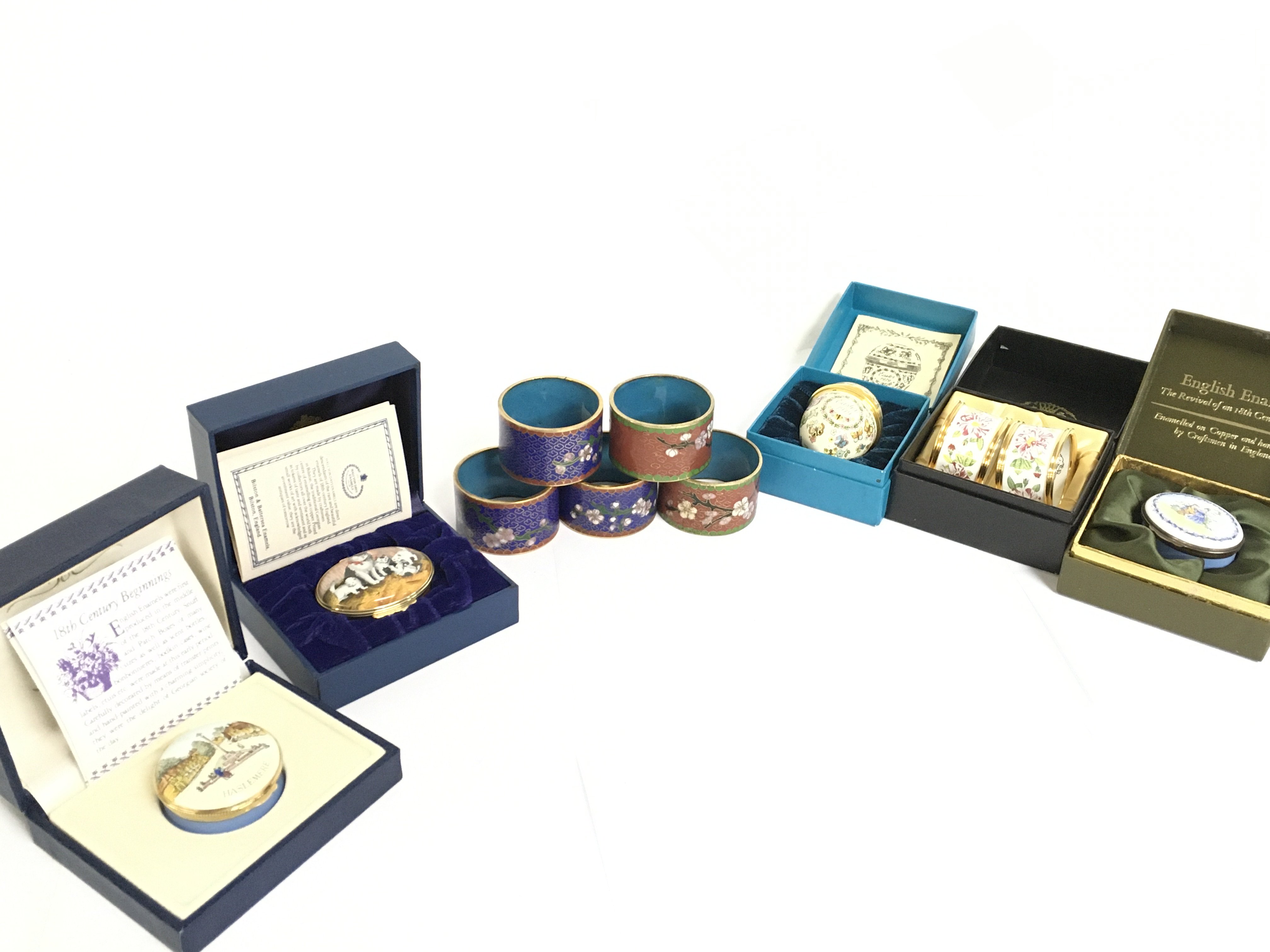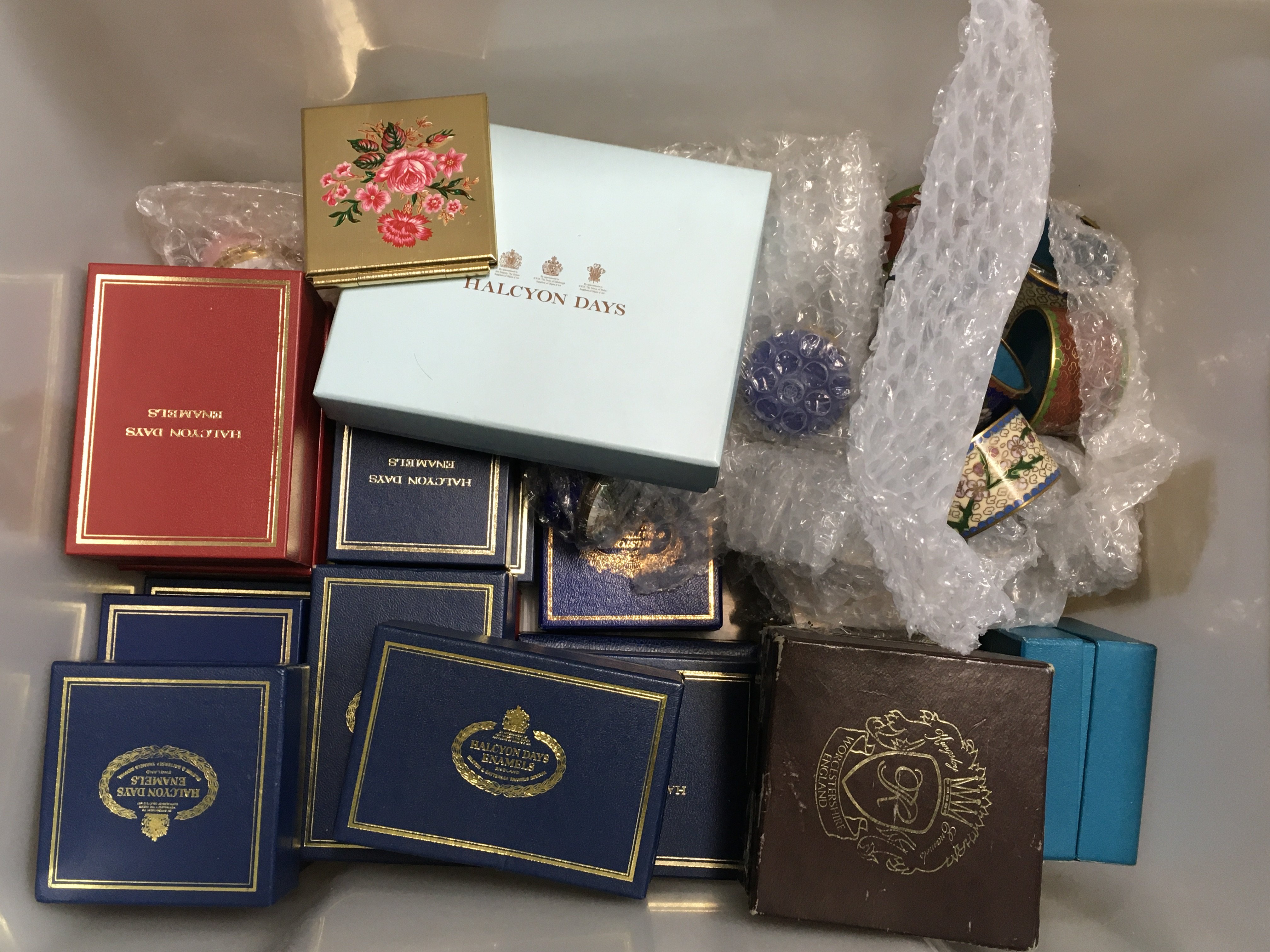 A collection of Halycon Days enamel boxes, some boxed. Also including Cloissonne ware and other enamel boxes. This lot cannot be posted