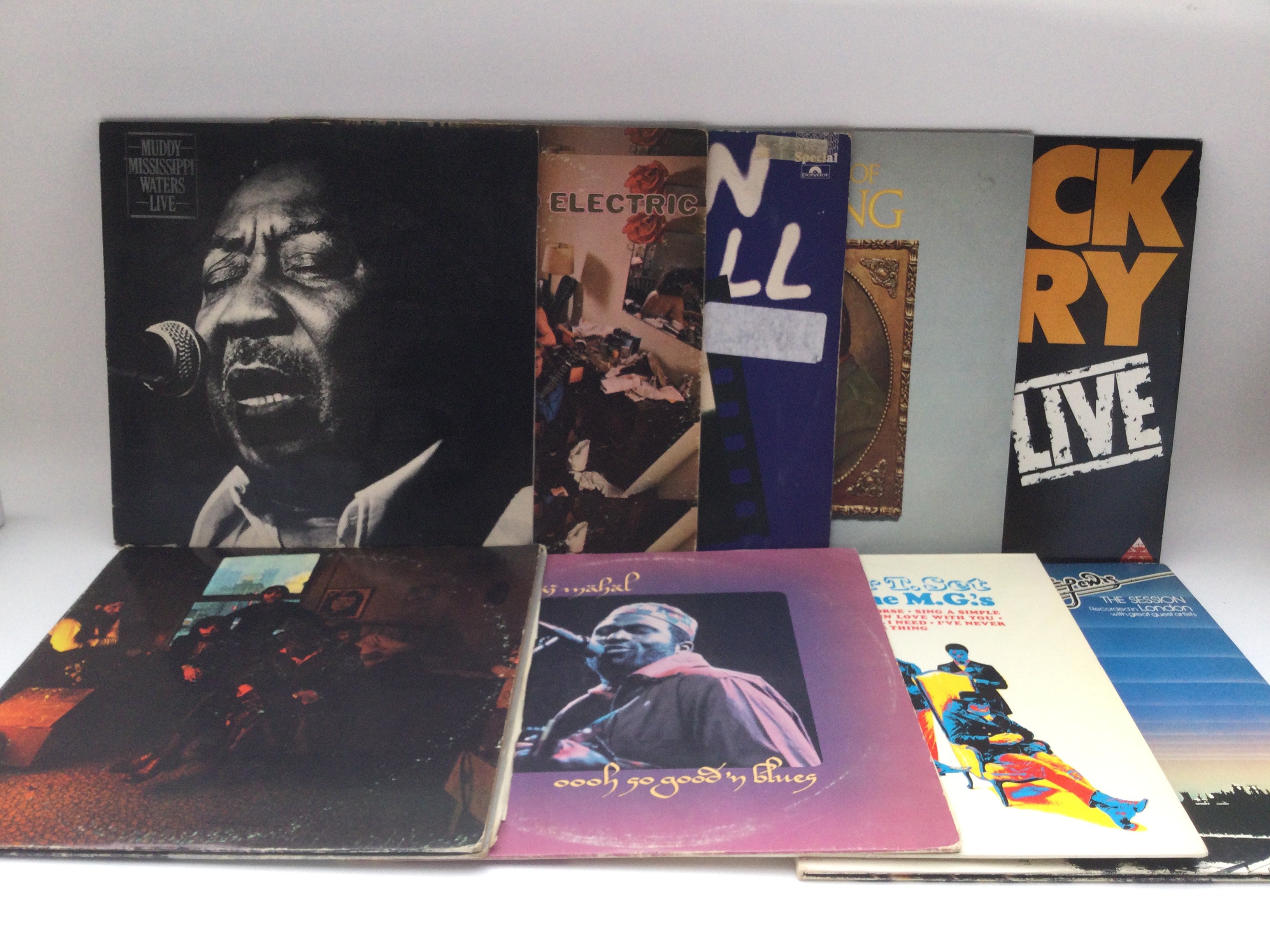Nine blues rock LPs by various artists including Pacific Gas & Electric, Muddy Waters, BB King and others. Includes US and German pressings.