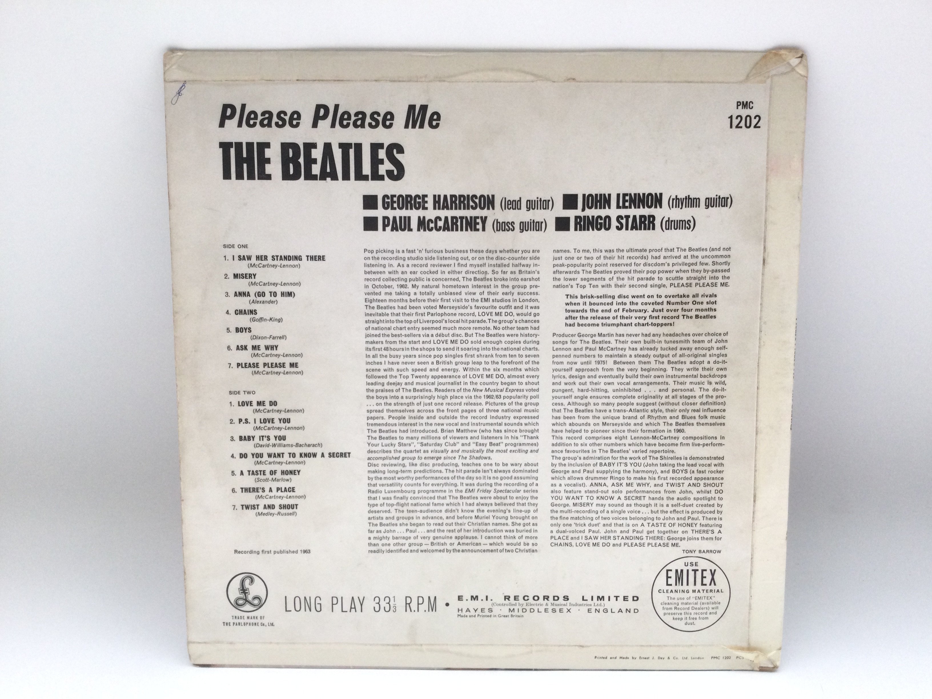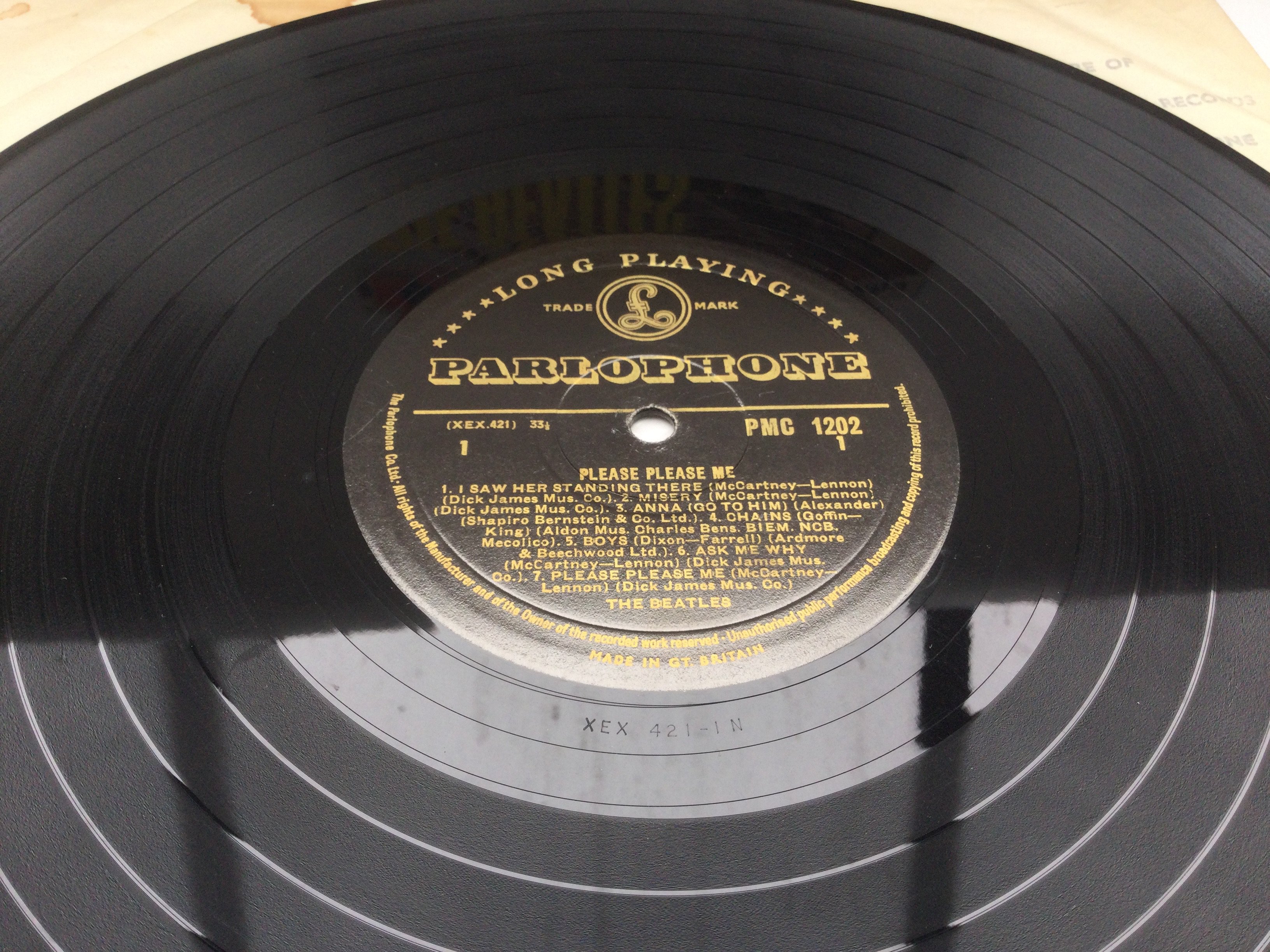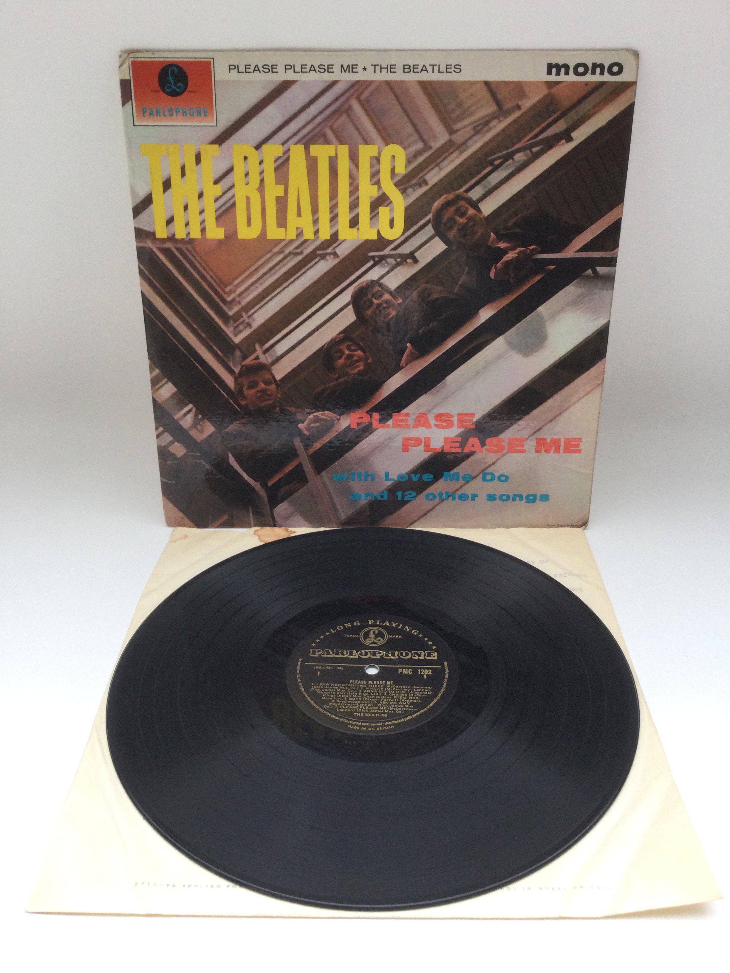 A first UK pressing of The Beatles 'Please Please Me' LP in mono with black and gold centre labels, Angus McBean credit aligned to the right of front cover and Dick James publishing credits. Vinyl Ex. Cover is bumped in corners and flipbacks are creased.