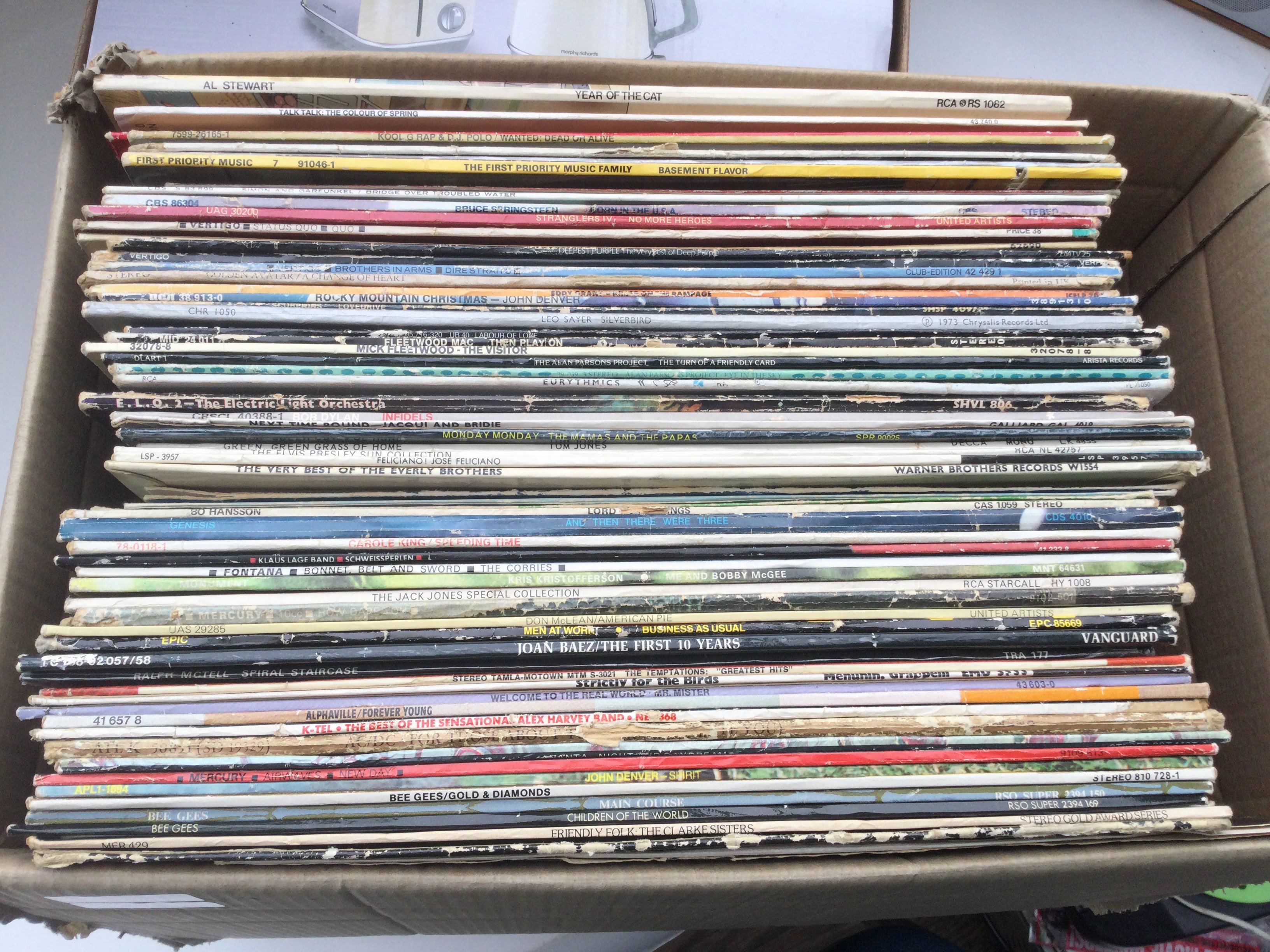 A box of LPs and 12" singles by various artists including Hawkwind, Iron Maiden, AC/DC and others.