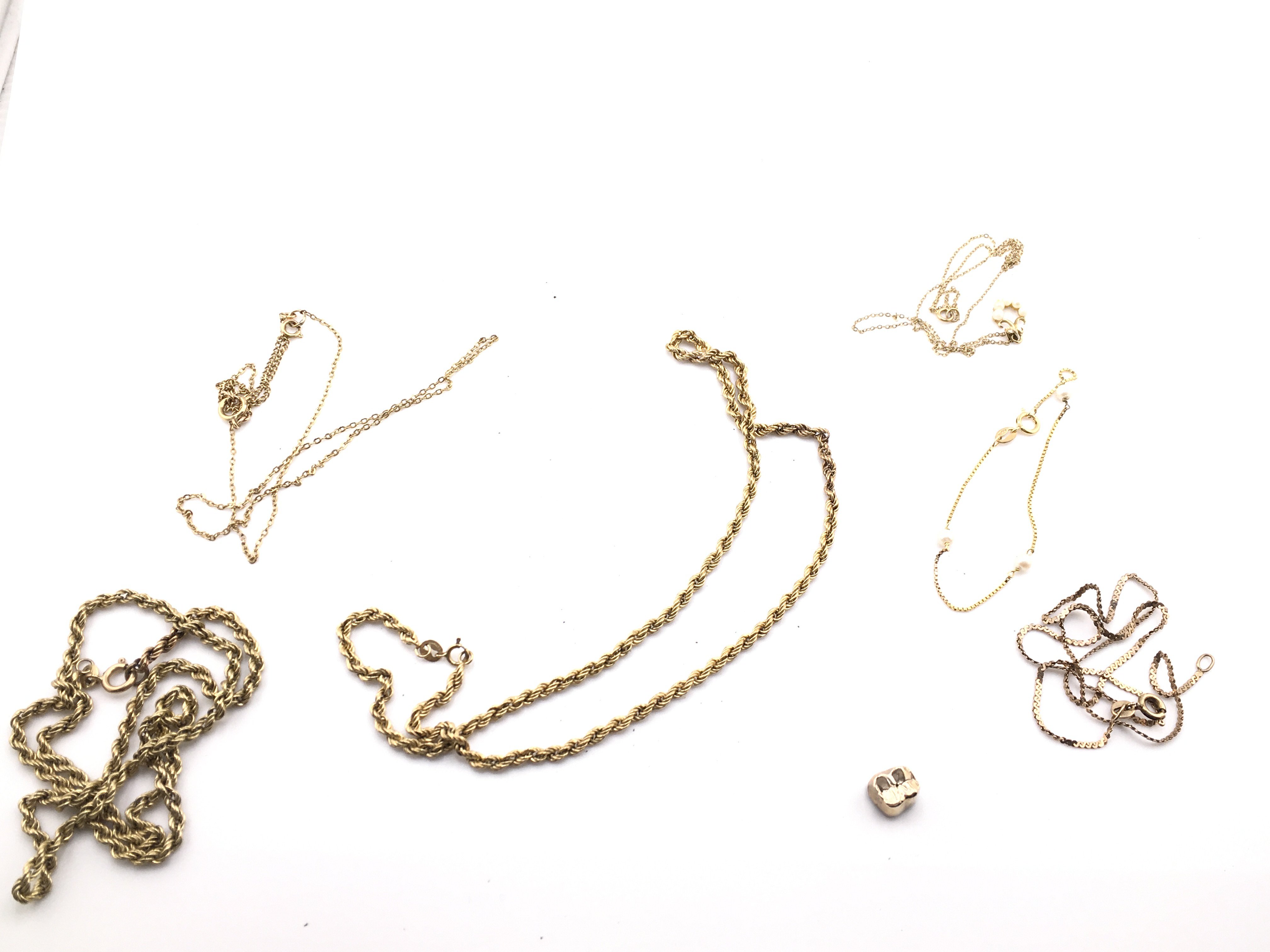 A collection of 9 carat gold necklaces and a gold tooth crown. Total weight 16.3 approximately. Postage category A