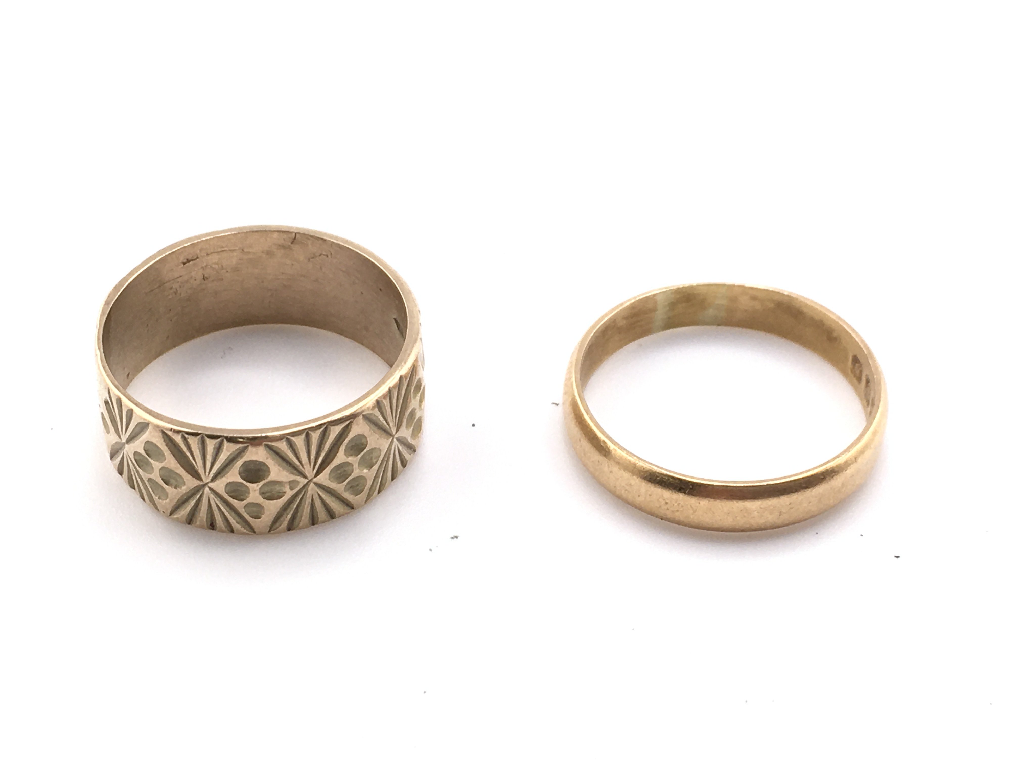A 22ct wedding band (4g) and a 9ct engraved band (5.2g). Size R. Postage category a