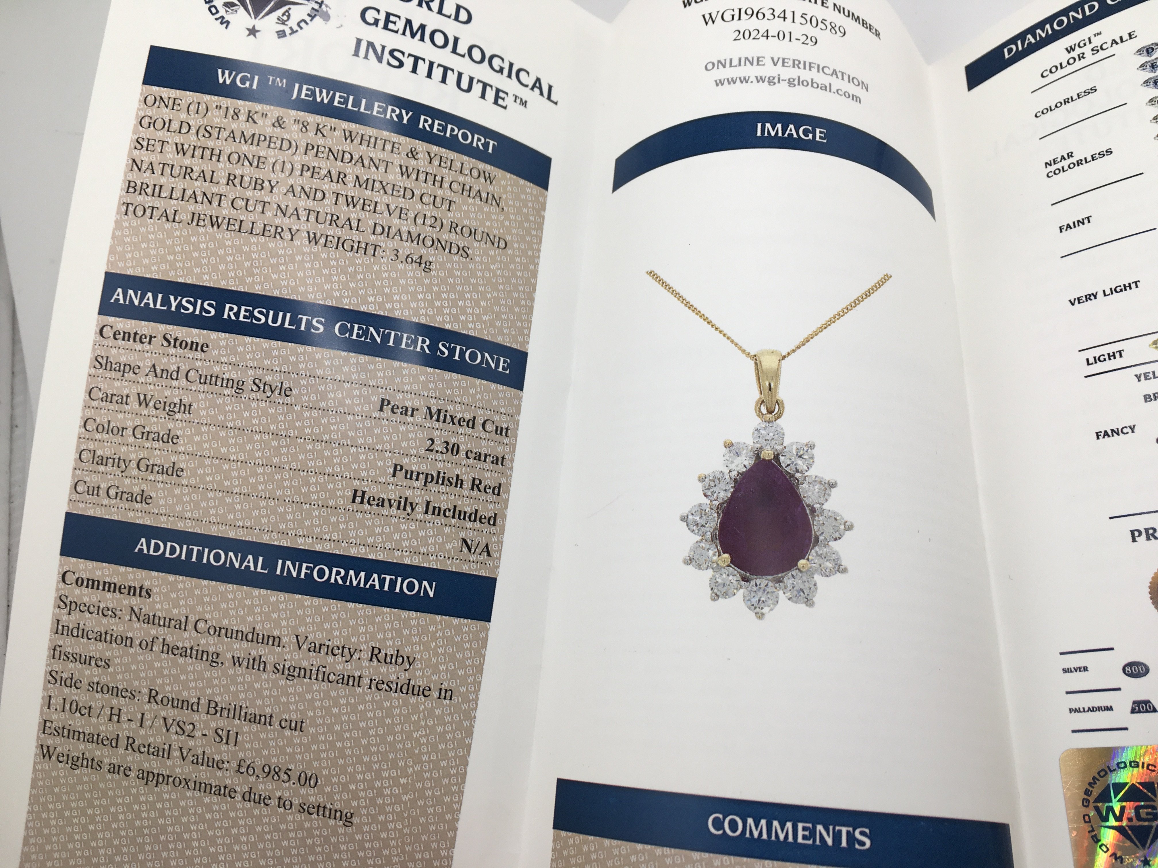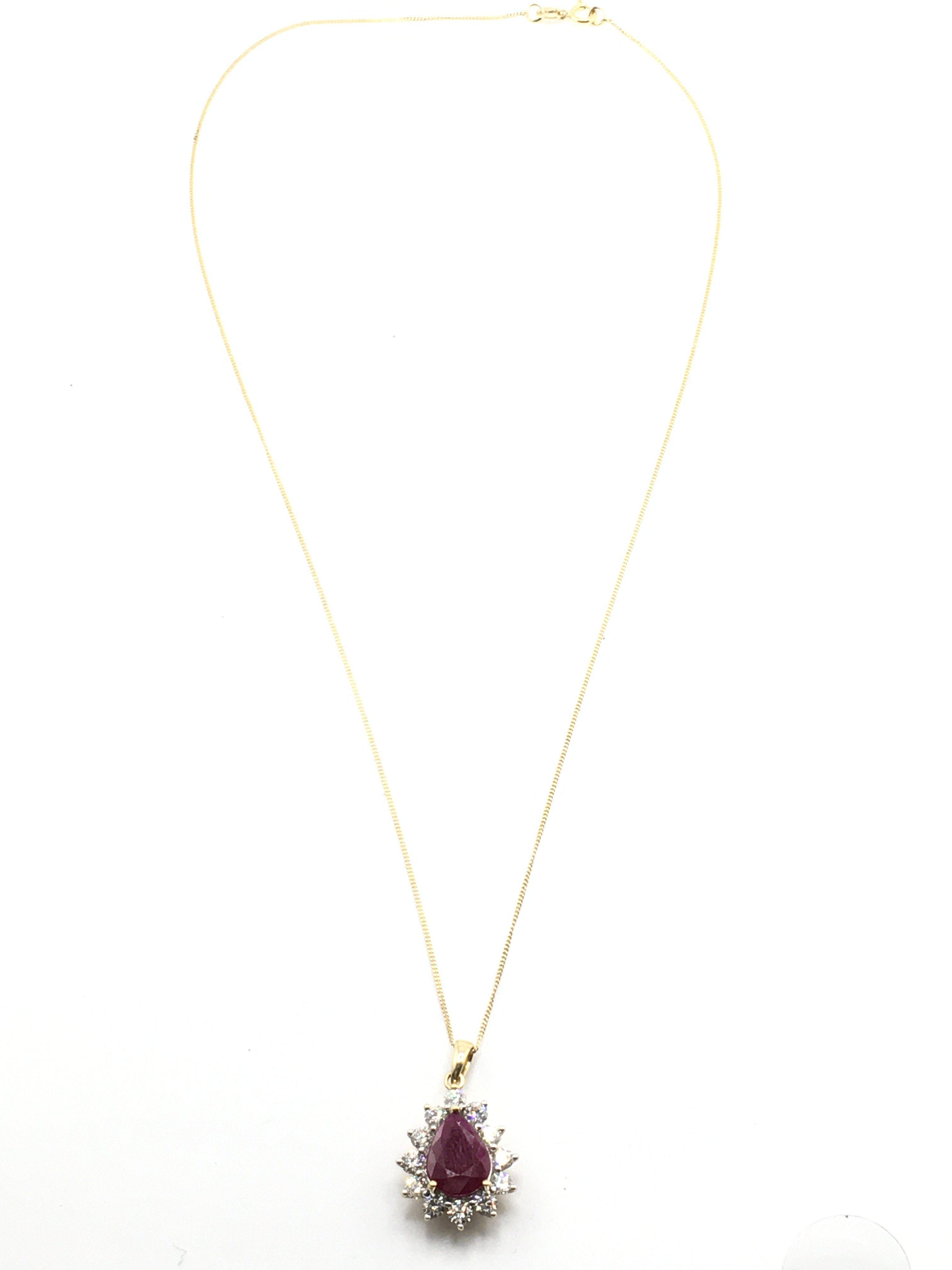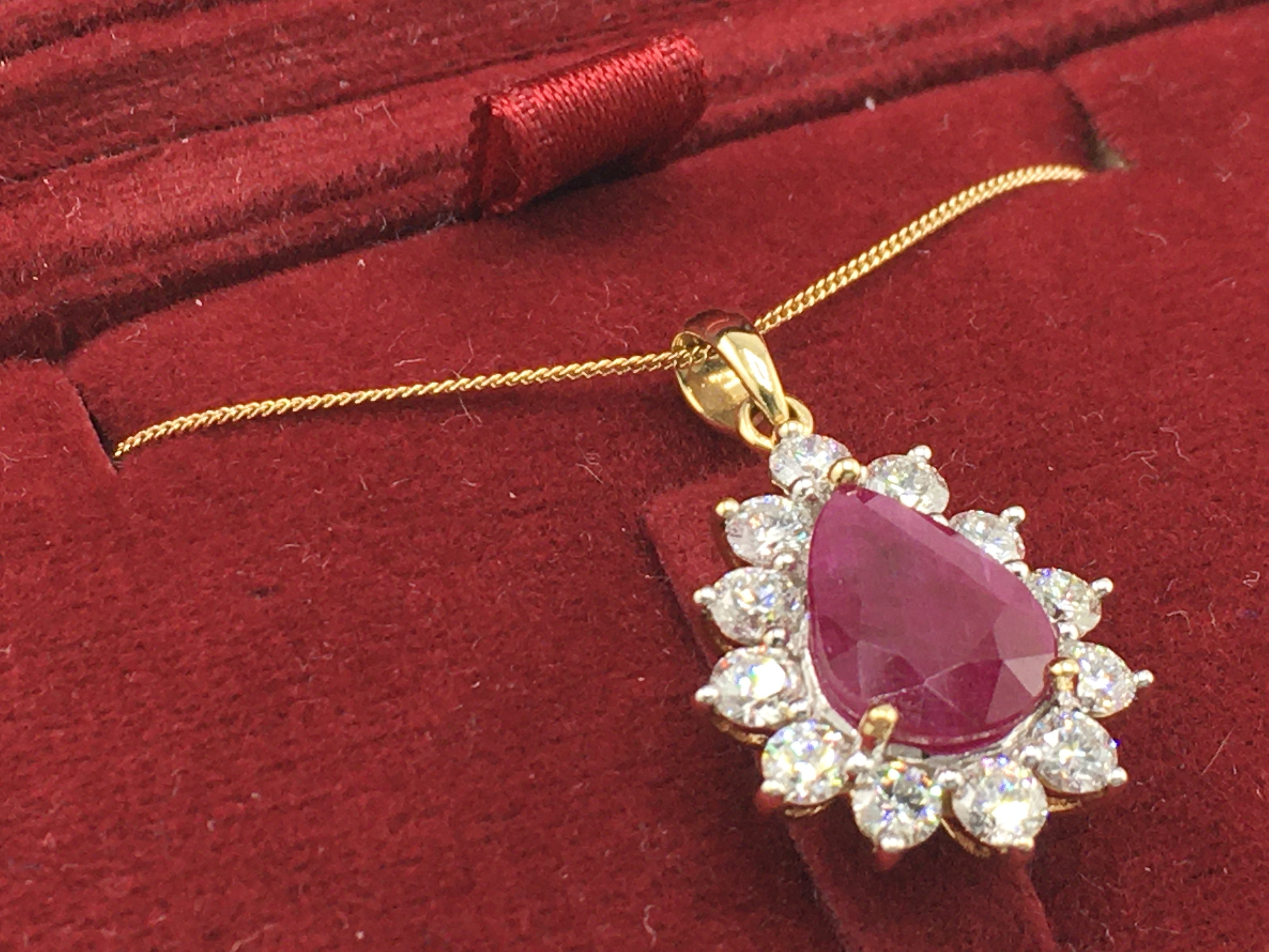 A certificated 18ct yellow and white gold pear shaped ruby and diamond halo necklace with 18ct yellow gold chain, boxed. Ruby 2.30ct. RBC diamonds 1.10ct. Cert no WGI9634150589. Total weight 3.7g. Postage category a