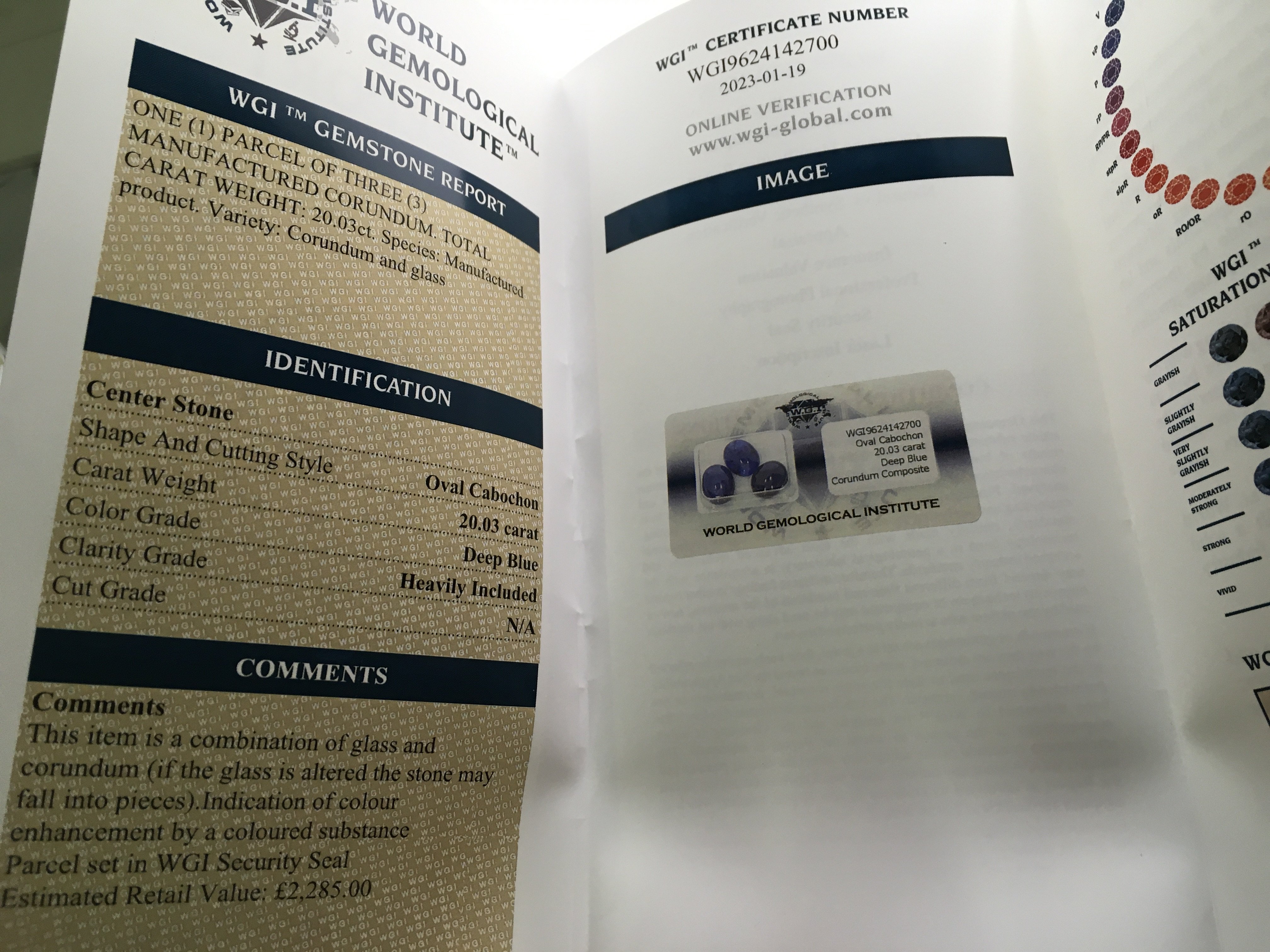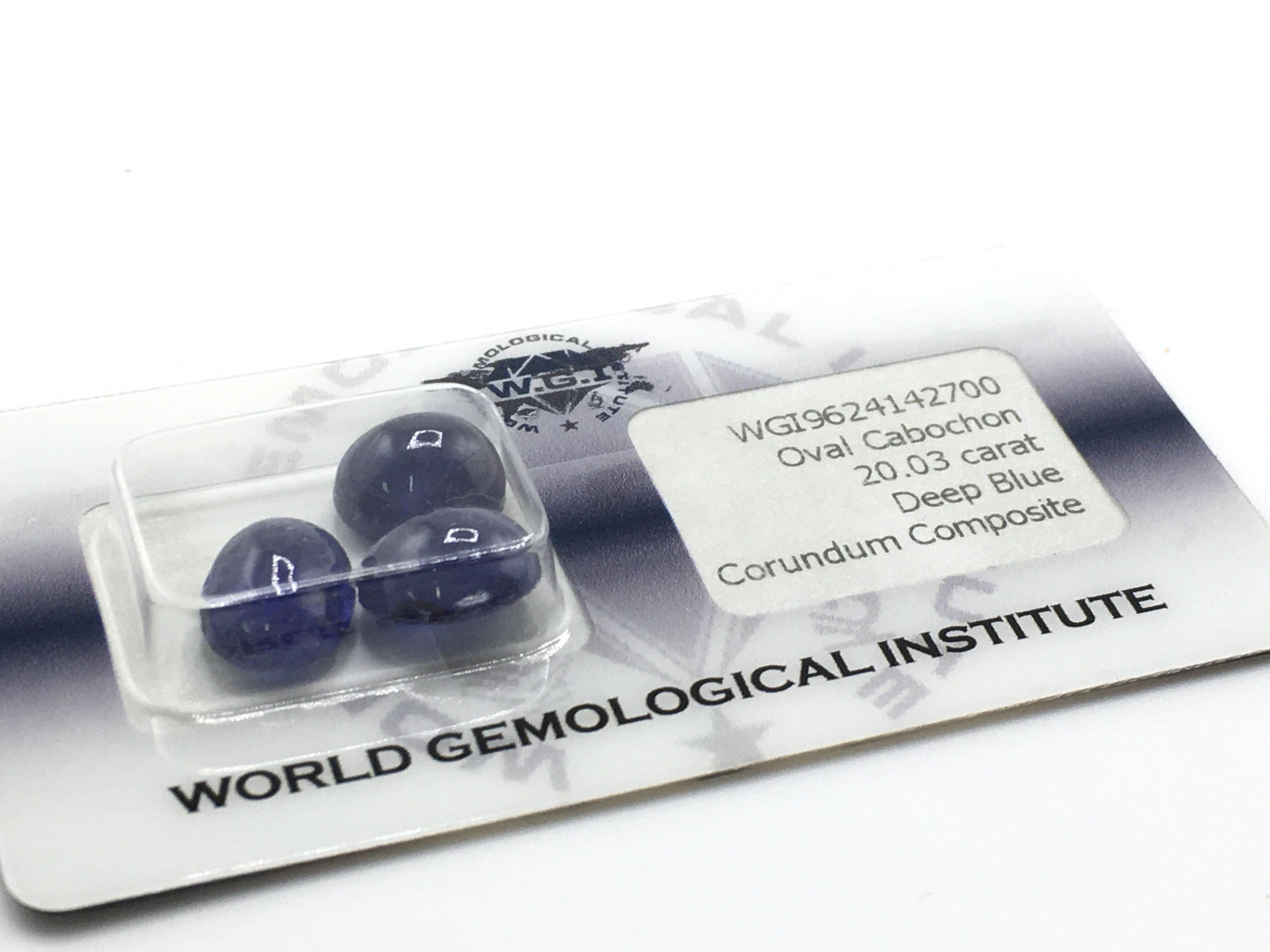 Three security sealed oval cabochon deep blue glass-filled sapphires, 20.03ct. Cert no.WGI9624142700. Postage category a