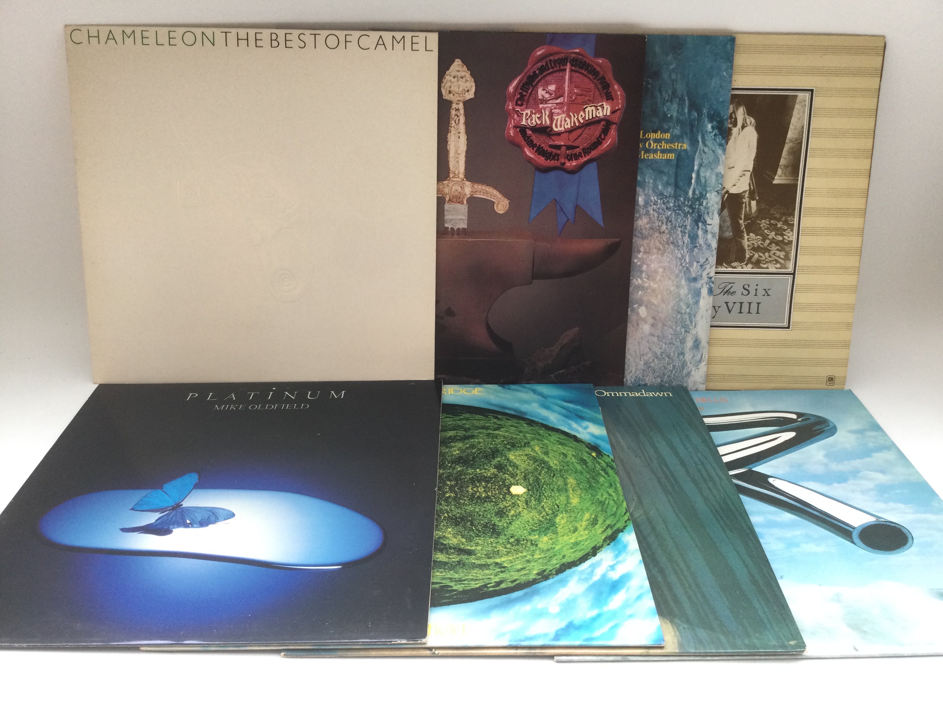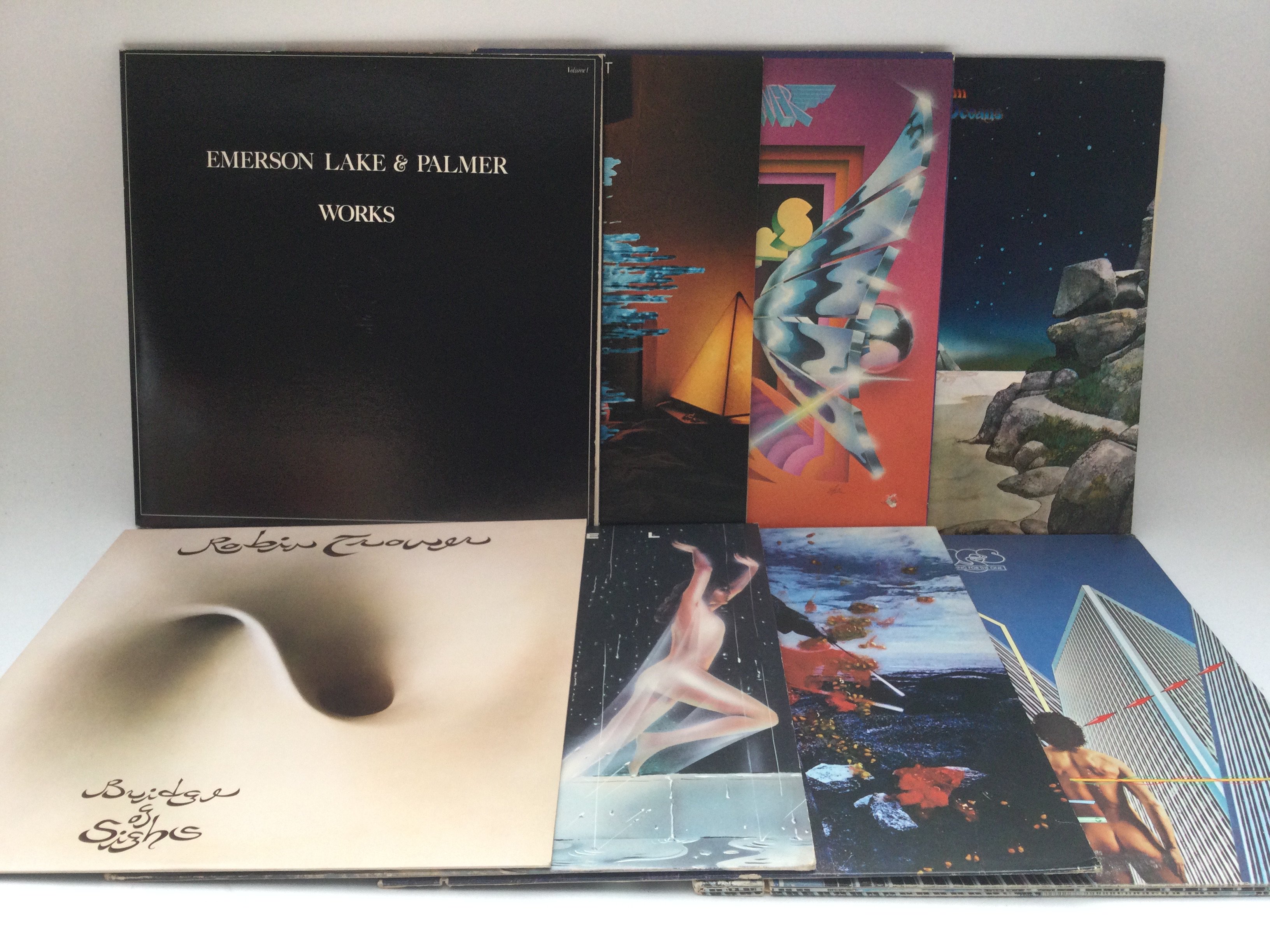 Two bags containing 16 prog rock LPs by various artists including Yes, Camel, ELP and others.