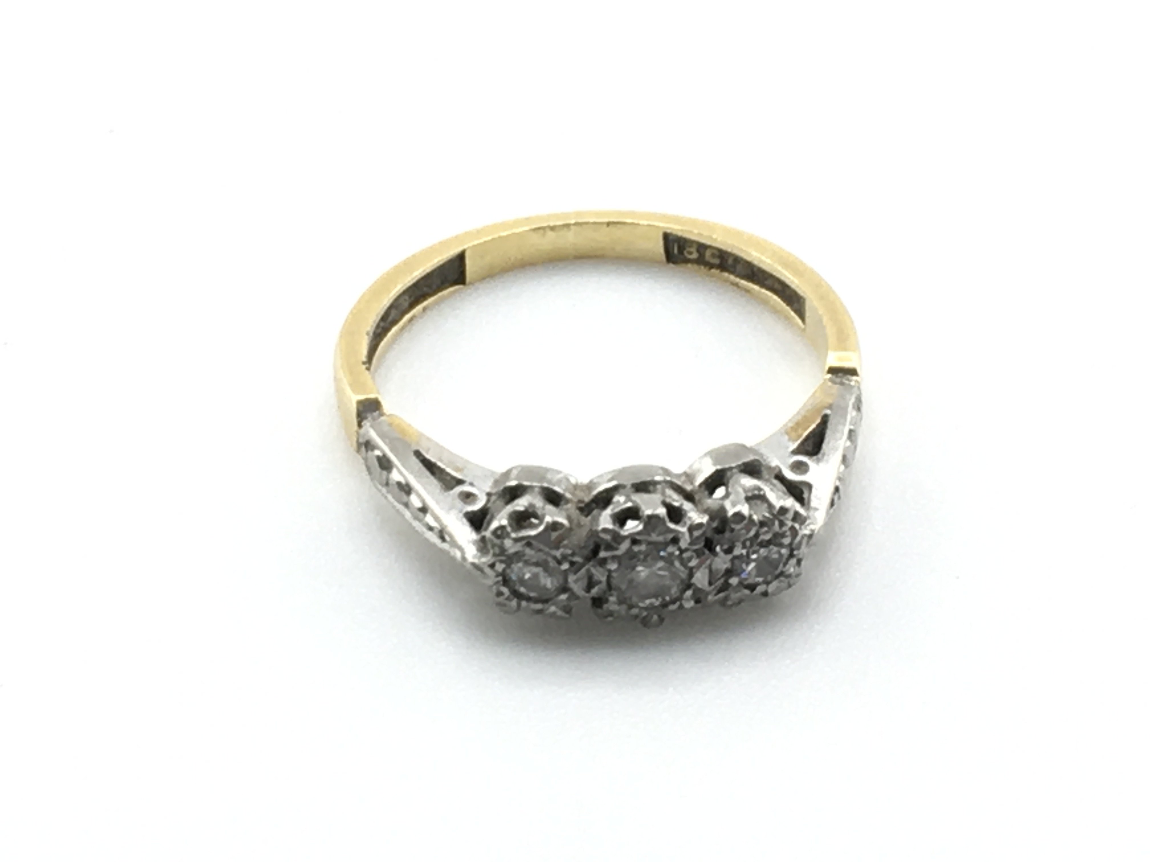 An 18ct gold ring set with three small diamonds. 2.3g and J Postage A