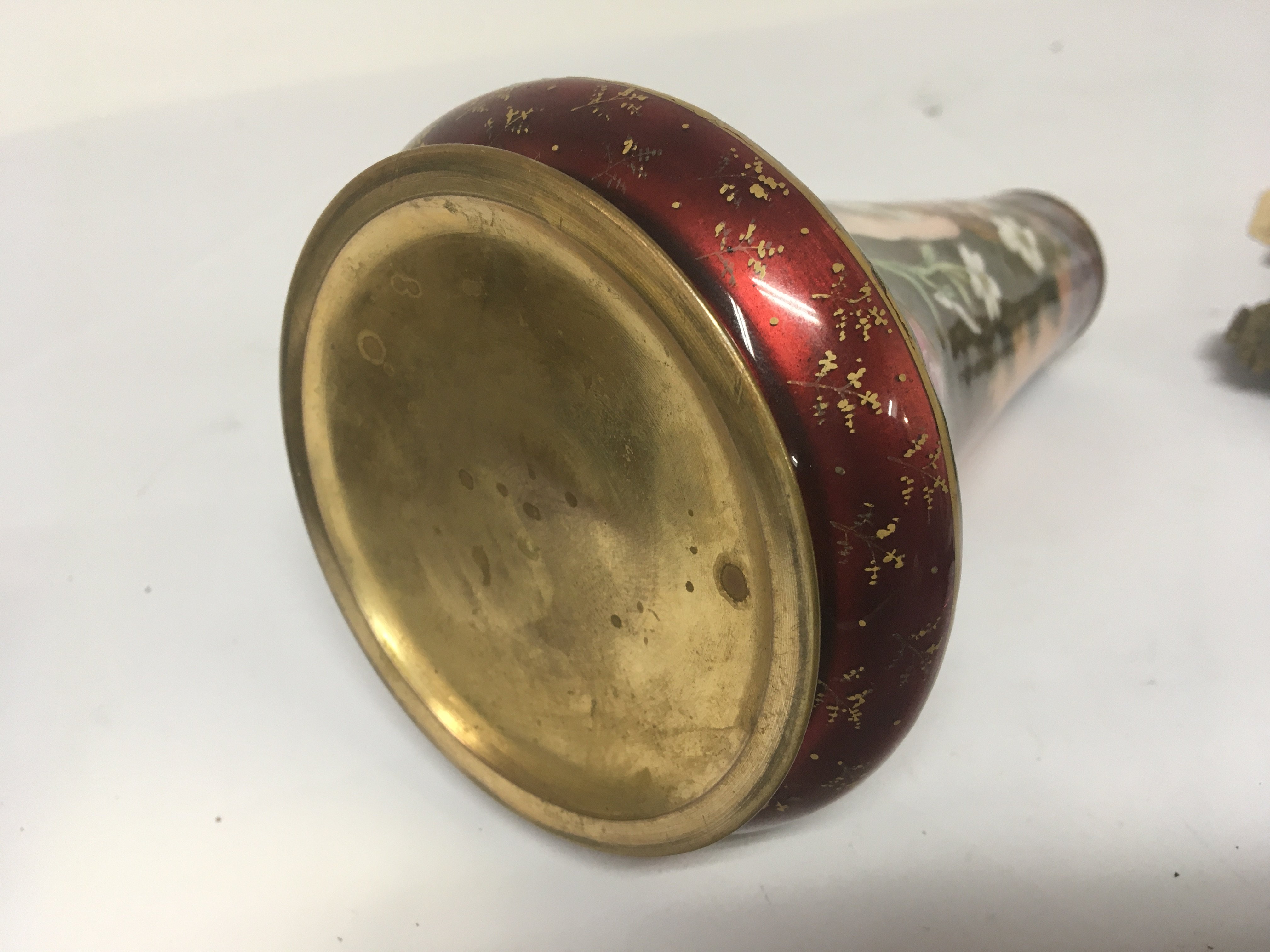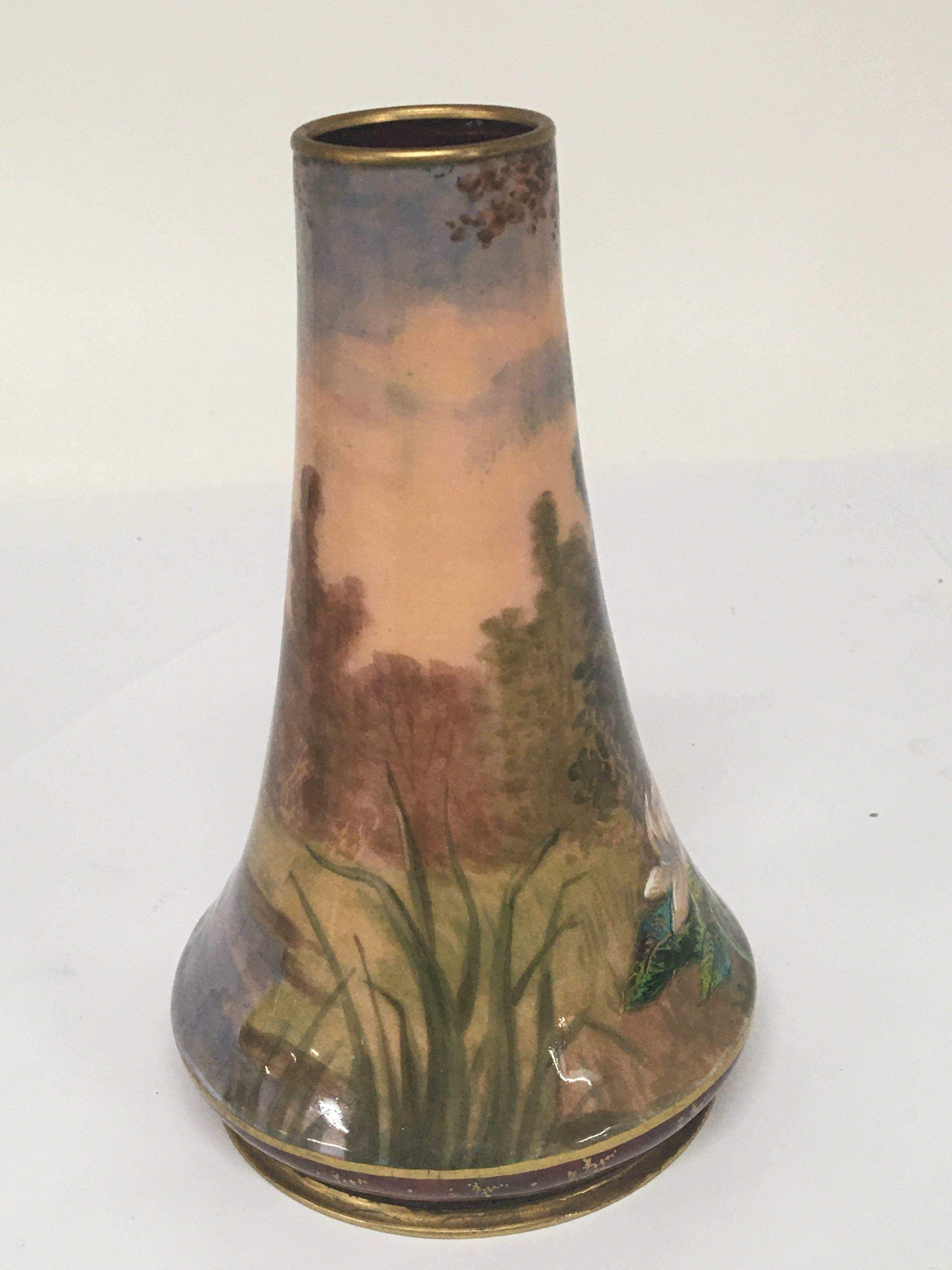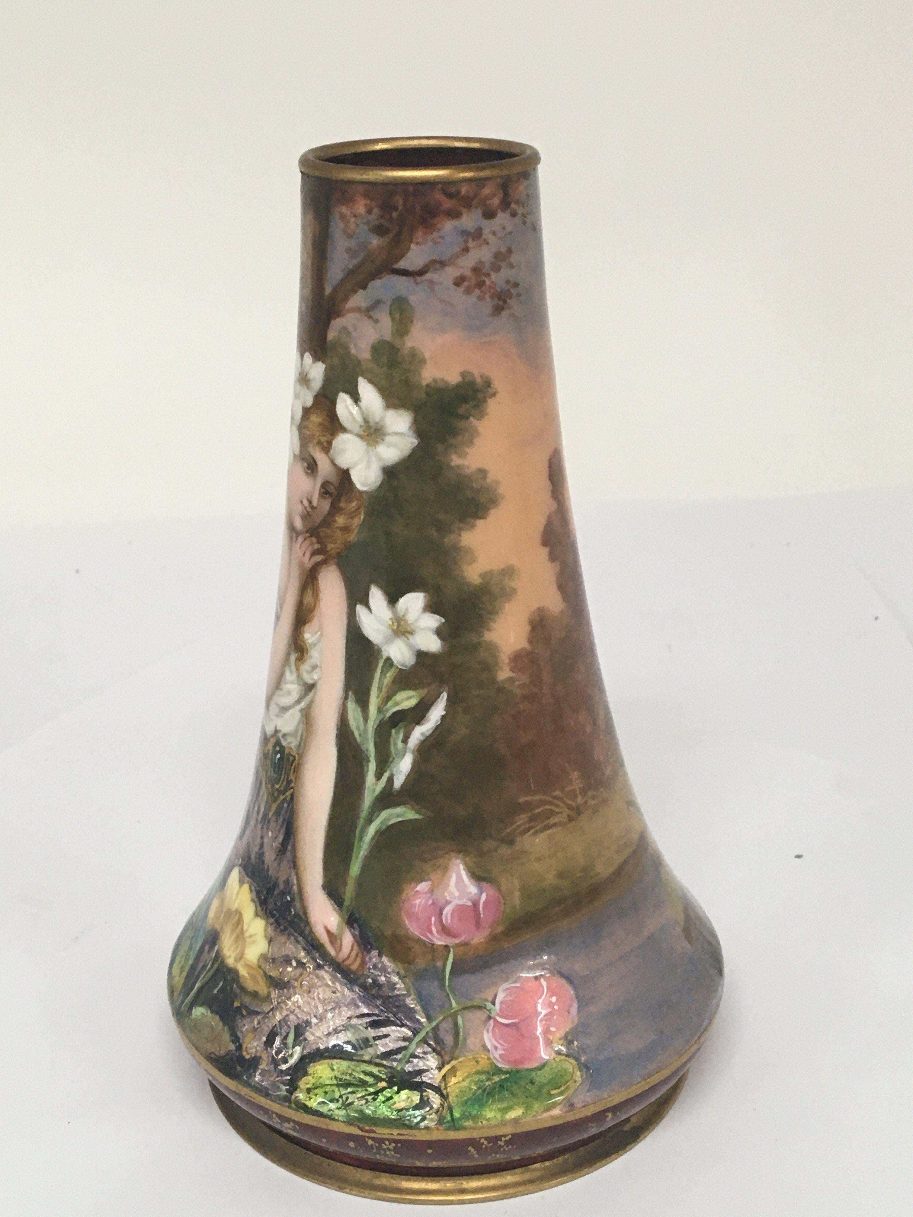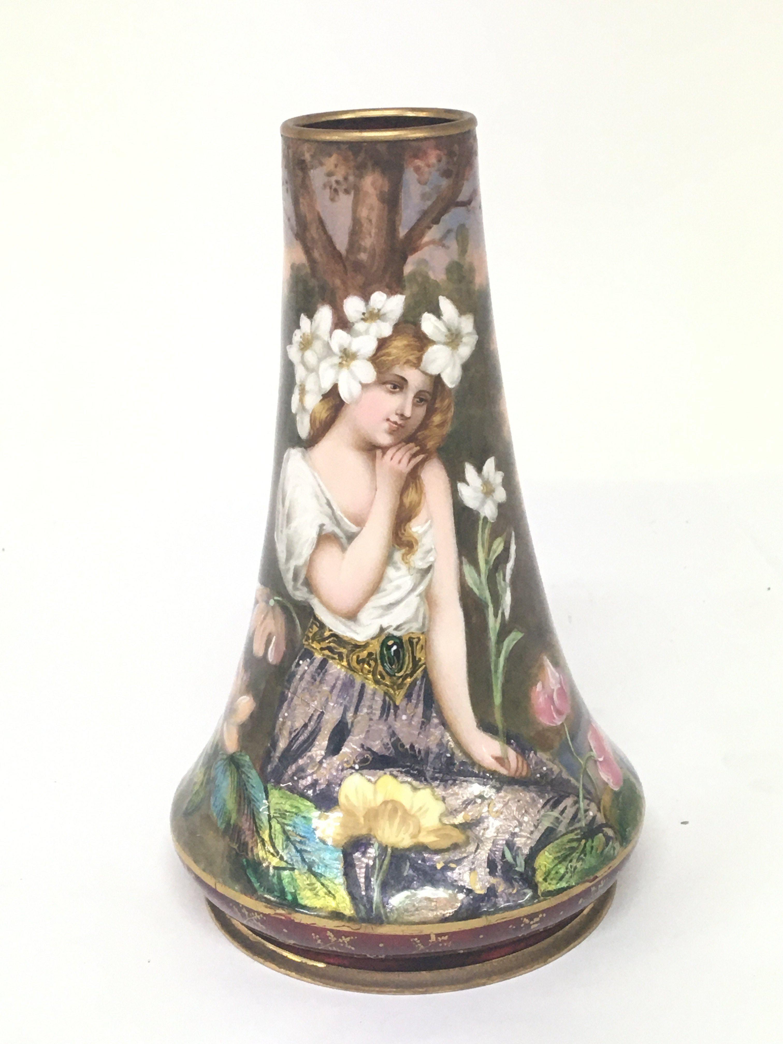 An exceptional quality Art Nouveau Enamel vase depicting a young girl amoungst flowers in a wooded landscape Height 17cm no obvious damage or restoration.