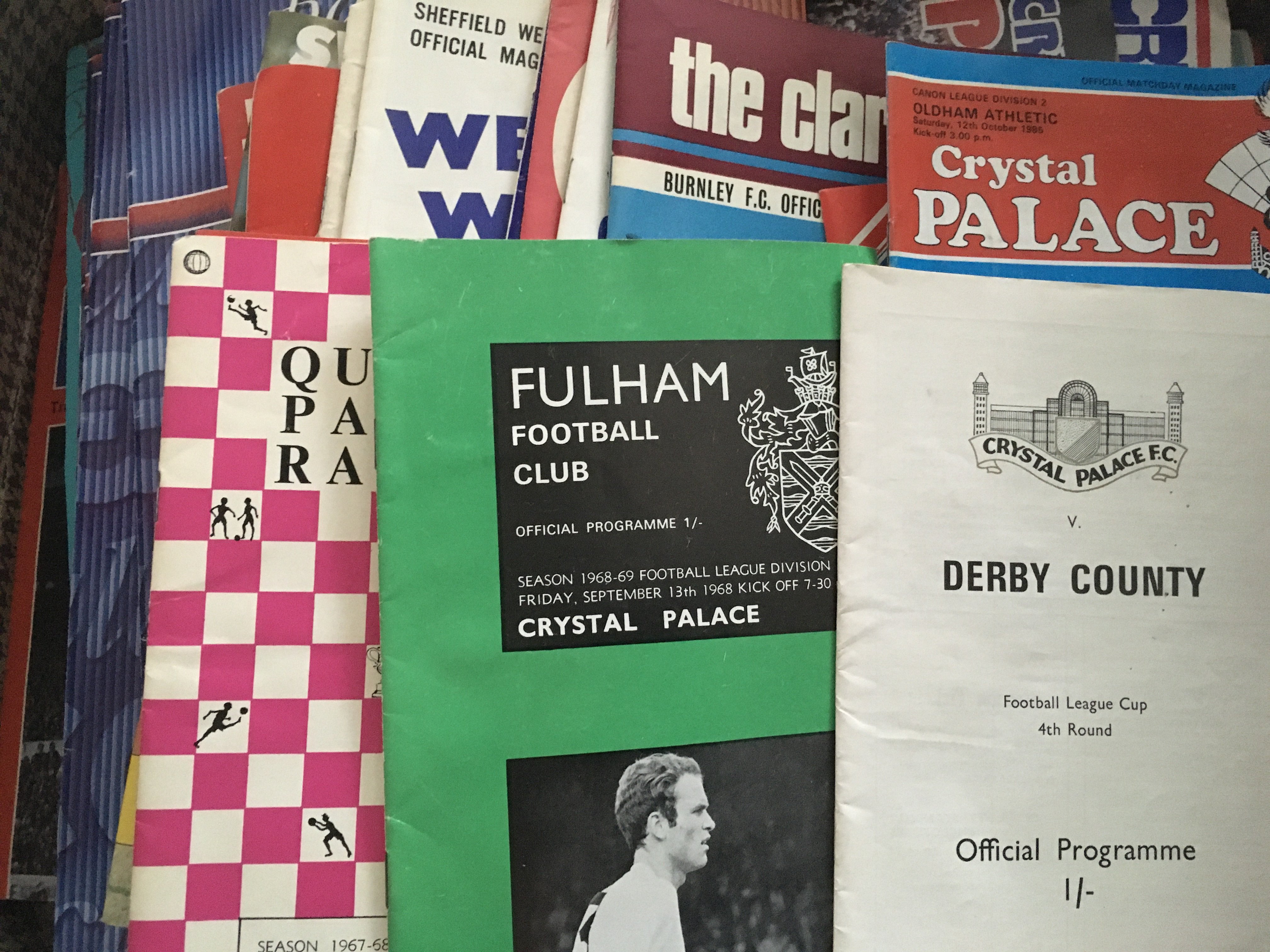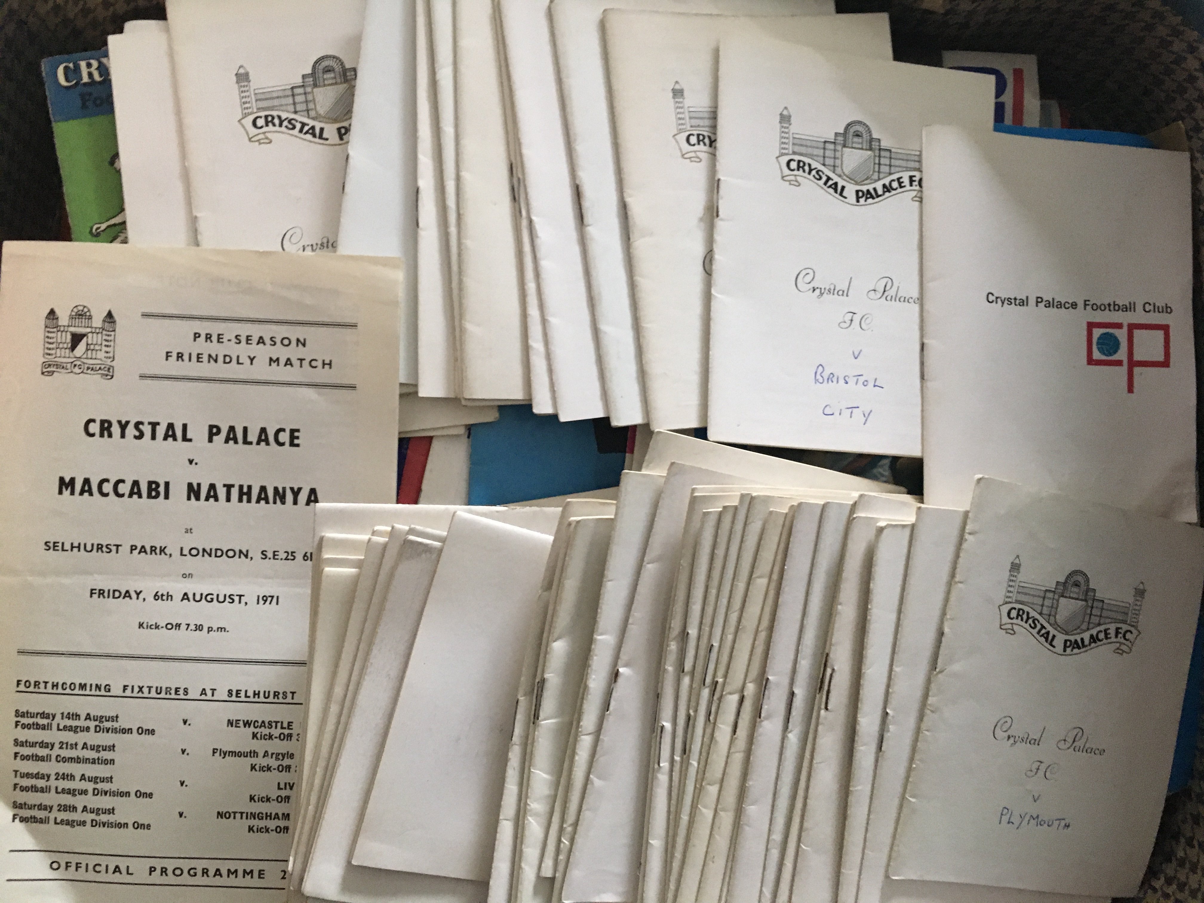 Crystal Palace Football Programmes: Small suitcase of programmes with just over 50 being the small home 60s style version. Mainly good to include a few aways.