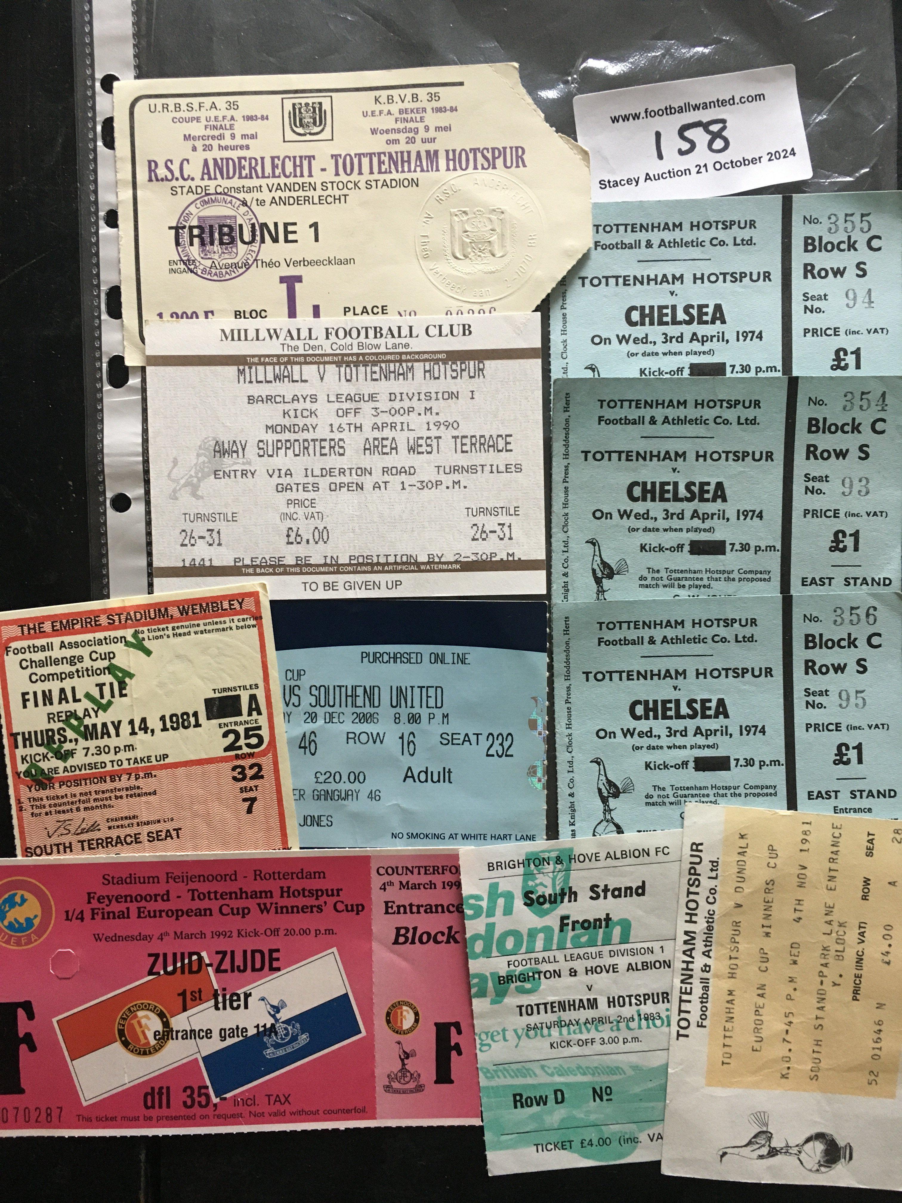 Tottenham Football Tickets: Away matches at Feyenoord 1984 UEFA Cup final, 91/92 quarter final, 82/83 Brighton. 1981 FA Cup Final replay and homes v 73/74 Chelsea x 3, 81/82 Dundalk. Good. (10)