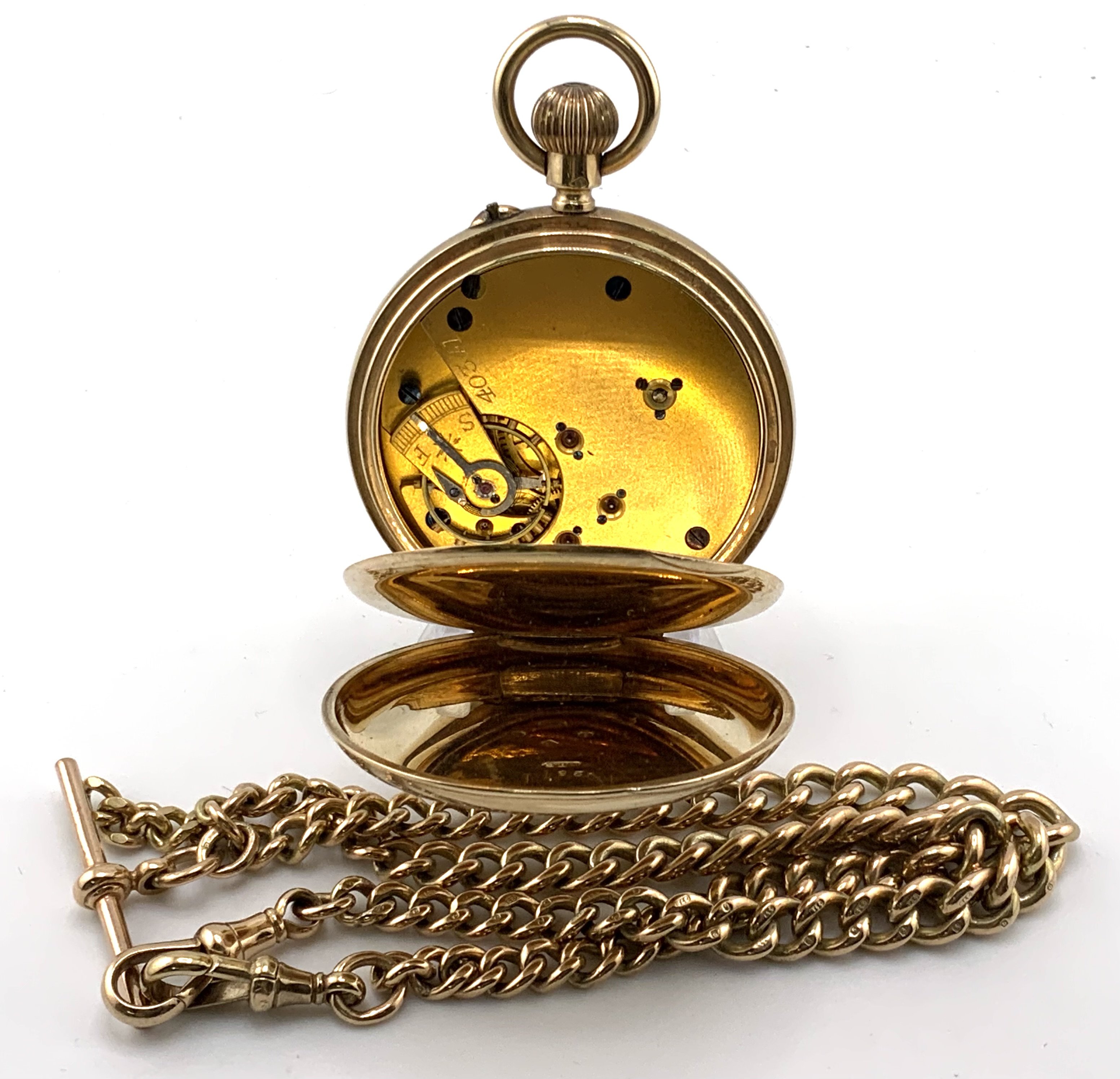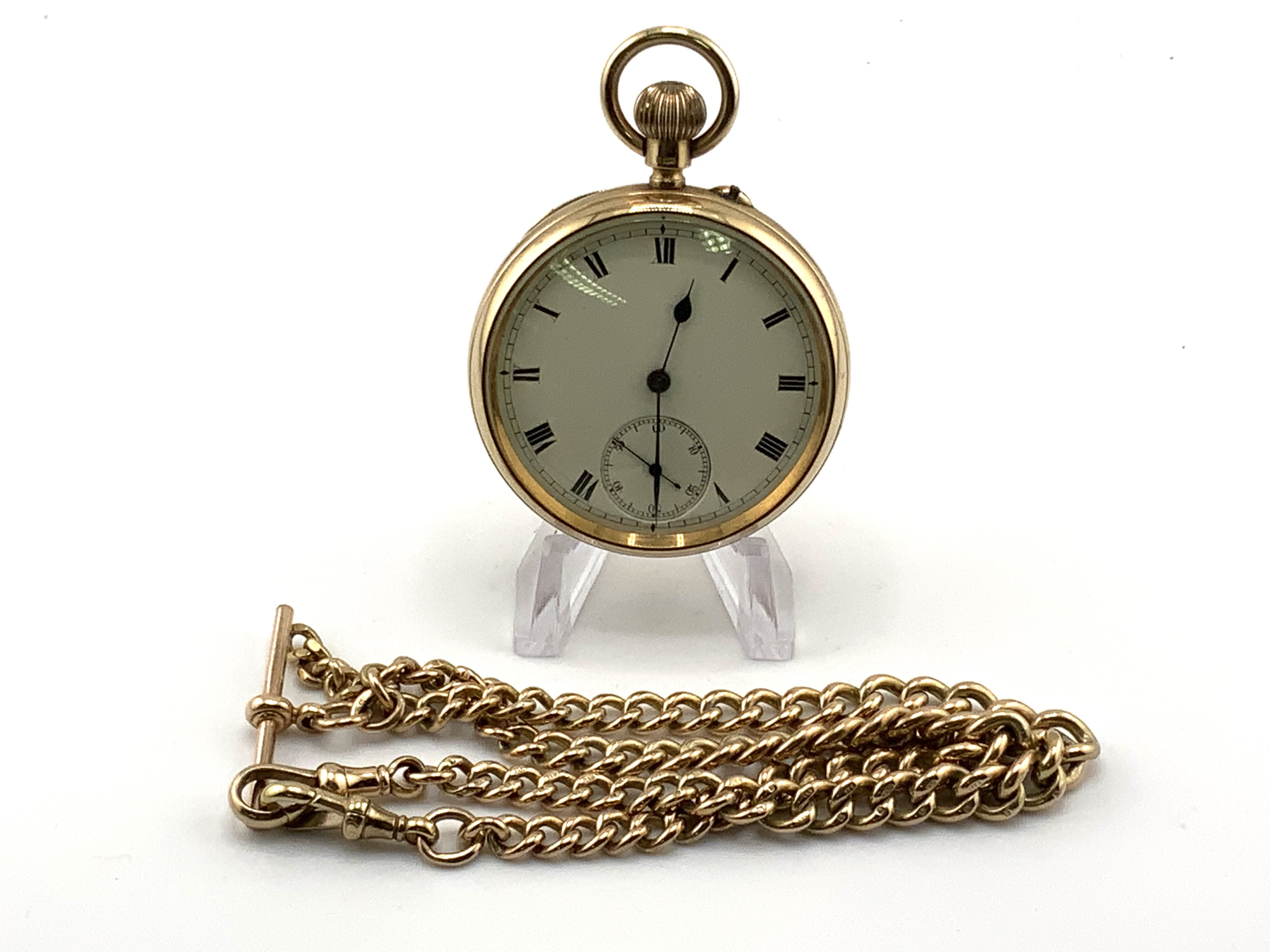 A 9ct gold open faced pocket watch together with a full 9ct gold Albert chain. (Chain 49.48g, Watch 90.13g), seen in working order. (A)