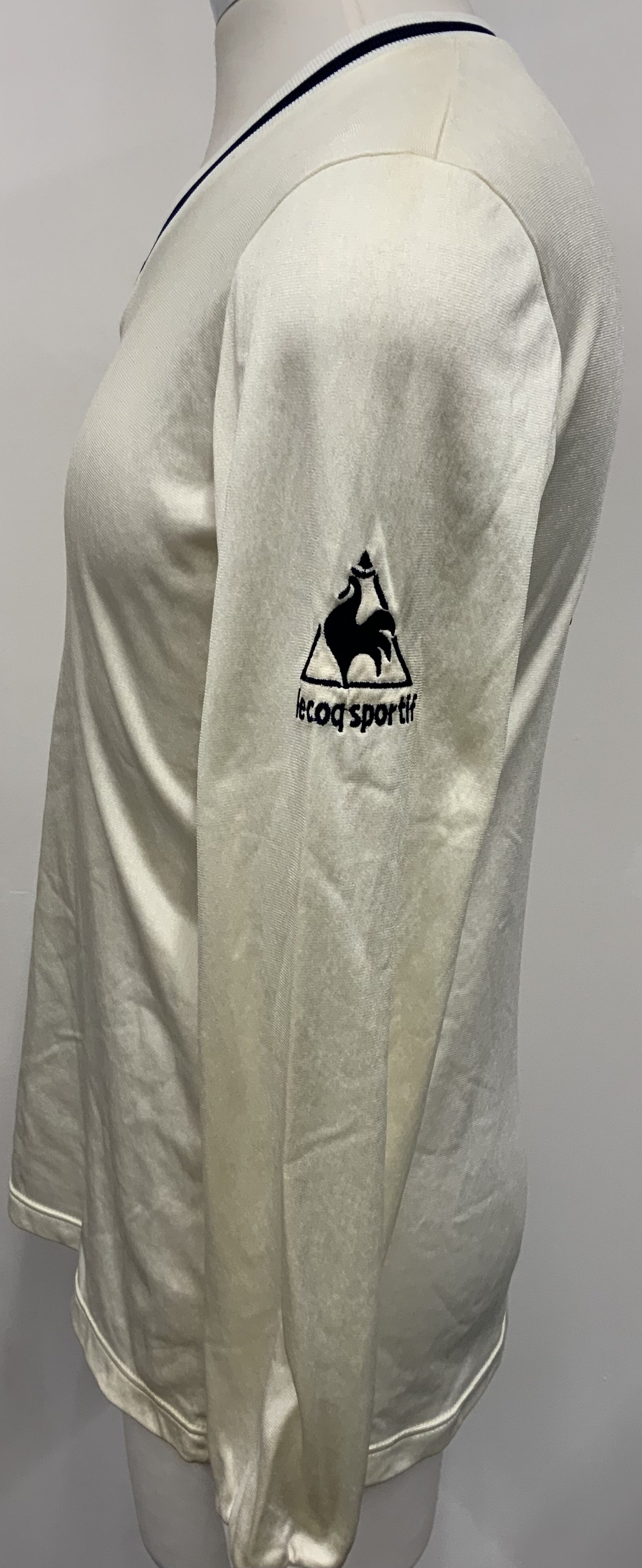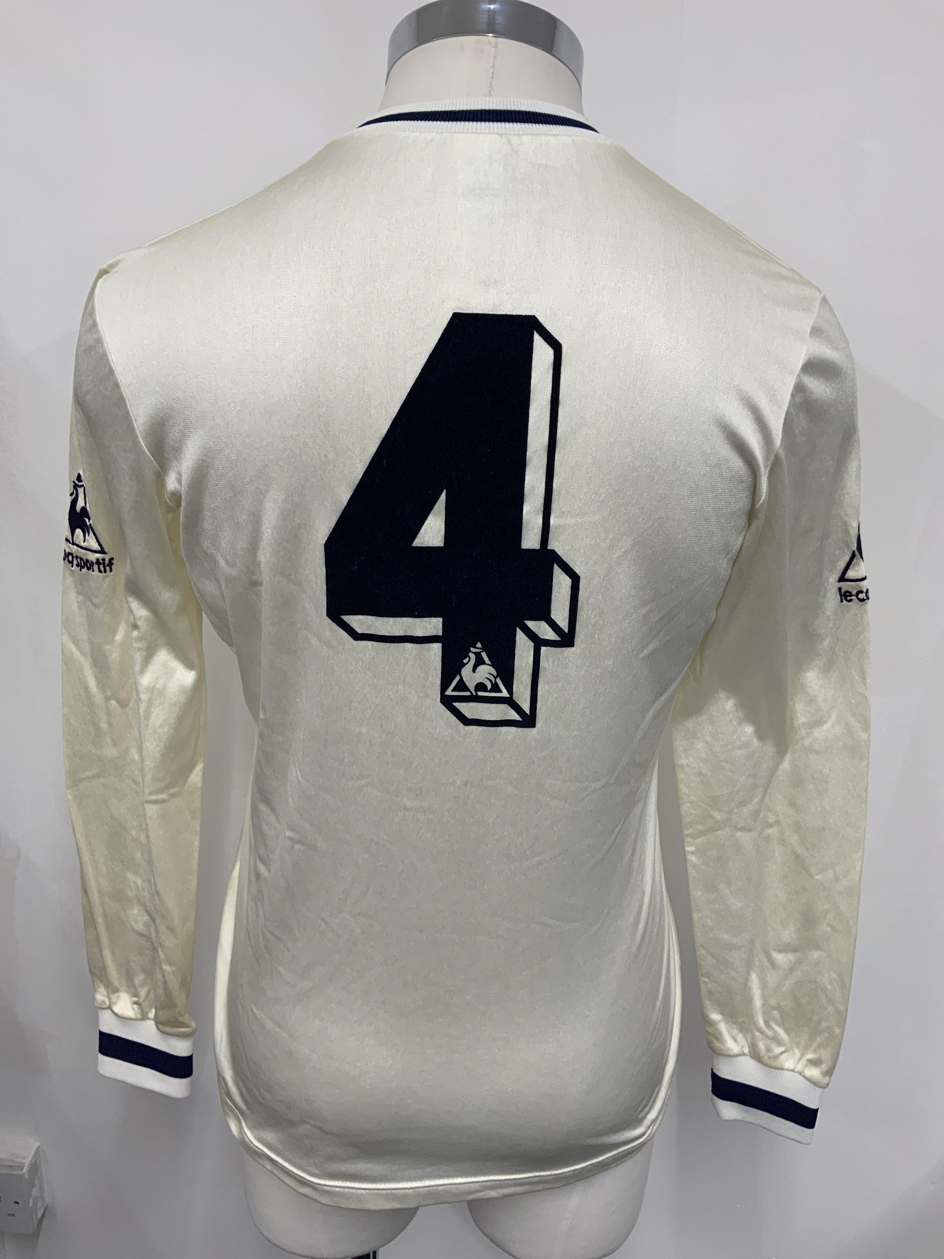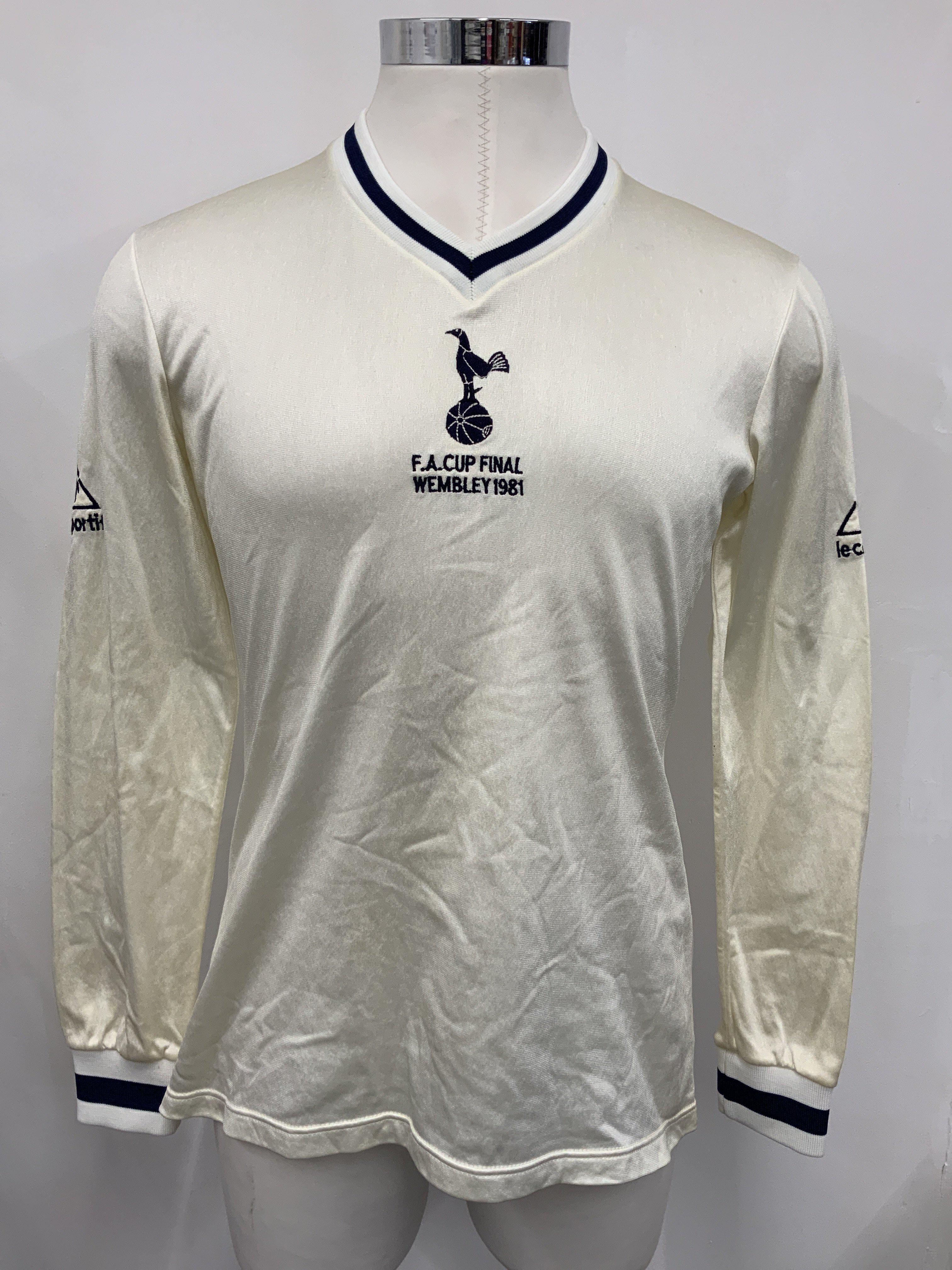 WITHDRAWN Tottenham 1981 FA Cup Final Match Worn Football Shirt: White long sleeve Le Coq De Sportif number 4 shirt. Worn by Graham Roberts in first match v Manchester City. This was the 100th FA Cup Final and Spurs went on to win the cup. Vendor was responsible for shirts and this was washed very hot to remove blood stains. Lucky enough new shirts were made late on for the replay as Le Coq badging was not permitted on the numbers for the replay due to advertising restrictions on tv. We sold another famous FA Cup blood stained shirt from the 1978 semi final in our last auction for 11k.