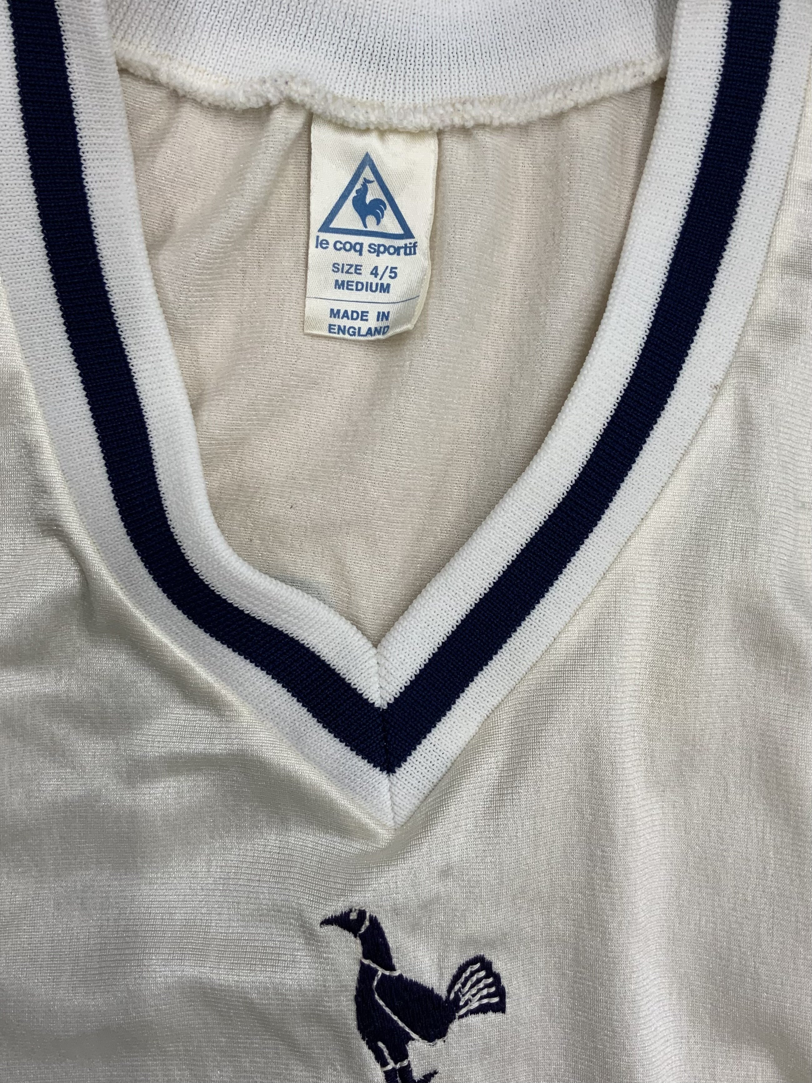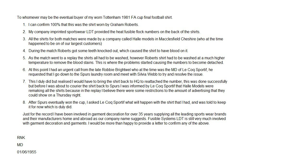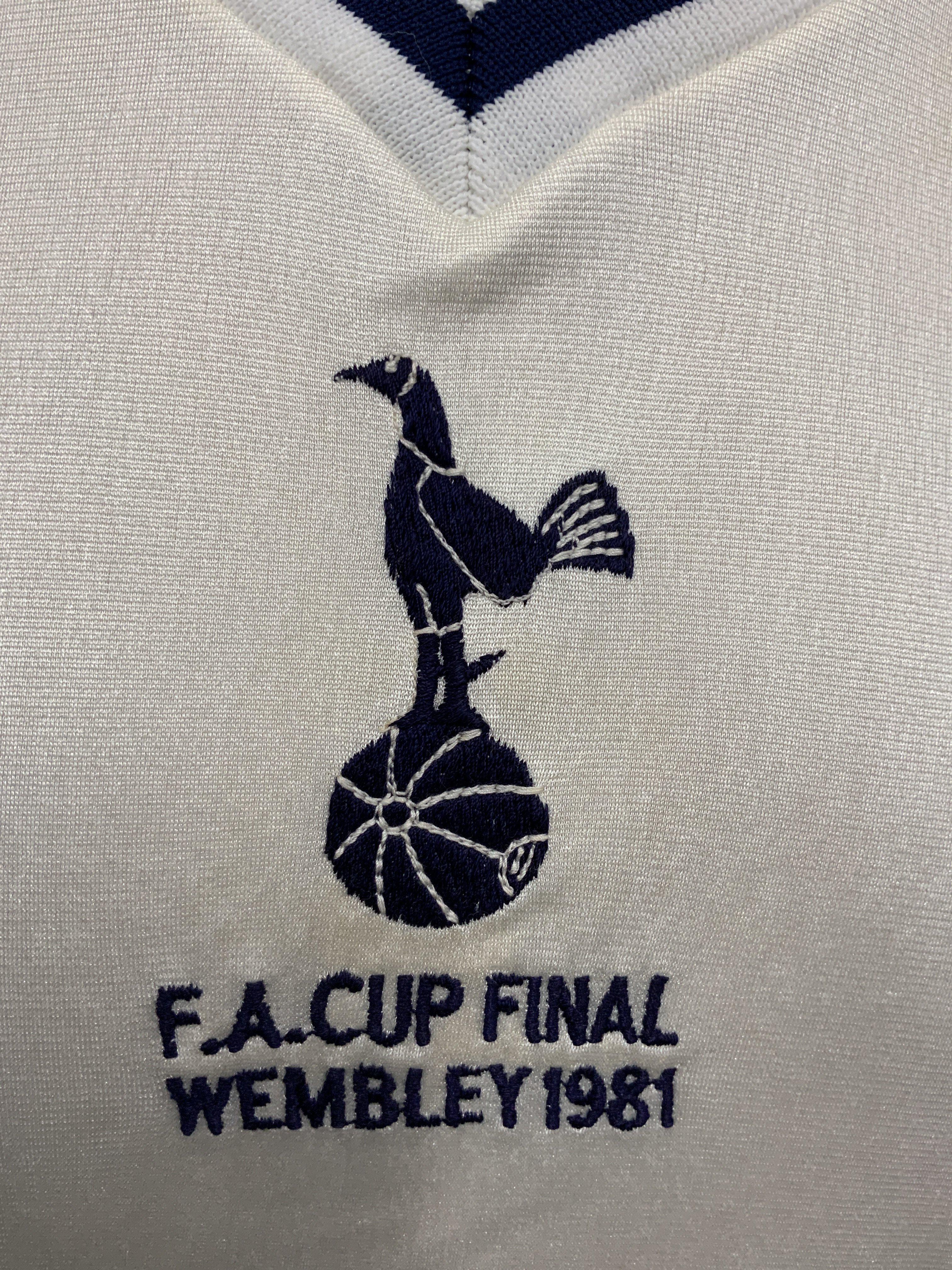 WITHDRAWN Tottenham 1981 FA Cup Final Match Worn Football Shirt: White long sleeve Le Coq De Sportif number 4 shirt. Worn by Graham Roberts in first match v Manchester City. This was the 100th FA Cup Final and Spurs went on to win the cup. Vendor was responsible for shirts and this was washed very hot to remove blood stains. Lucky enough new shirts were made late on for the replay as Le Coq badging was not permitted on the numbers for the replay due to advertising restrictions on tv. We sold another famous FA Cup blood stained shirt from the 1978 semi final in our last auction for 11k.