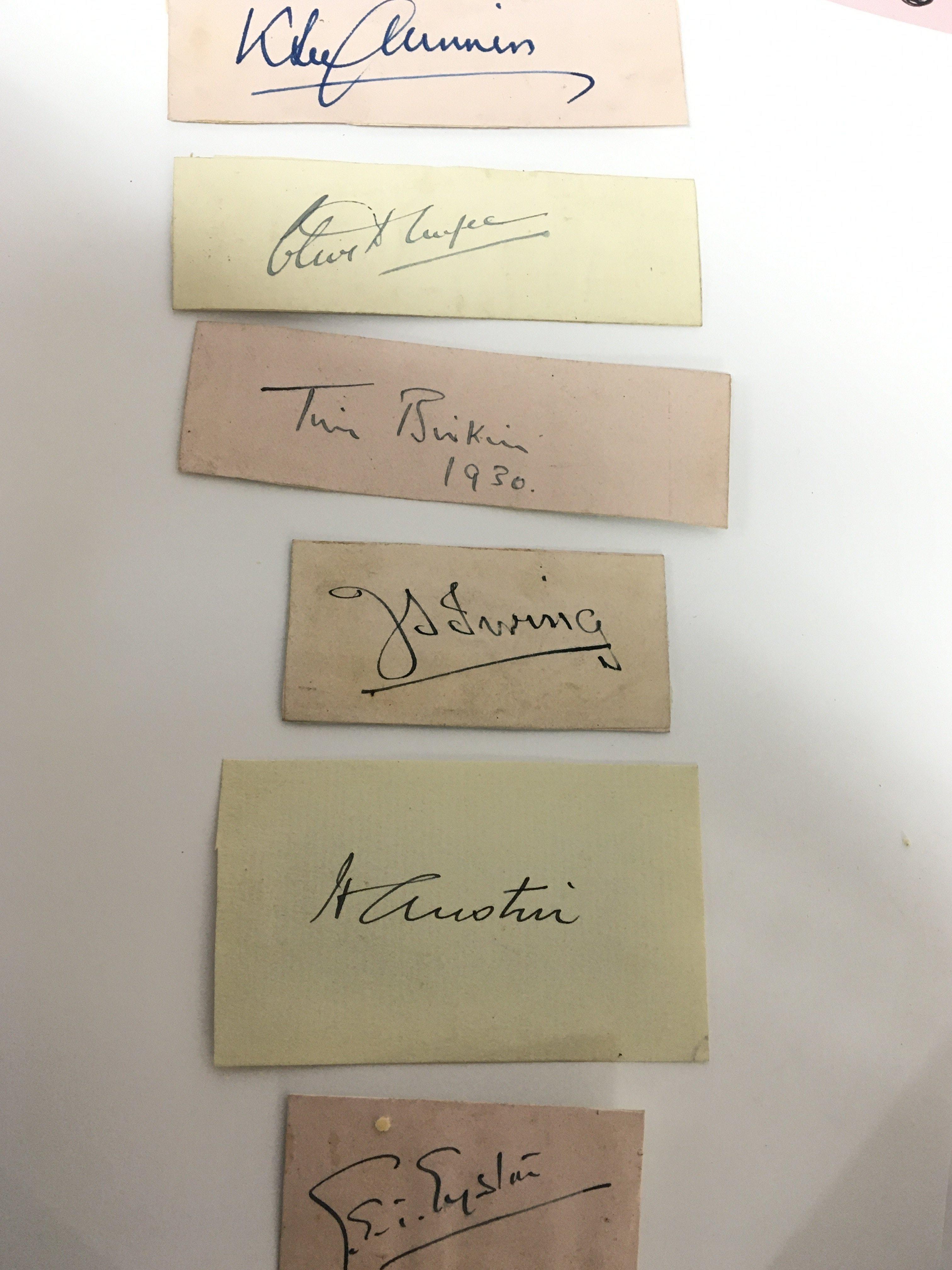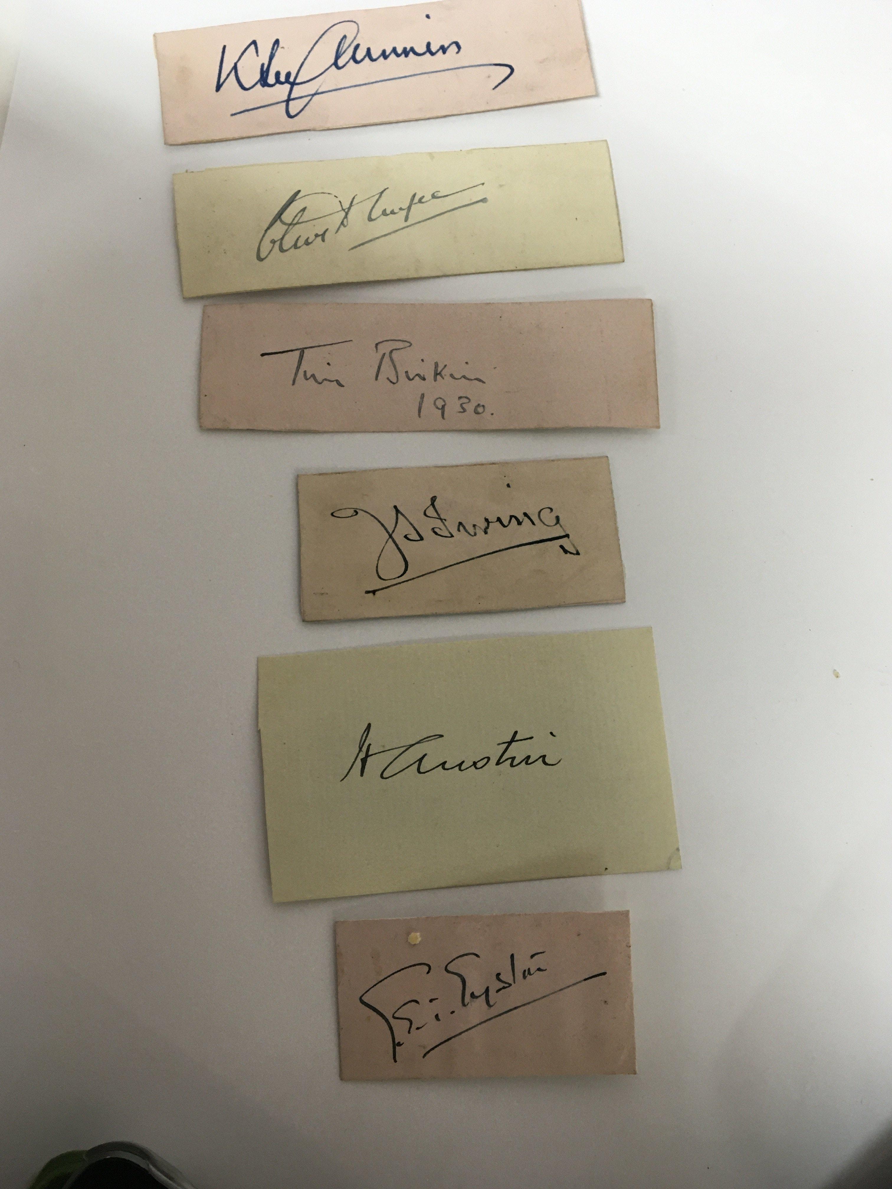 Guaranteed to be authentic signatures Clive Duffee one of the most popular men ever to to Race at Brooklands a member of the Bentley Boys Won several racing motor records. Died on the track at Brooklands 24/09/32 Sir Henry RS “Tim” Birkin millionaire motor racer. Captain J S Irving Motor car designer of the Golden Arrow land speed record car Sir Herbert Austin Baby Austin car manufacturer in Birmingham. K L Guinness another prominent Brooklands racing driver and designer. Captain George Easton Motor Car racer first man to exceed 100mph in a small car many other racing records (6)