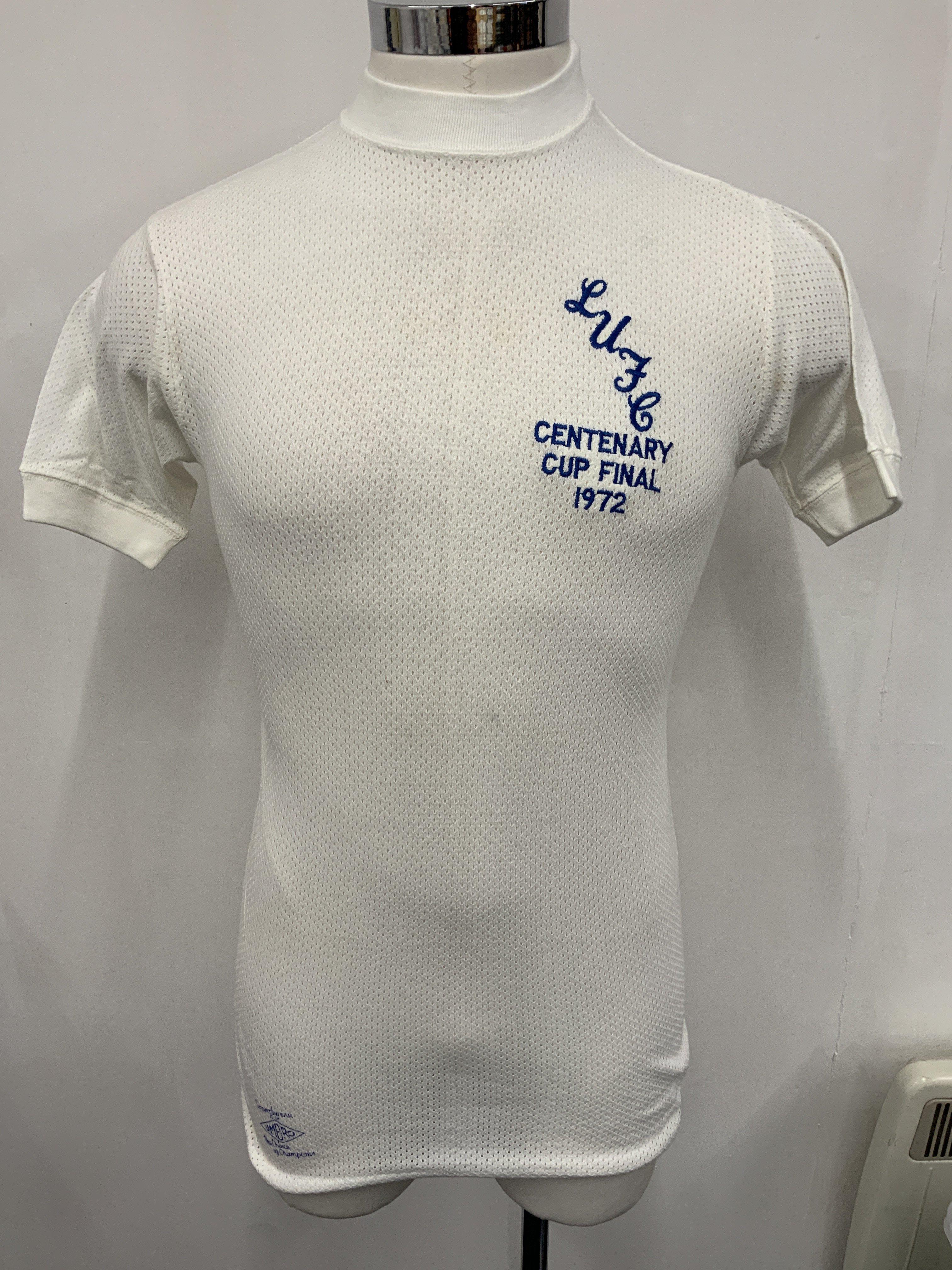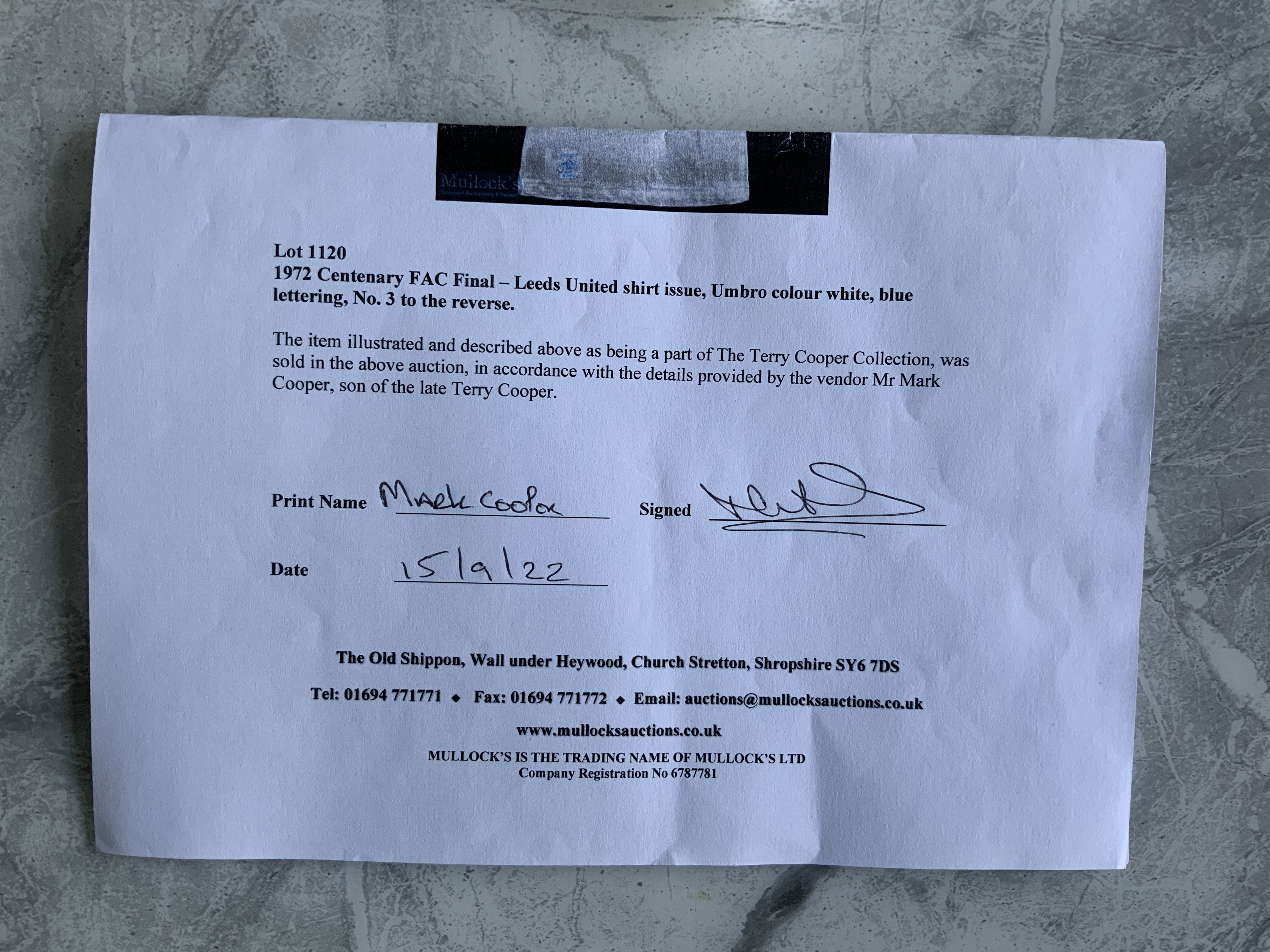 1972 Leeds United FA Cup Final Match Issued Football Shirt: Iconic white short sleeve airtex style shirt with number 3 to rear. LUFC Centenary Cup Final 1972 embroidered to front. Umbro International label to collar. Obtained by Terry Cooper who had played all season at number 3 before breaking his leg in april before the final v Arsenal. Paul Madeley wore a long sleeve number 3 shirt in the final and the short sleeve was given to Cooper. COA signed by Coopers son included. This is the only time Leeds United have won the FA Cup.