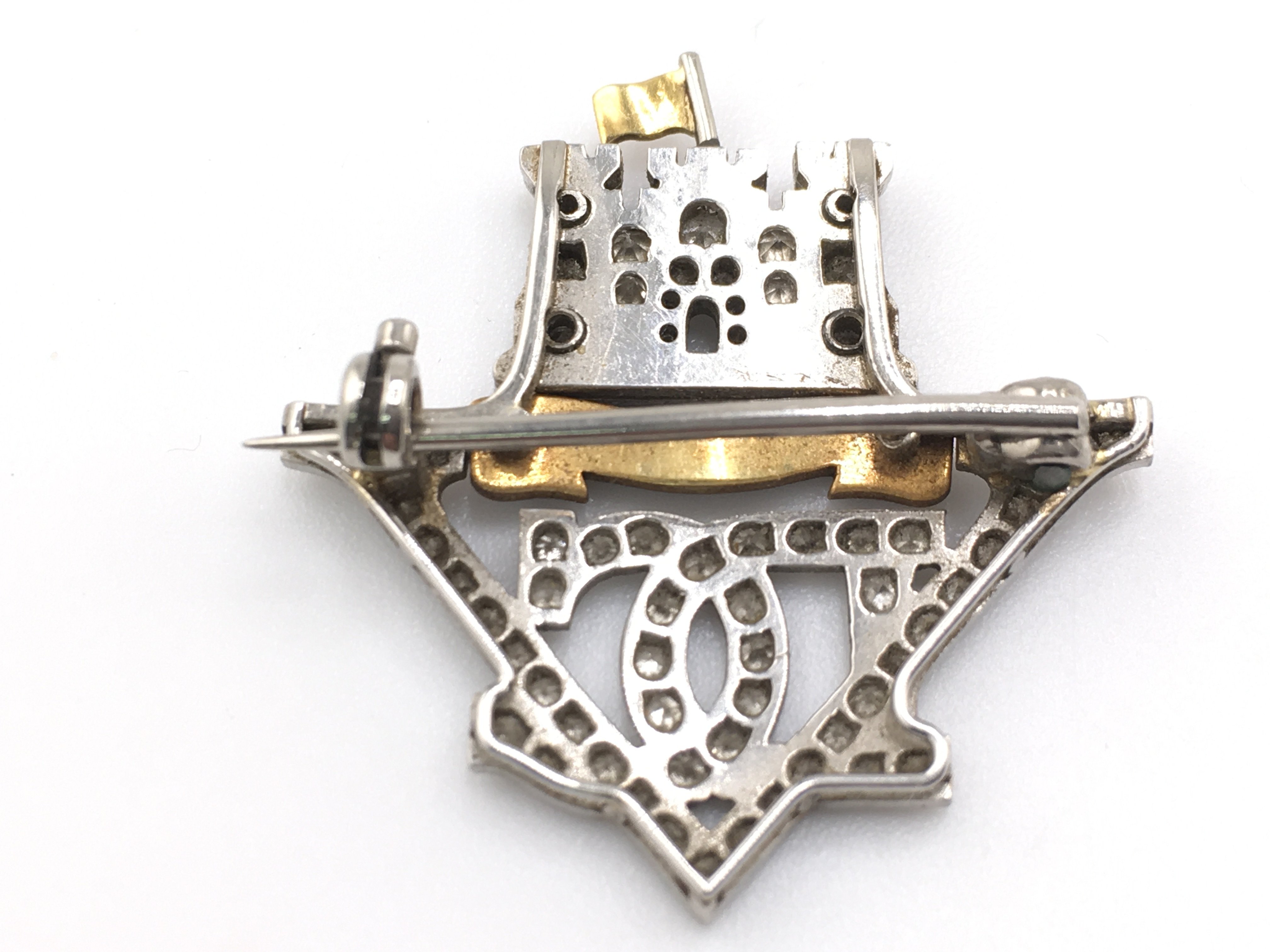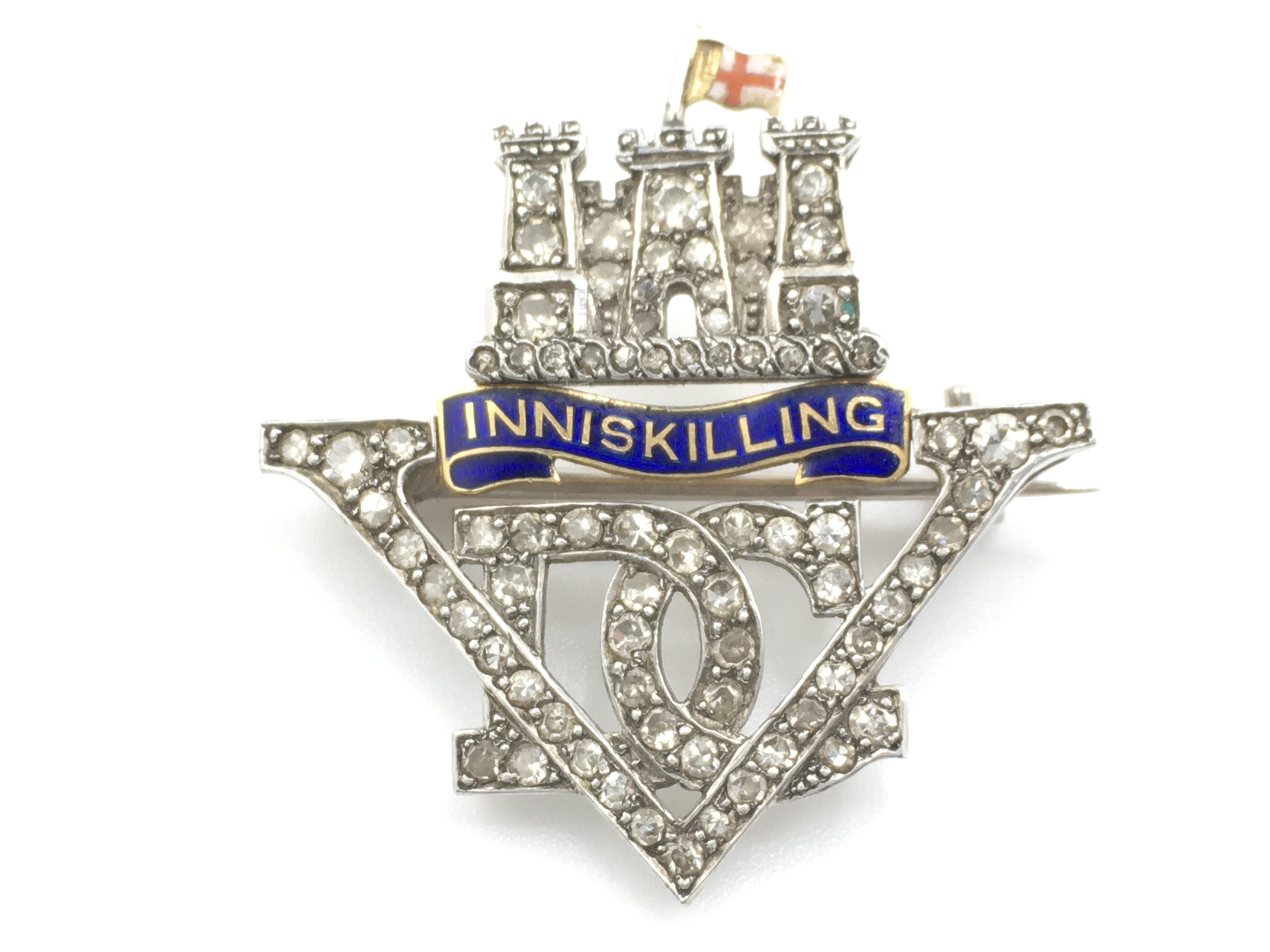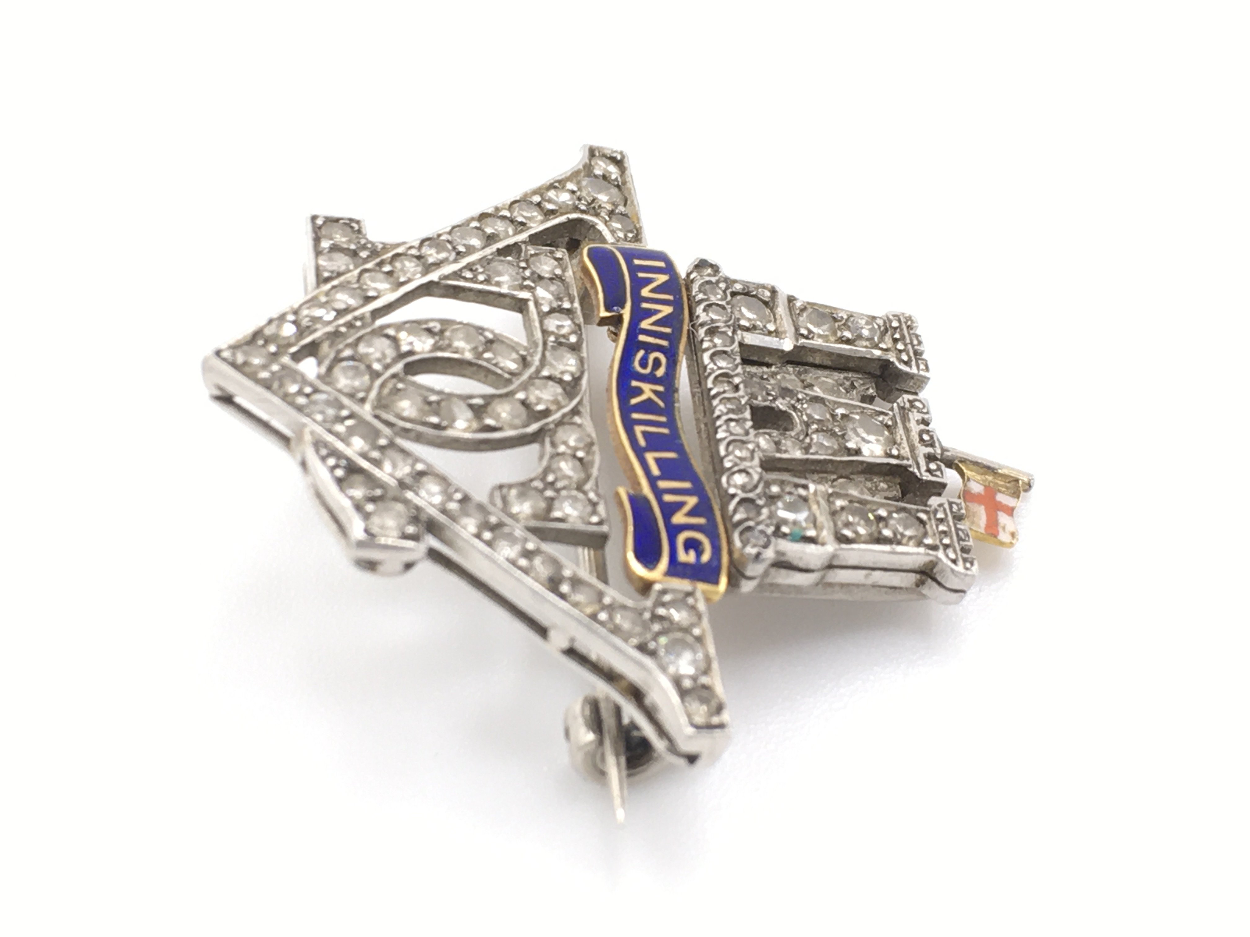 A Diamond and enamel regimental brooch depicting the 5th Inniskilling dragoon guard. Approx 3cm wide.Postage A