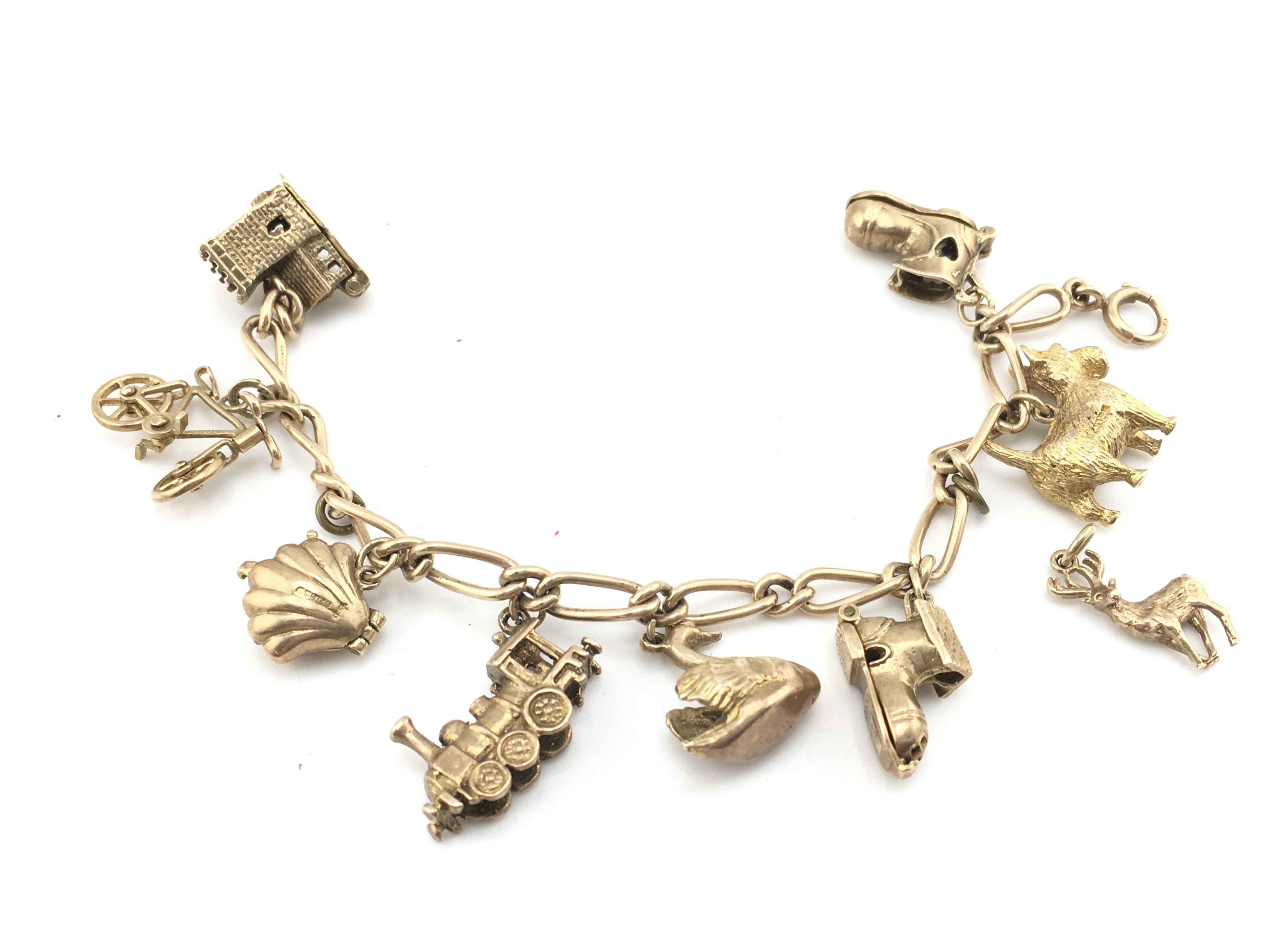A 9ct gold charm bracelet with multiple charms. 40.66gPostage A