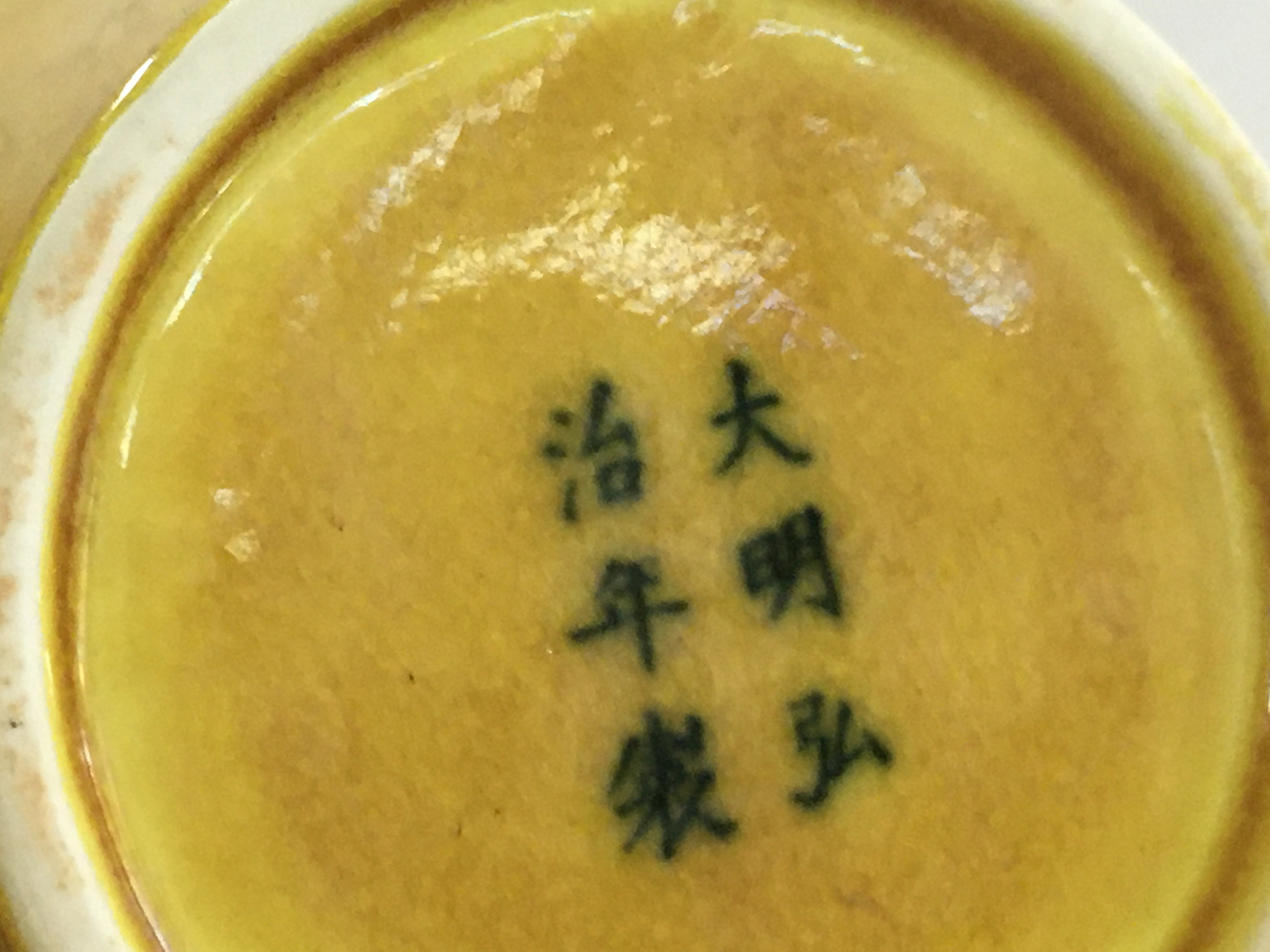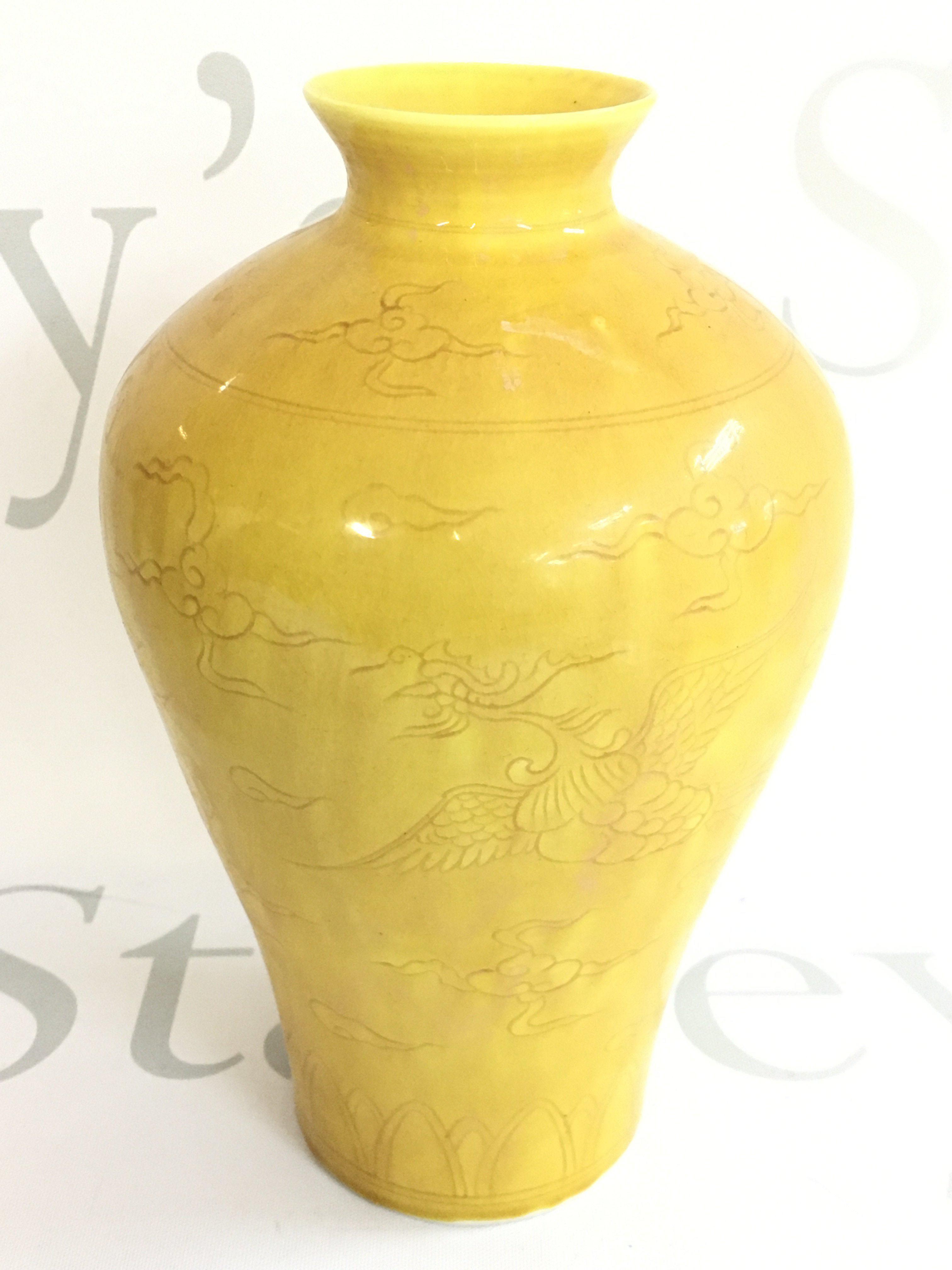 A Chinese yellow glazed vase decorated with Phoenix, 17.5cm tall. Six figure mark on base. No obvious or damage. This lot cannot be posted