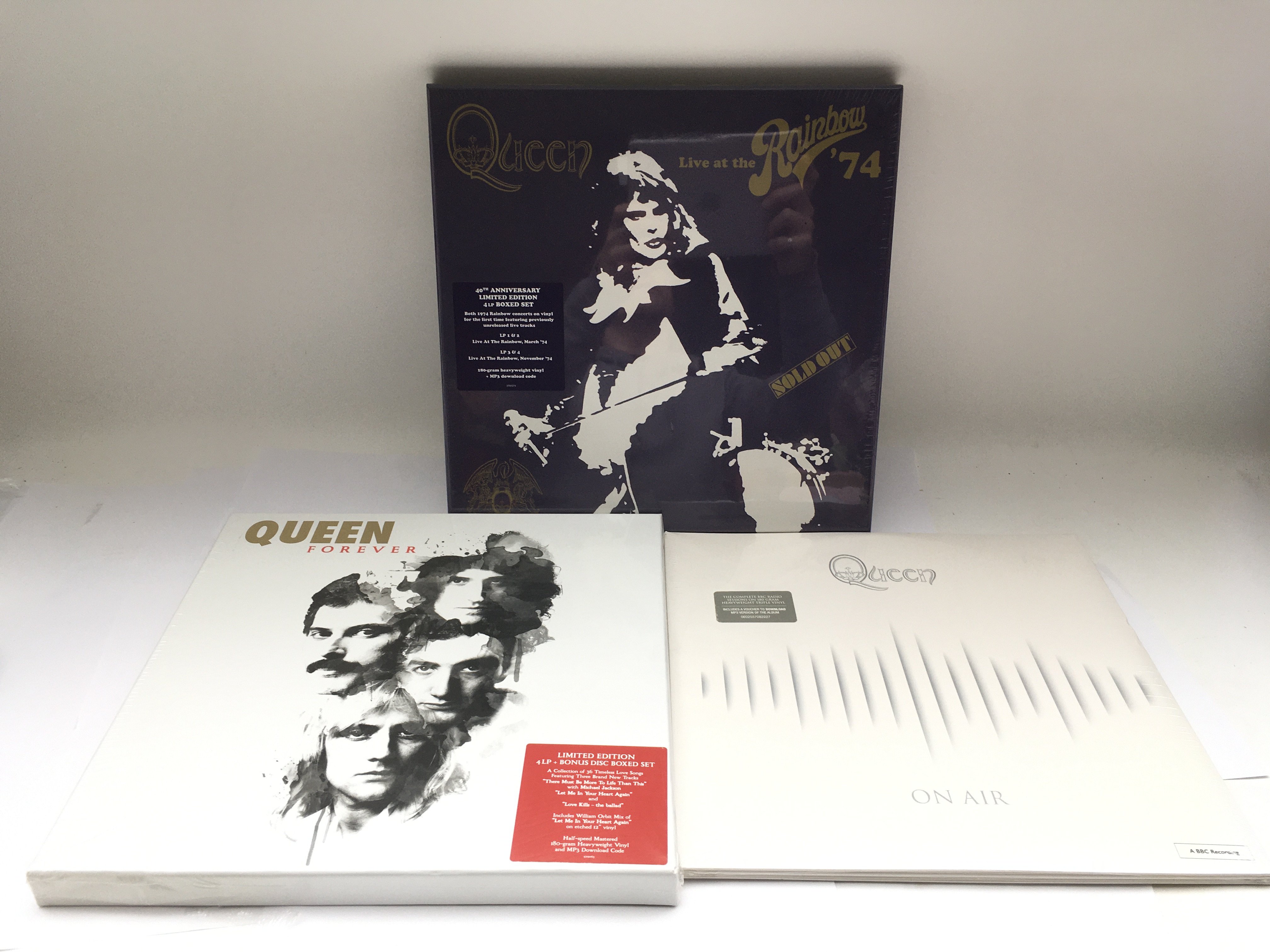 Three sealed and mint Queen vinyl box sets comprising 'Forever', 'Live At The Rainbow 74' and 'On Air'.