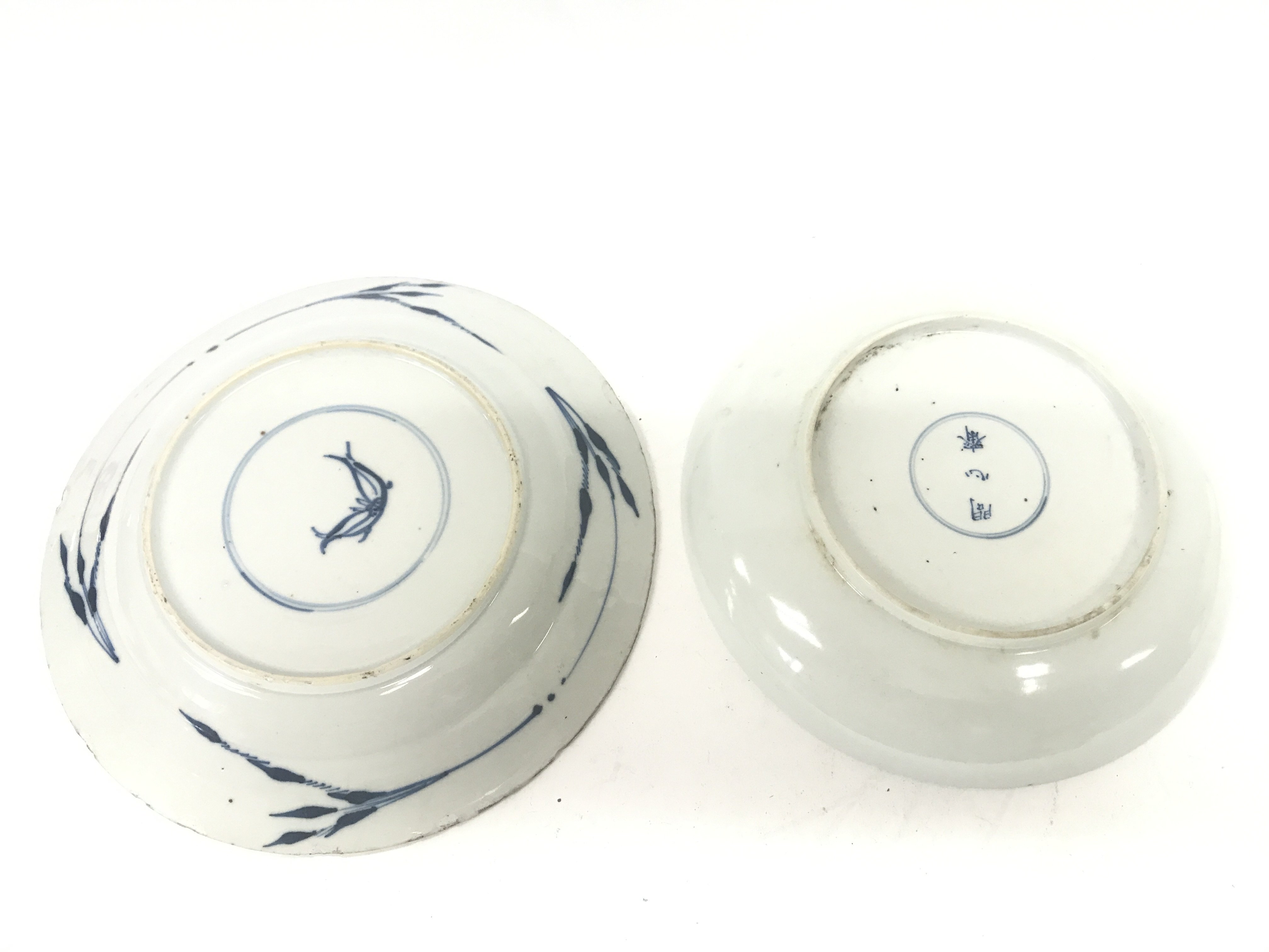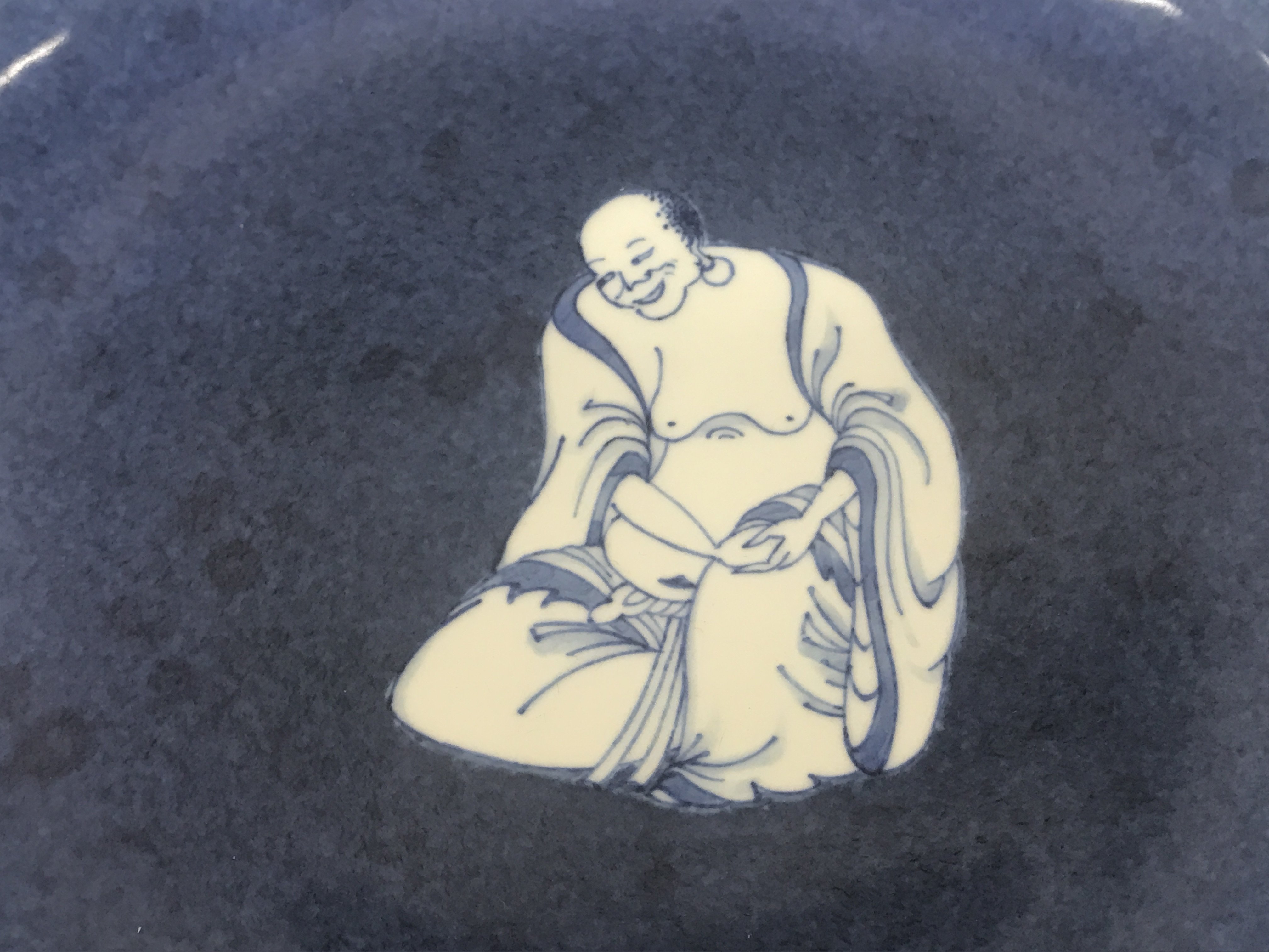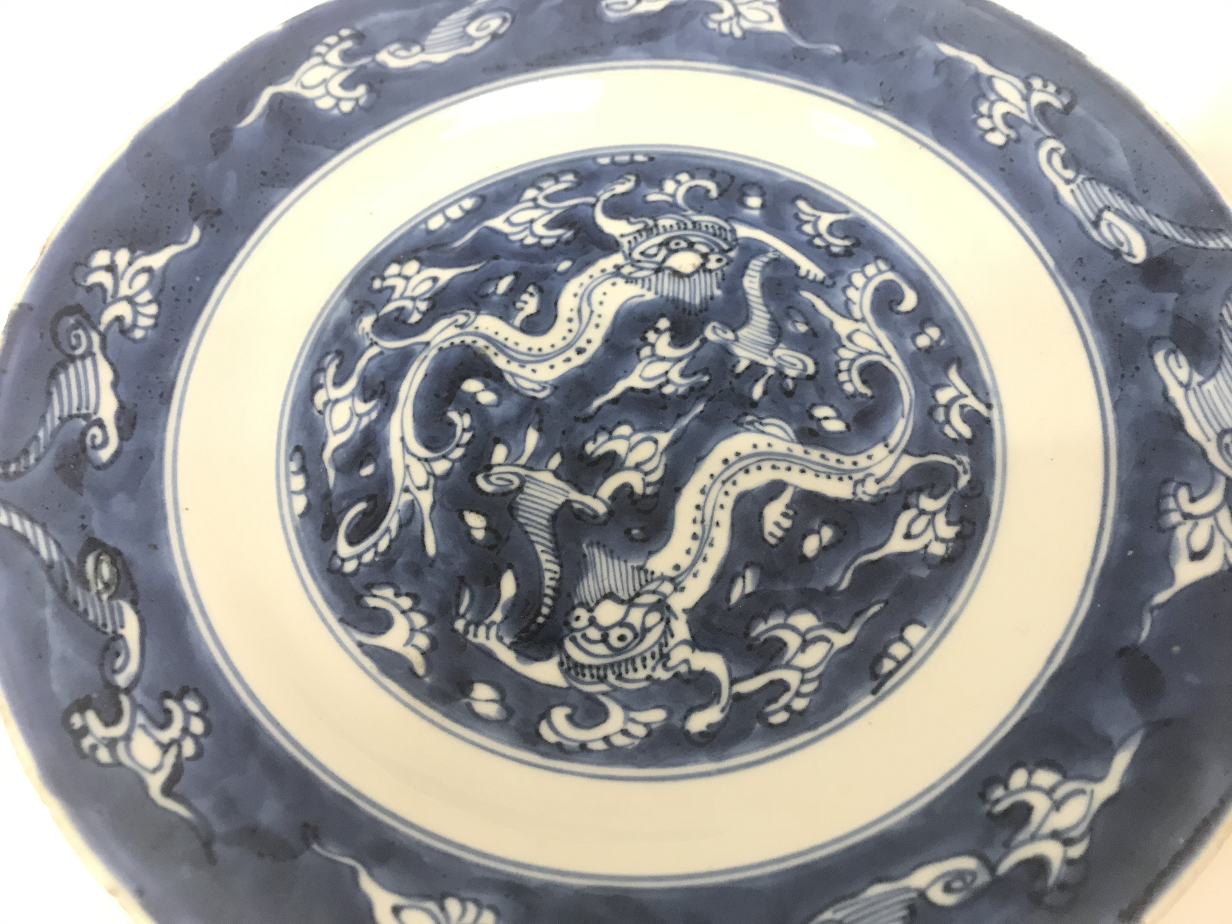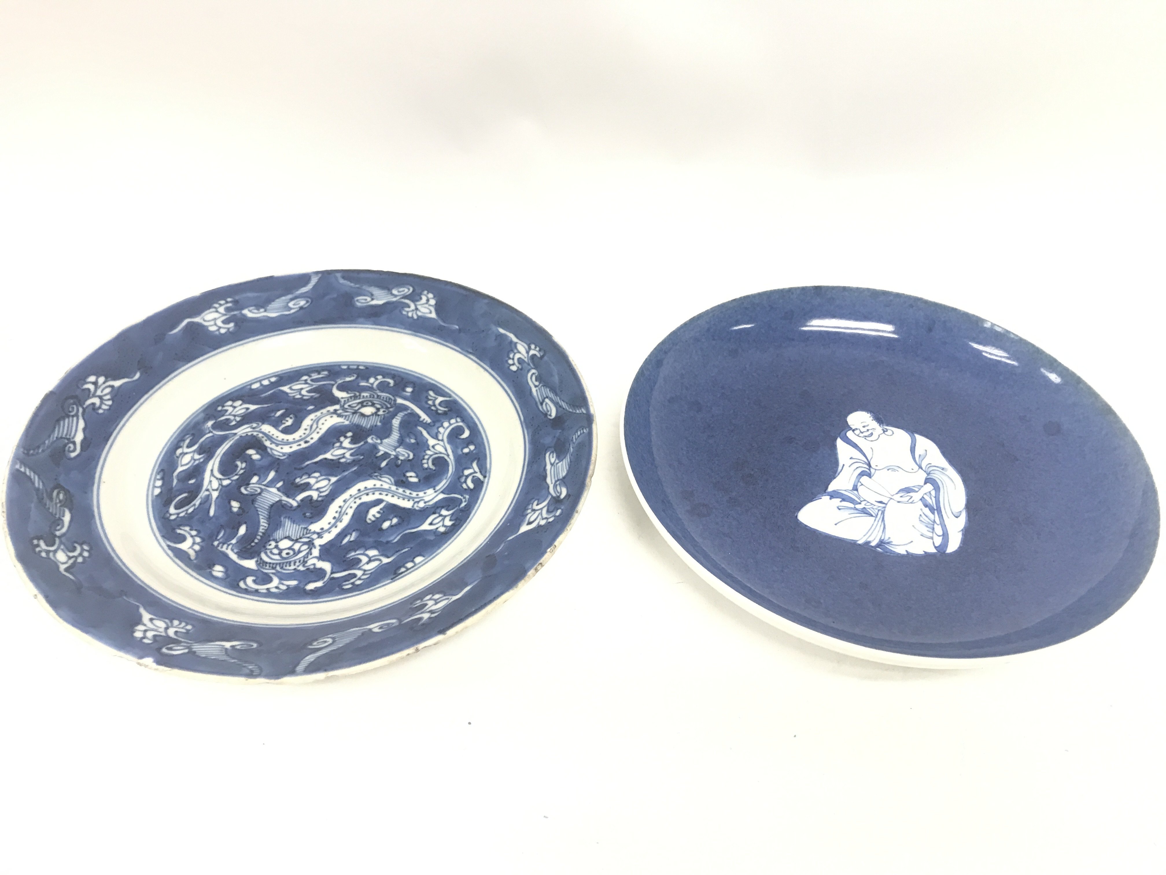 Chinese blue and white dishes including a dragon dish and a Budai Dish. 19 and 21cm wide. This lot cannot be posted